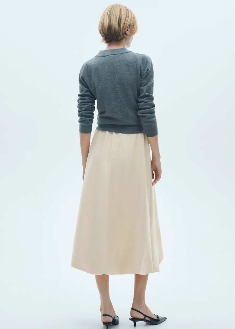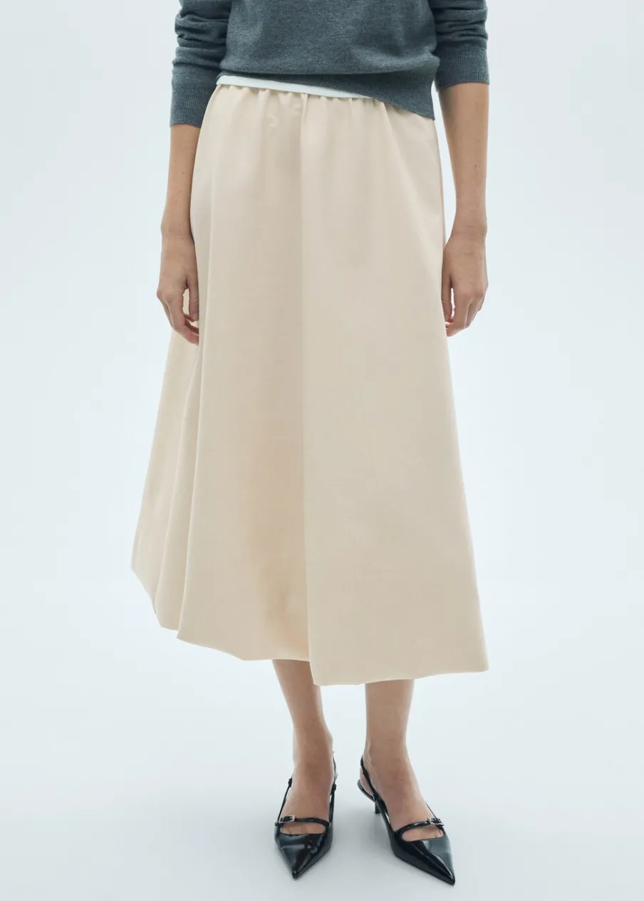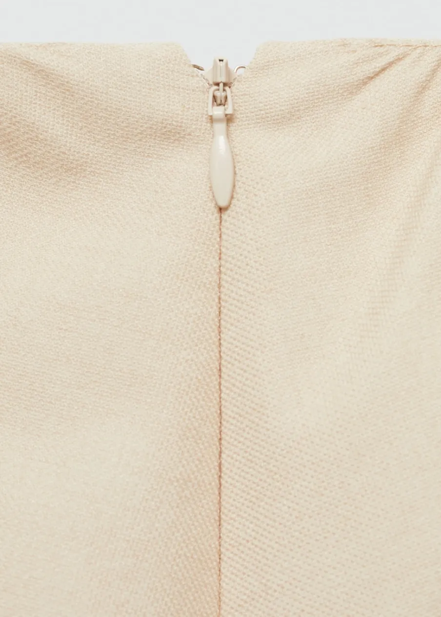 Lejąca tkanina. Średni stan. Model evasé. Krój do kolan. Kryte zapięcie na zamek z boku. Marszczona tekstura. Modelka ma 181 cm wzrostu i nosi rozmiar S/36.
