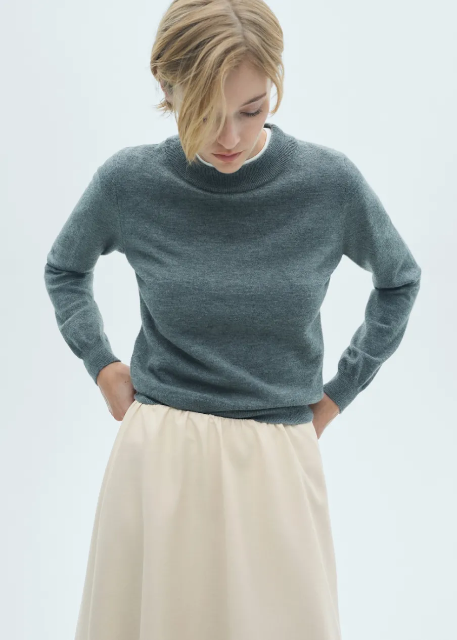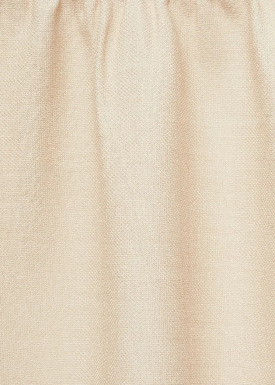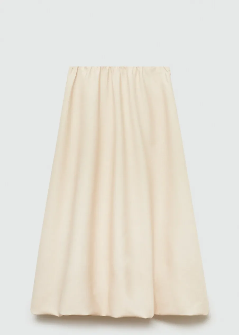 Lejąca tkanina. Średni stan. Model evasé. Krój do kolan. Kryte zapięcie na zamek z boku. Marszczona tekstura. Modelka ma 181 cm wzrostu i nosi rozmiar S/36.