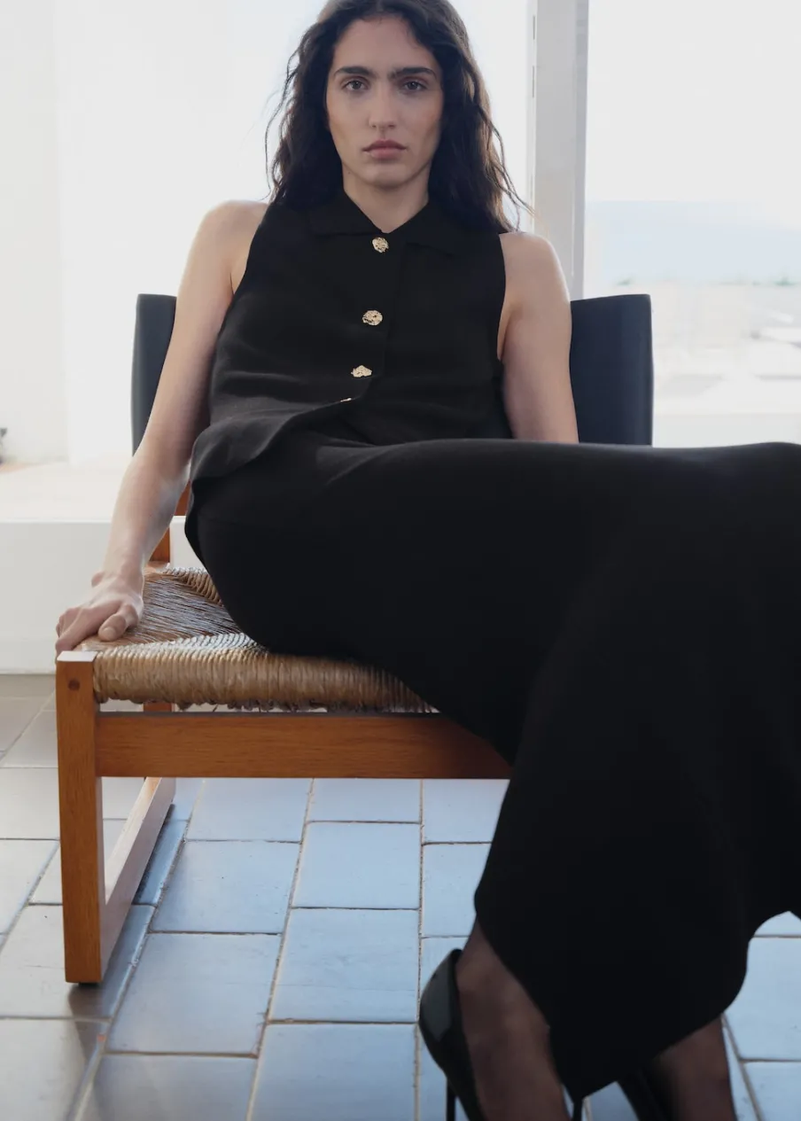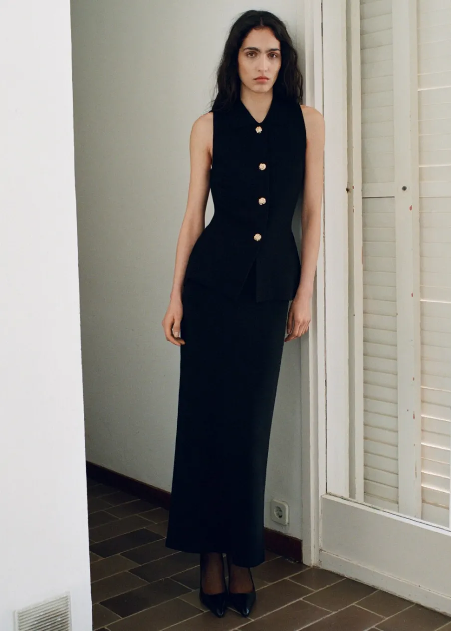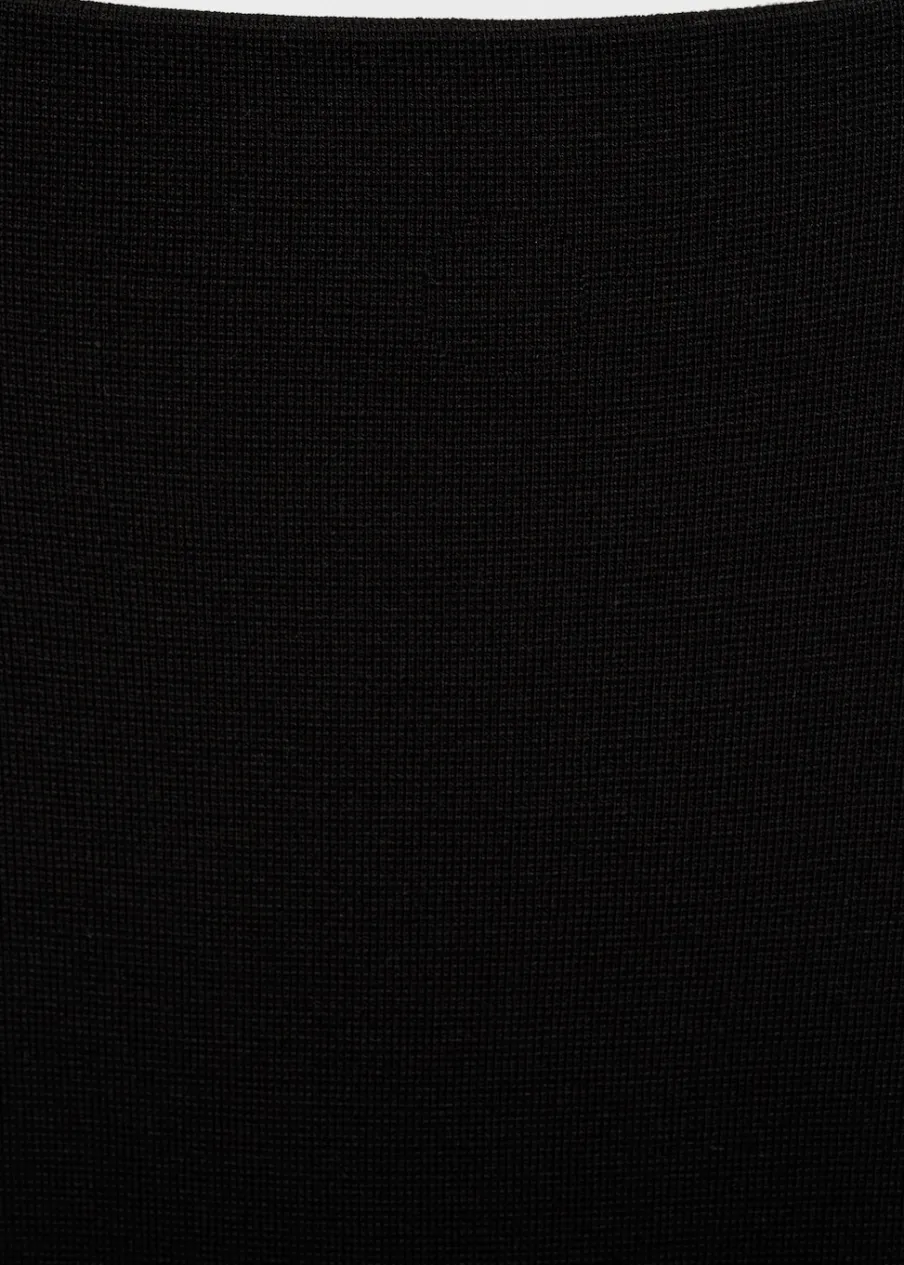 OpisTkanina z cienkiej dzianiny. Model ołówkowy. Krój do kolan. Podwyższony stan. Rozcięcie z tyłu u dołu. Bez za…