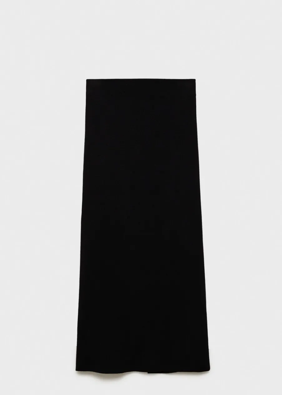 Tkanina z cienkiej dzianiny. Model ołówkowy. Krój do kolan. Podwyższony stan. Rozcięcie z tyłu u dołu. Bez zapięcia.