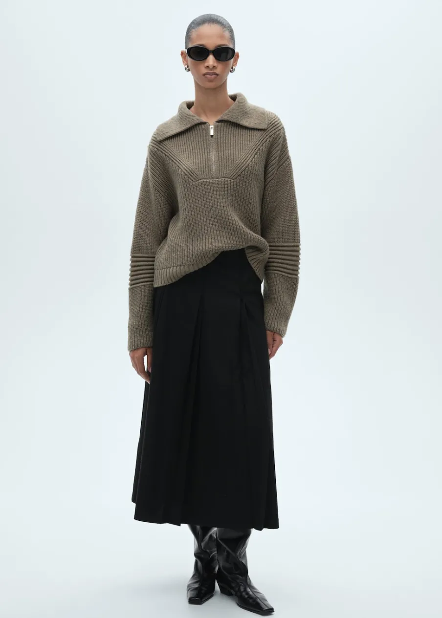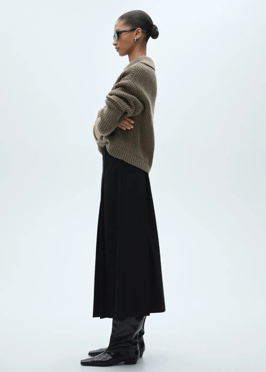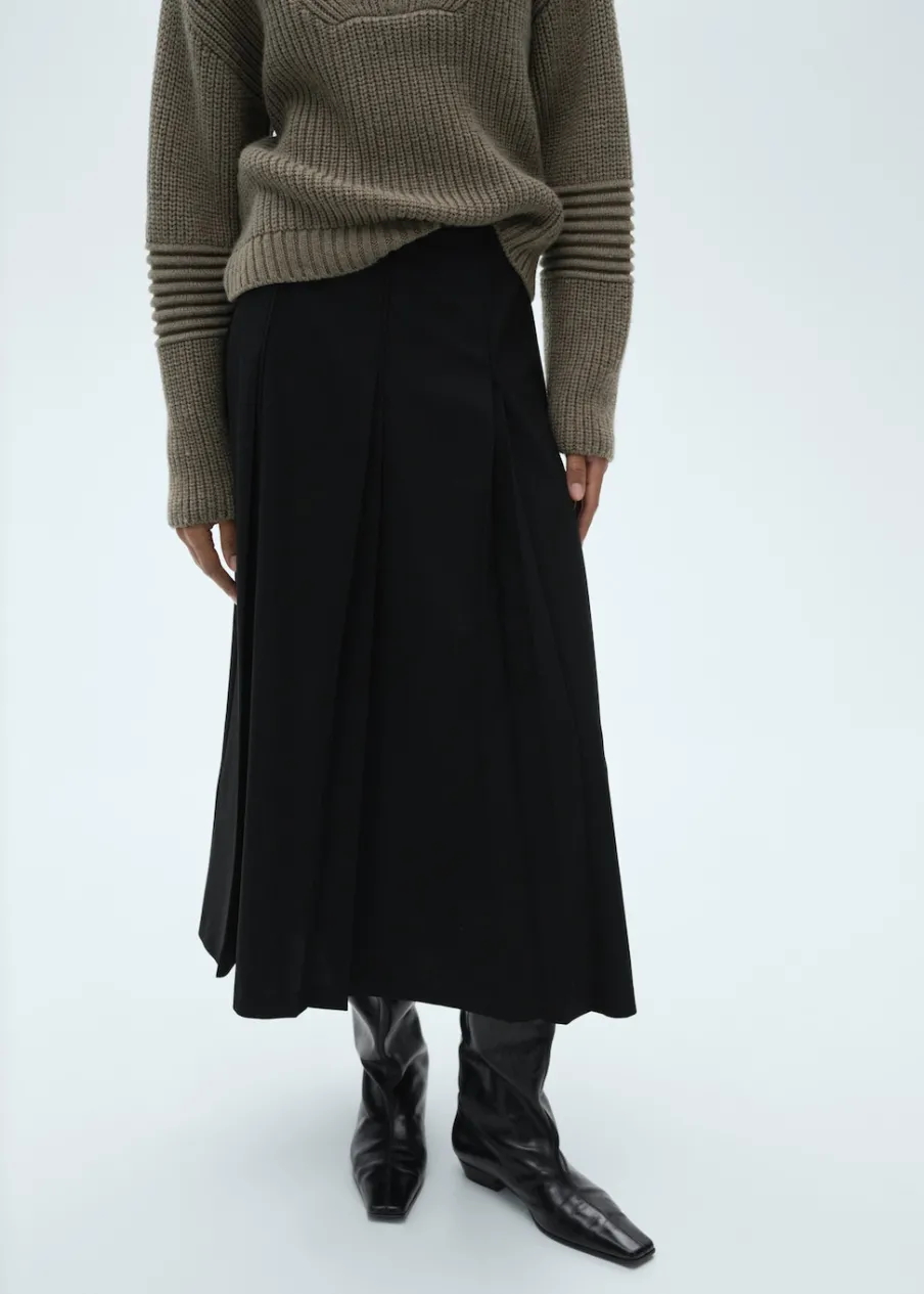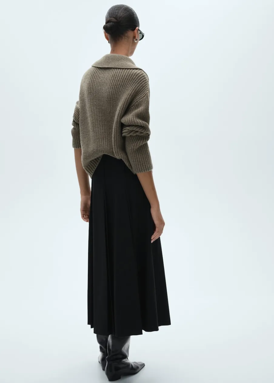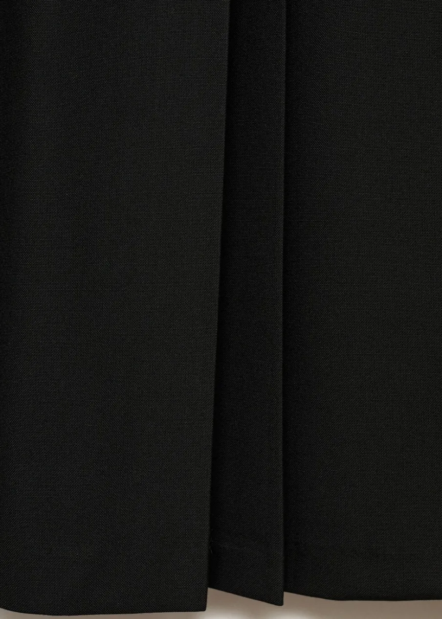 Model evasé. Krój do kolan. Fason z zakładkami. Zapięcie z tyłu na kryty suwak. Modelka ma 178 cm wzrostu i nosi rozmiar S/36.