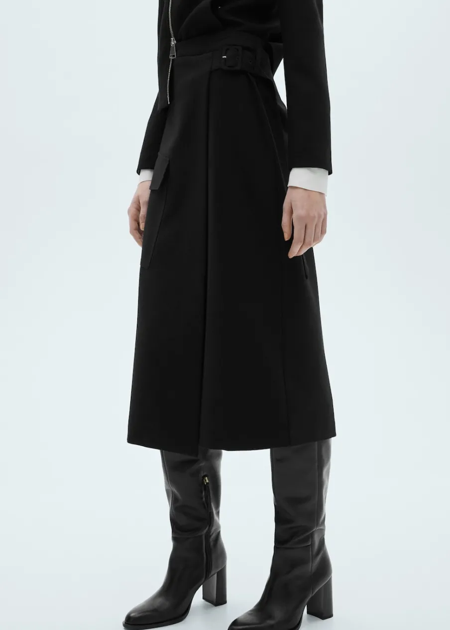 Model evasé. Krój do kolan. Średni stan. Kieszeń boczna. Zapięcie na klamrę.