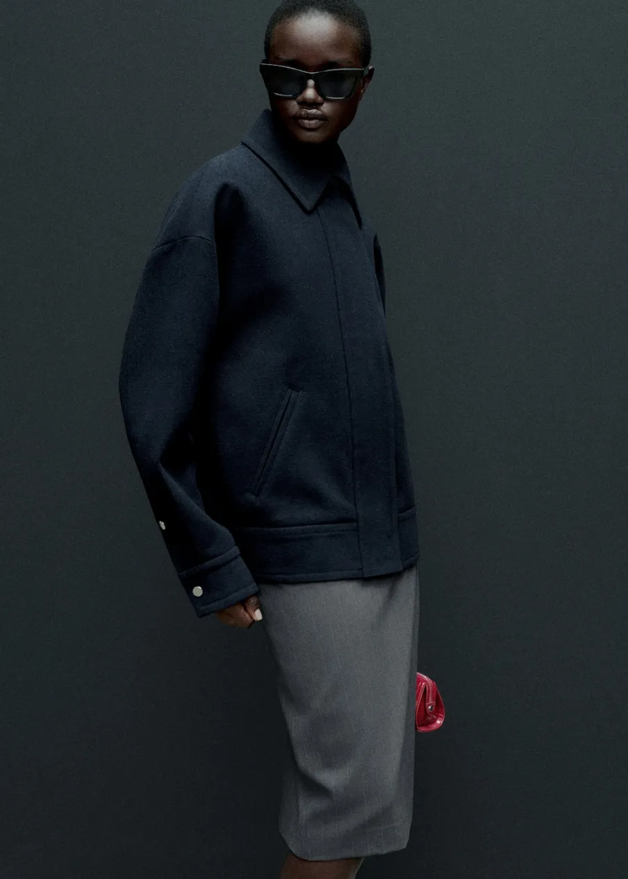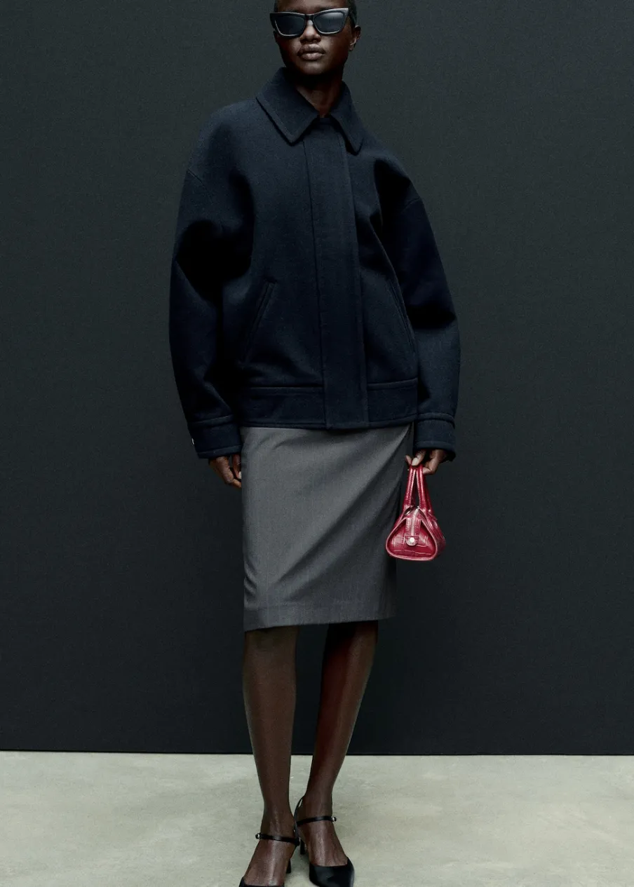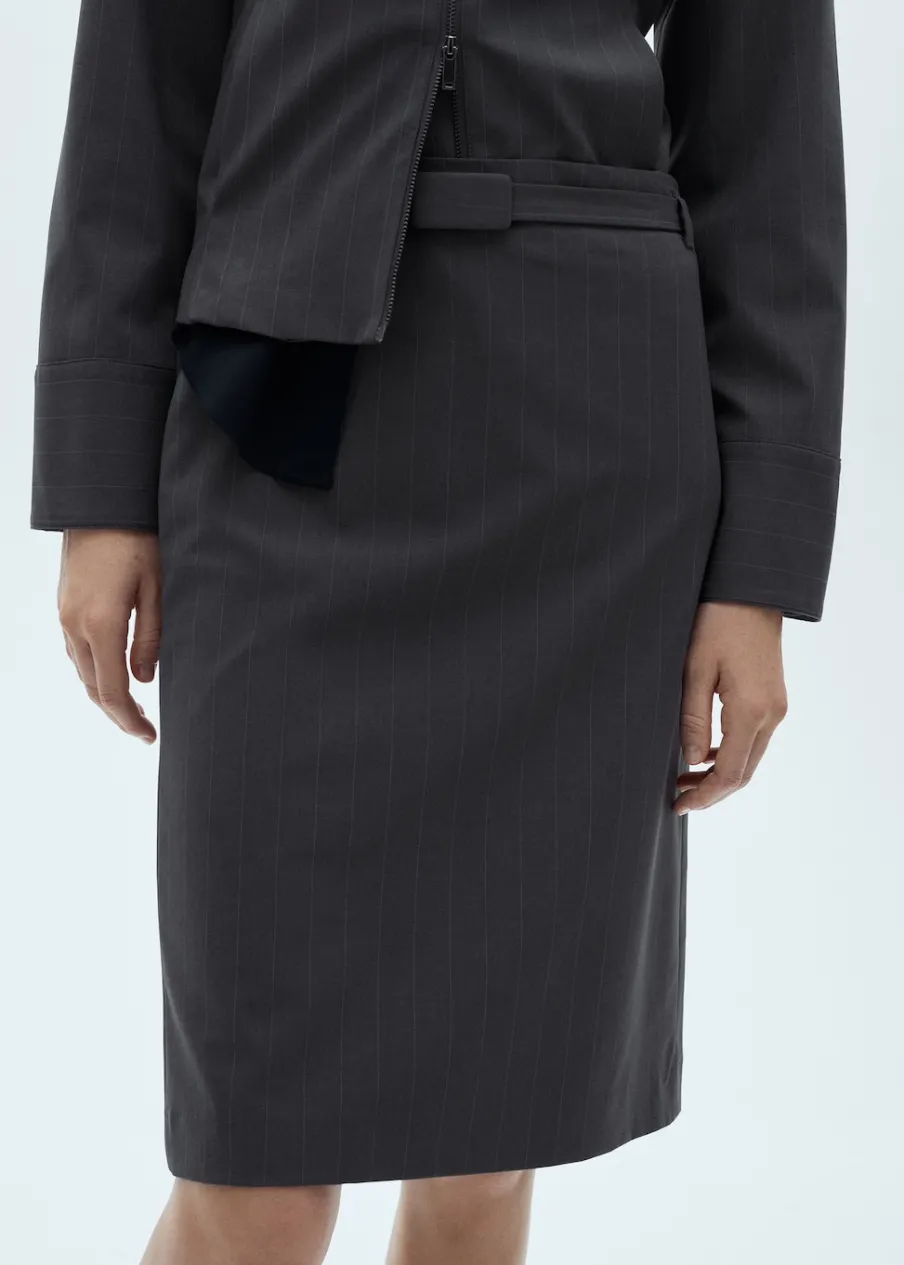 Deseń w prążki. Model ołówkowy. Model wcięty. Krój do kolan. Odpinany pasek. Rozcięcie u dołu. Wewnętrzna podszewka. Modelka ma 181 cm wzrostu i nosi rozmiar S/36. Total look.