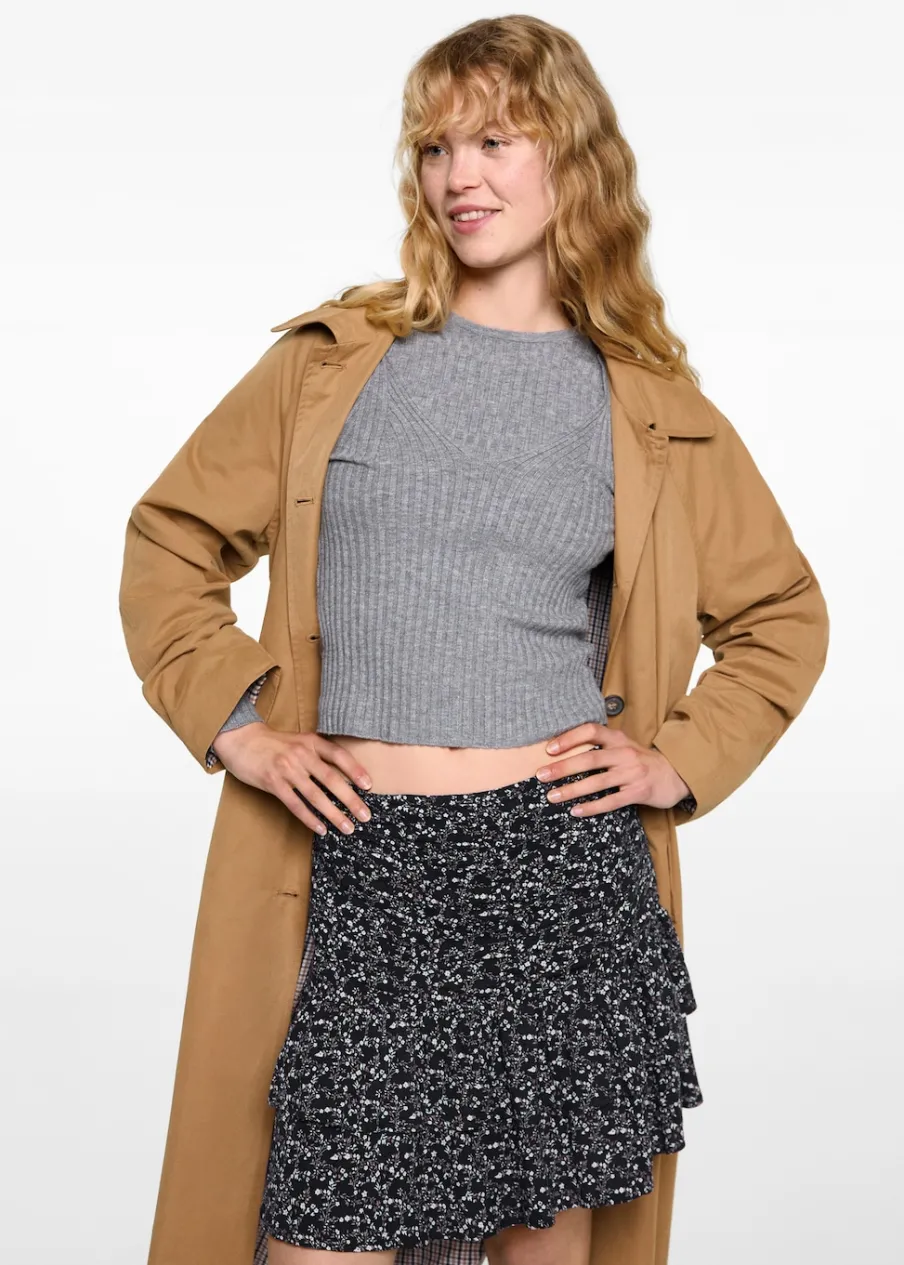 OpisModel prosty. Krótki krój. Marszczona tekstura. Model z falbankami. Zapięcie na zamek z boku. Modelka ma 172 cm w…