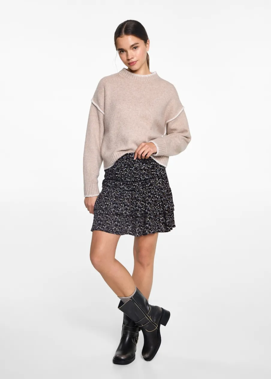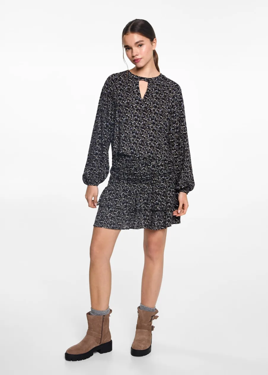 Model prosty. Krótki krój. Marszczona tekstura. Model z falbankami. Zapięcie na zamek z boku. Modelka ma 172 cm wzrostu i nosi rozmiar M. Kwiatowy deseń.