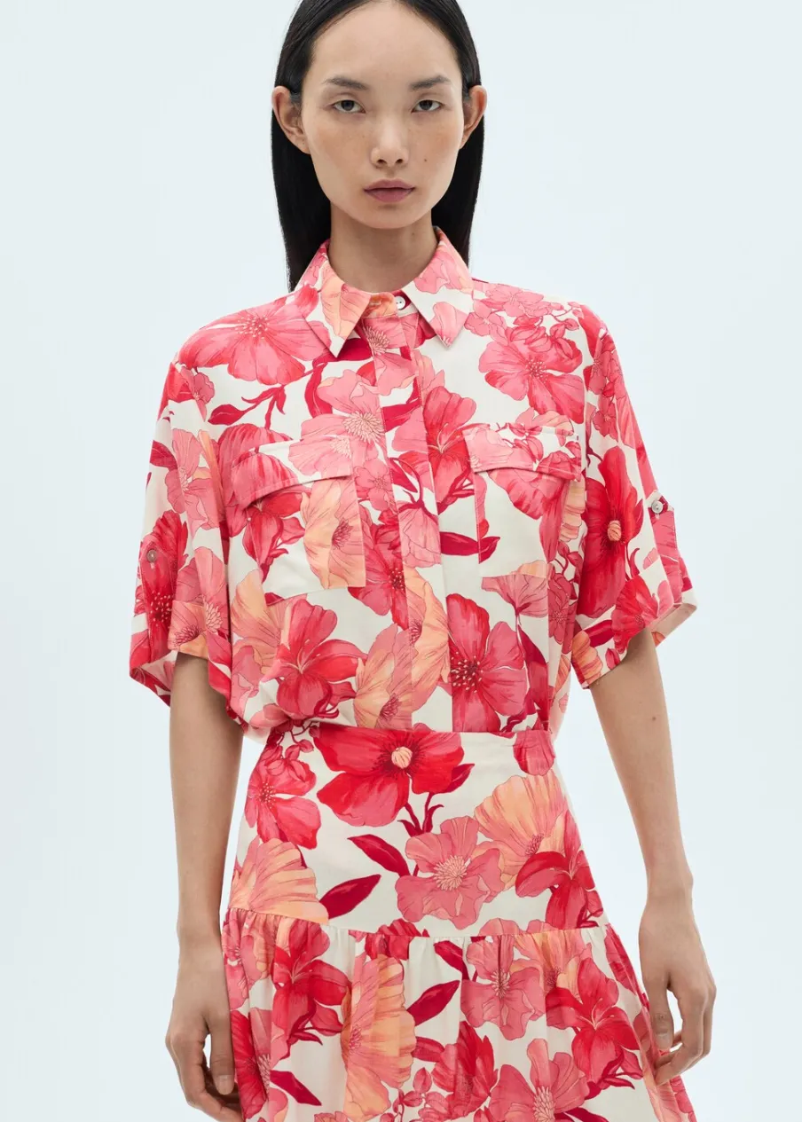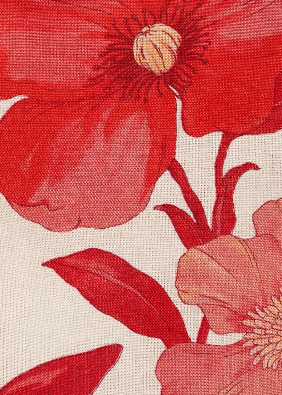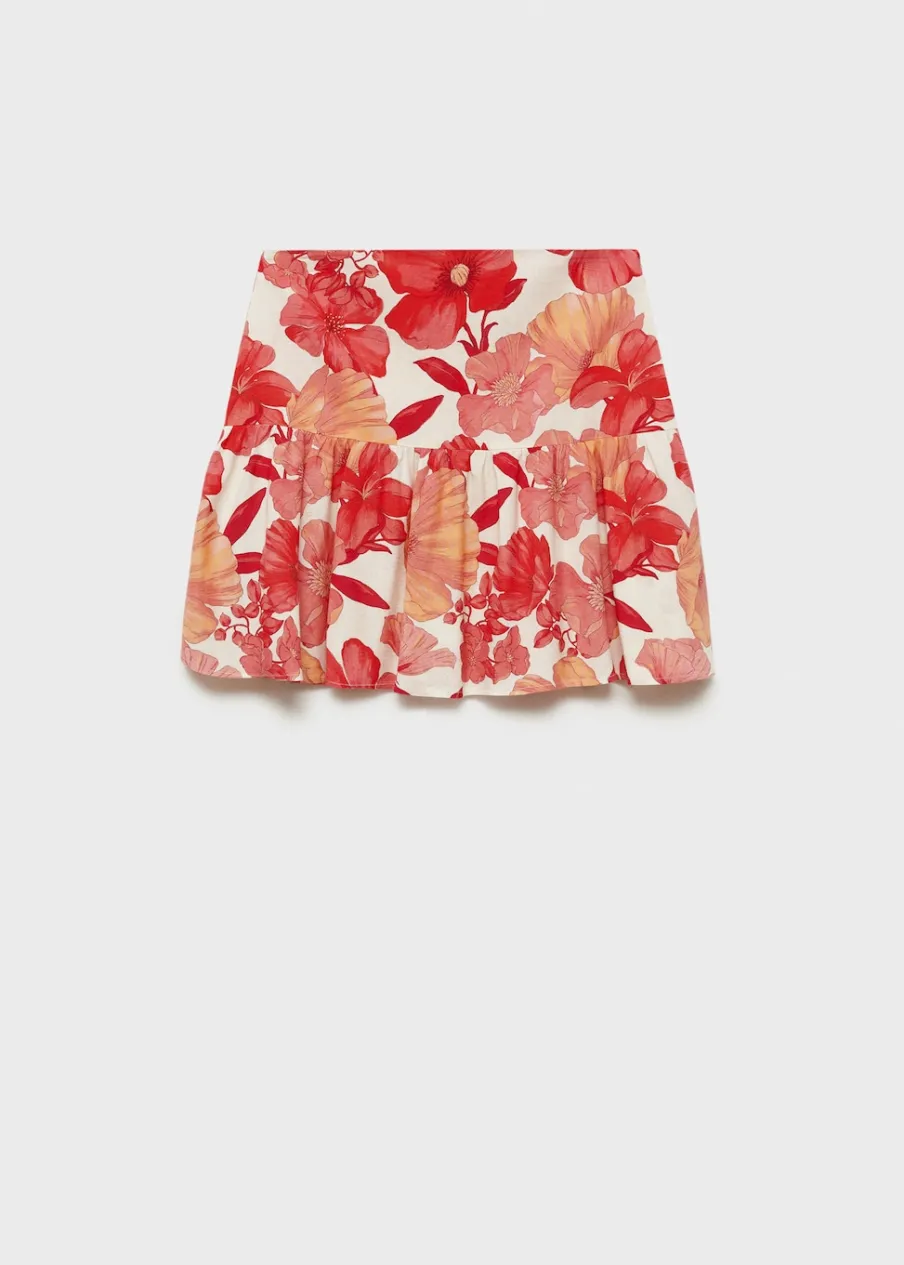 Tkanina z mieszanki lnu. Model evasé. Krótki krój. Wzór w kwiaty. Średni stan. Zapięcie na zamek z boku.