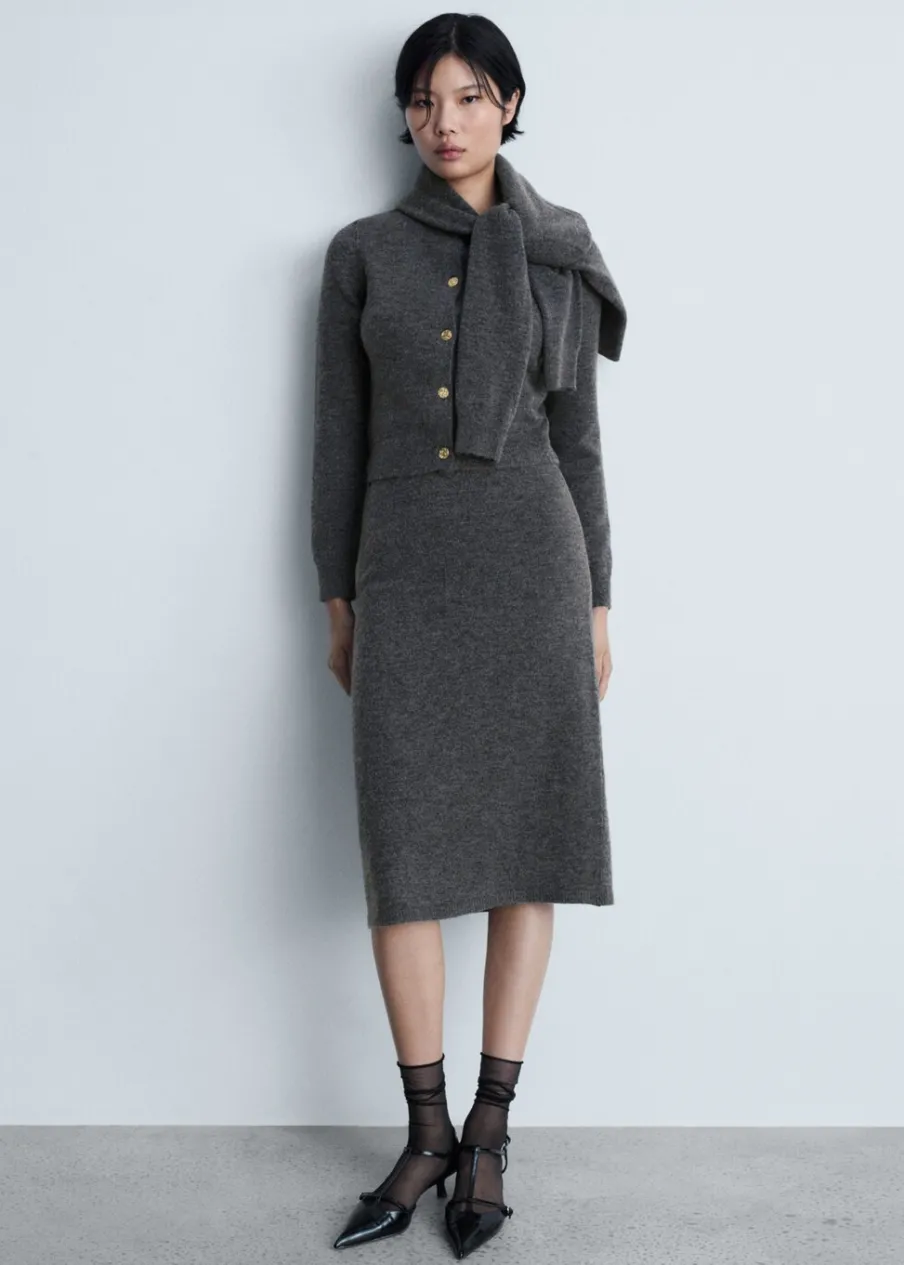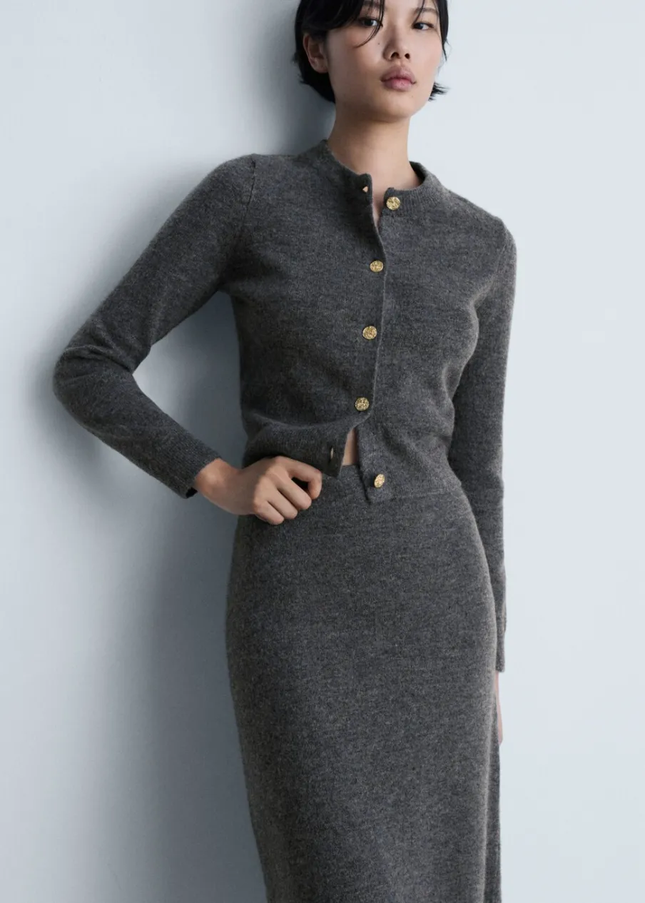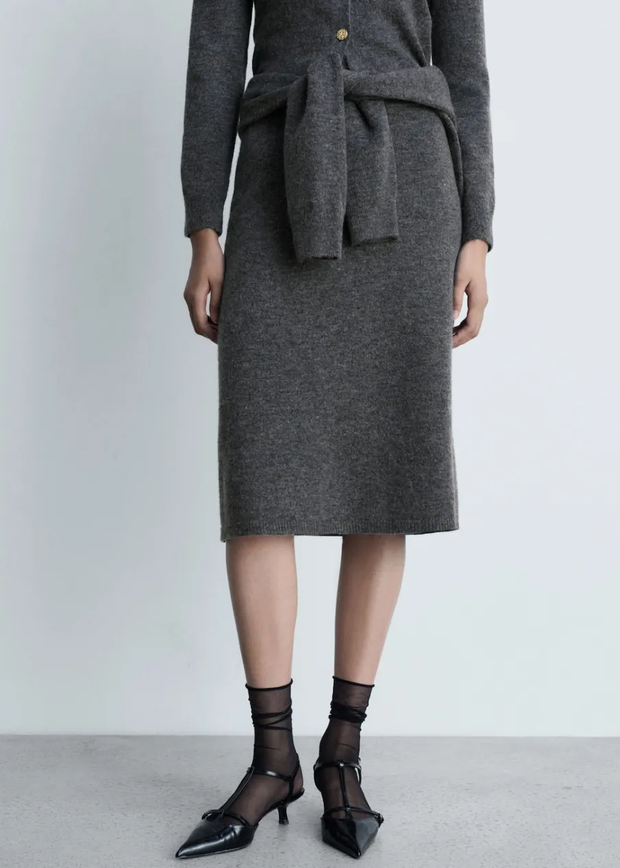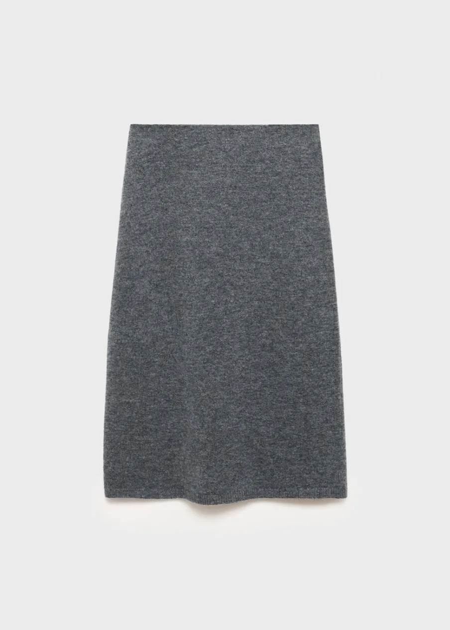 Dzianina średniej grubości. Tkanina mieszanka wełny. Model evasé. Krój do kolan. Elastyczny pas. Total look. Modelka ma 179 cm wzrostu i nosi rozmiar S/36.
