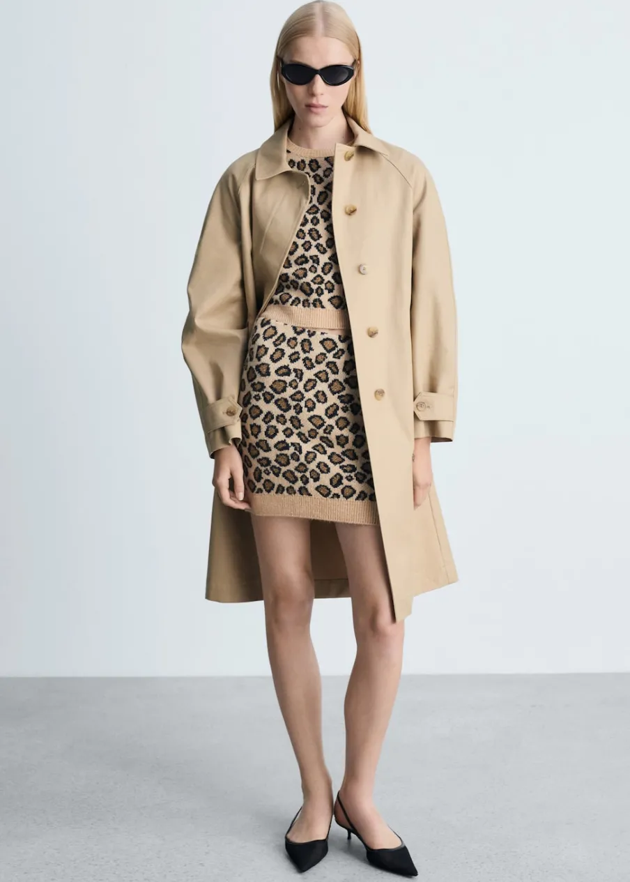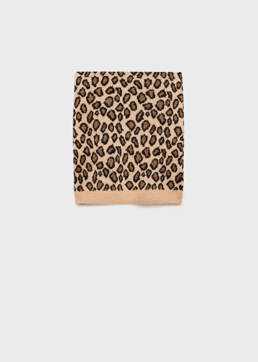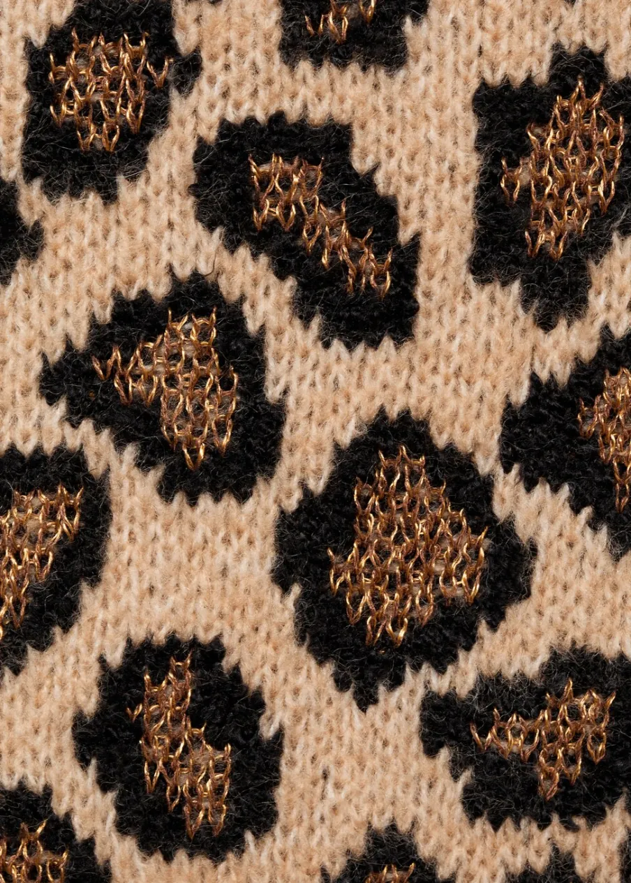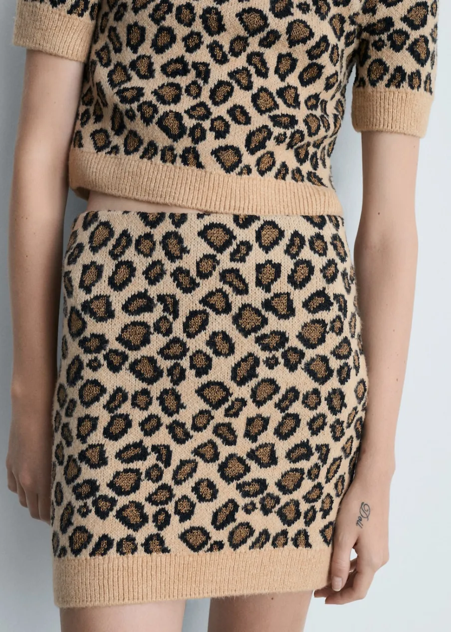 Dzianinowa tkanina. Model wcięty. Krótki krój. Wzór w lamparcie cętki. Średni stan. Elastyczny pas. Bez zapięcia. Modelka ma 178 cm wzrostu i nosi rozmiar S/36. Total look.