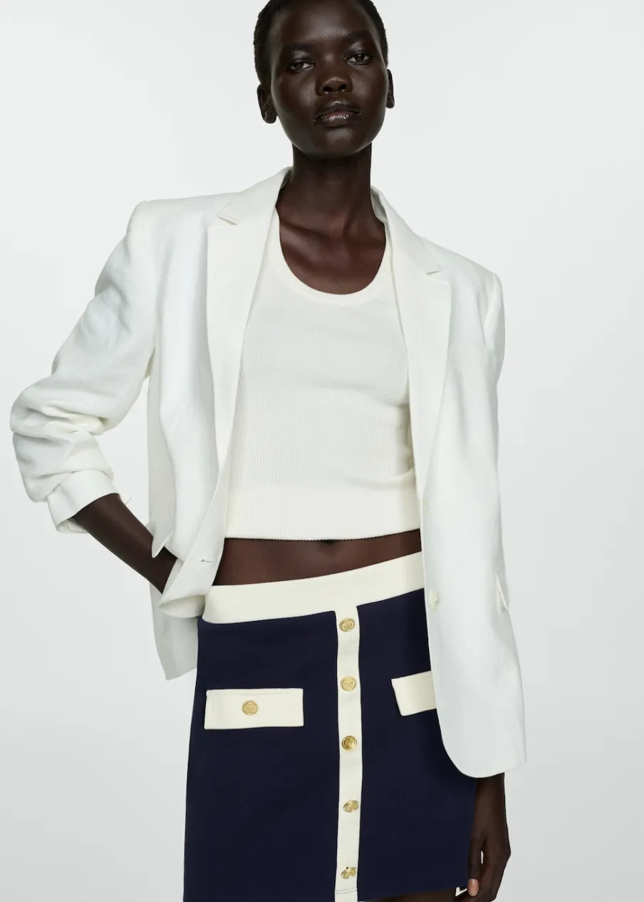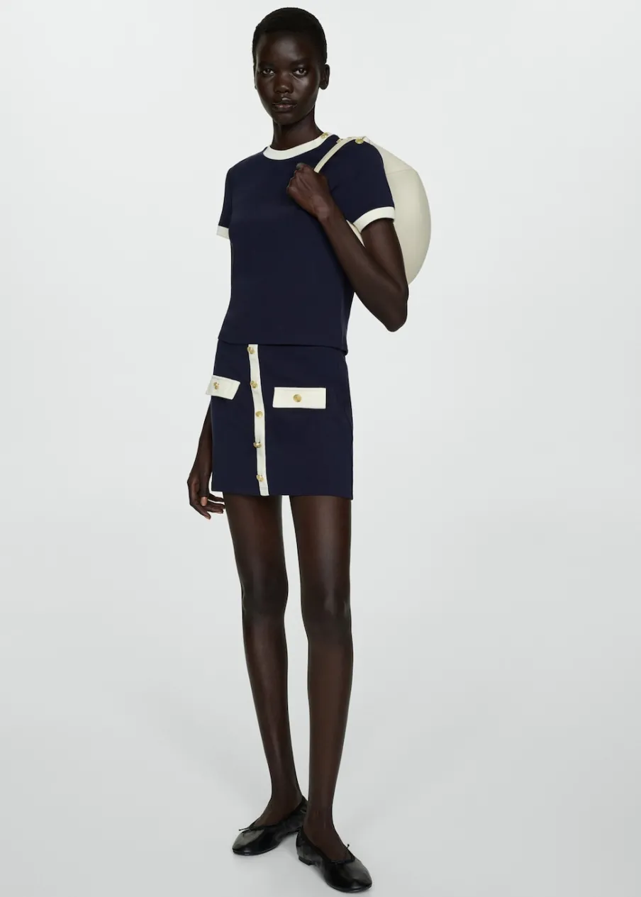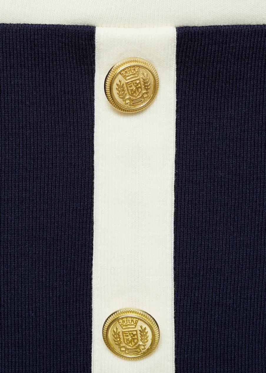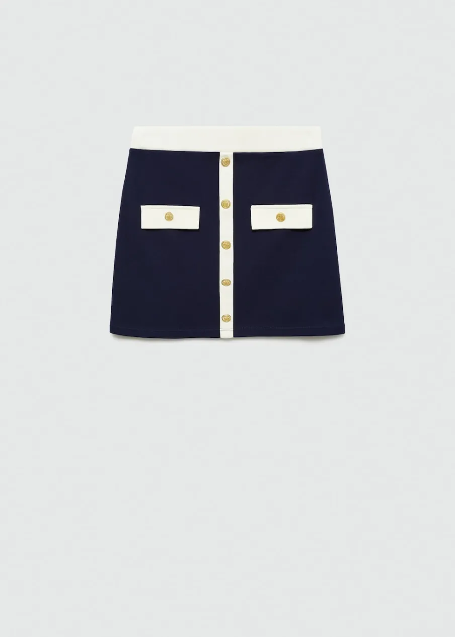 Dzianinowa tkanina. Krótki krój. Model evasé. Model dostępny w wersji gładkiej lub ze wzorem. Struktura w pasy. Dwie przednie kieszenie z patką i guzikiem. Ozdobne guziki. Kontrastowe lamówki. Tkanina z 100% bawełny.
