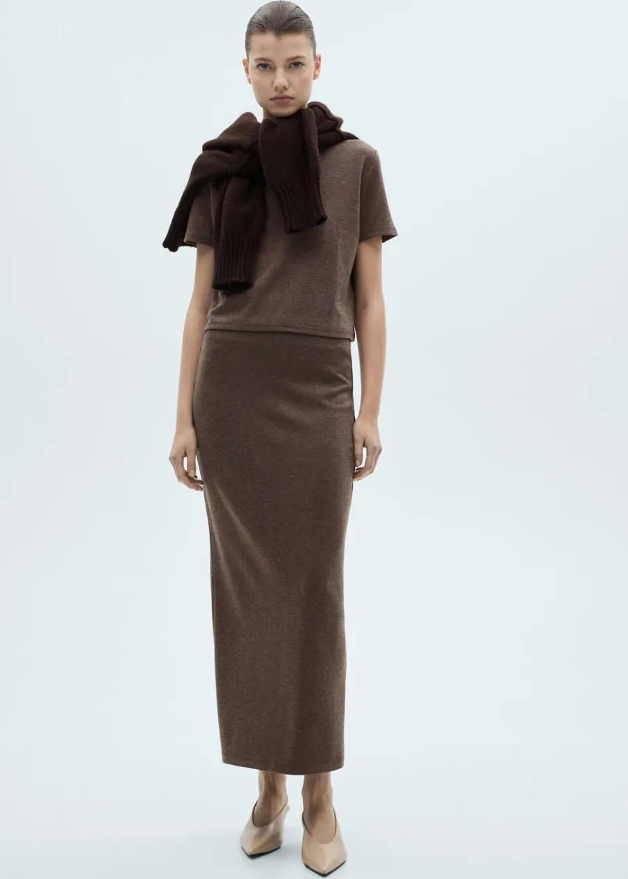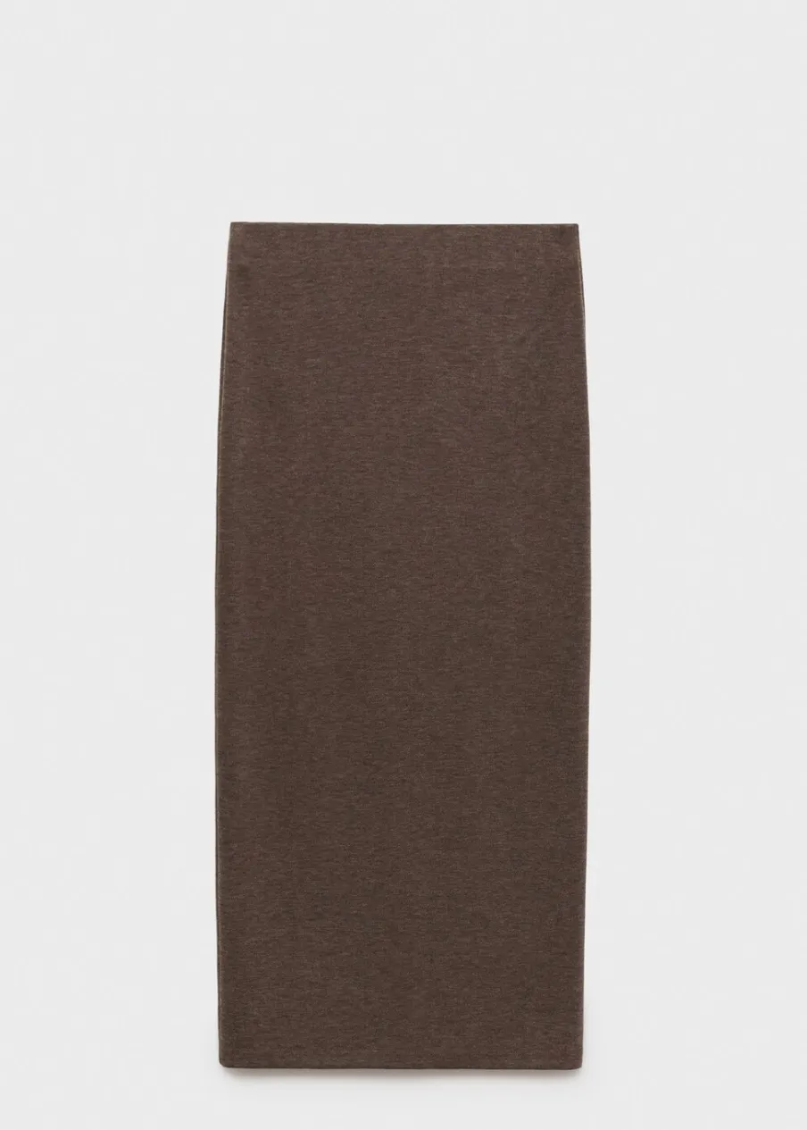 Dzianina. Cienka tkanina. Model ołówkowy. Krój do kolan. Średni stan. Elastyczny pas. Detal z rozcięciem z tyłu. Bez zapięcia.