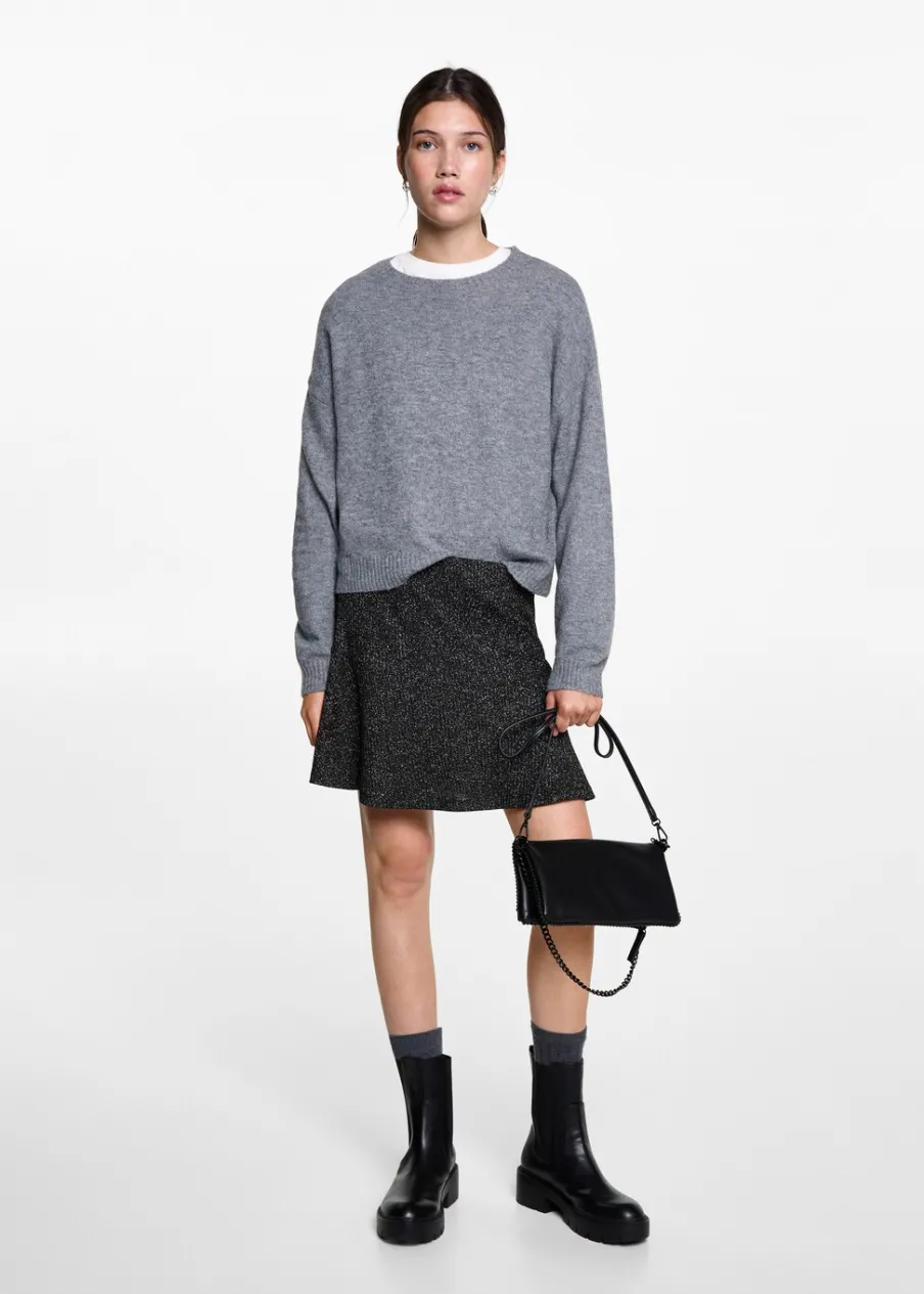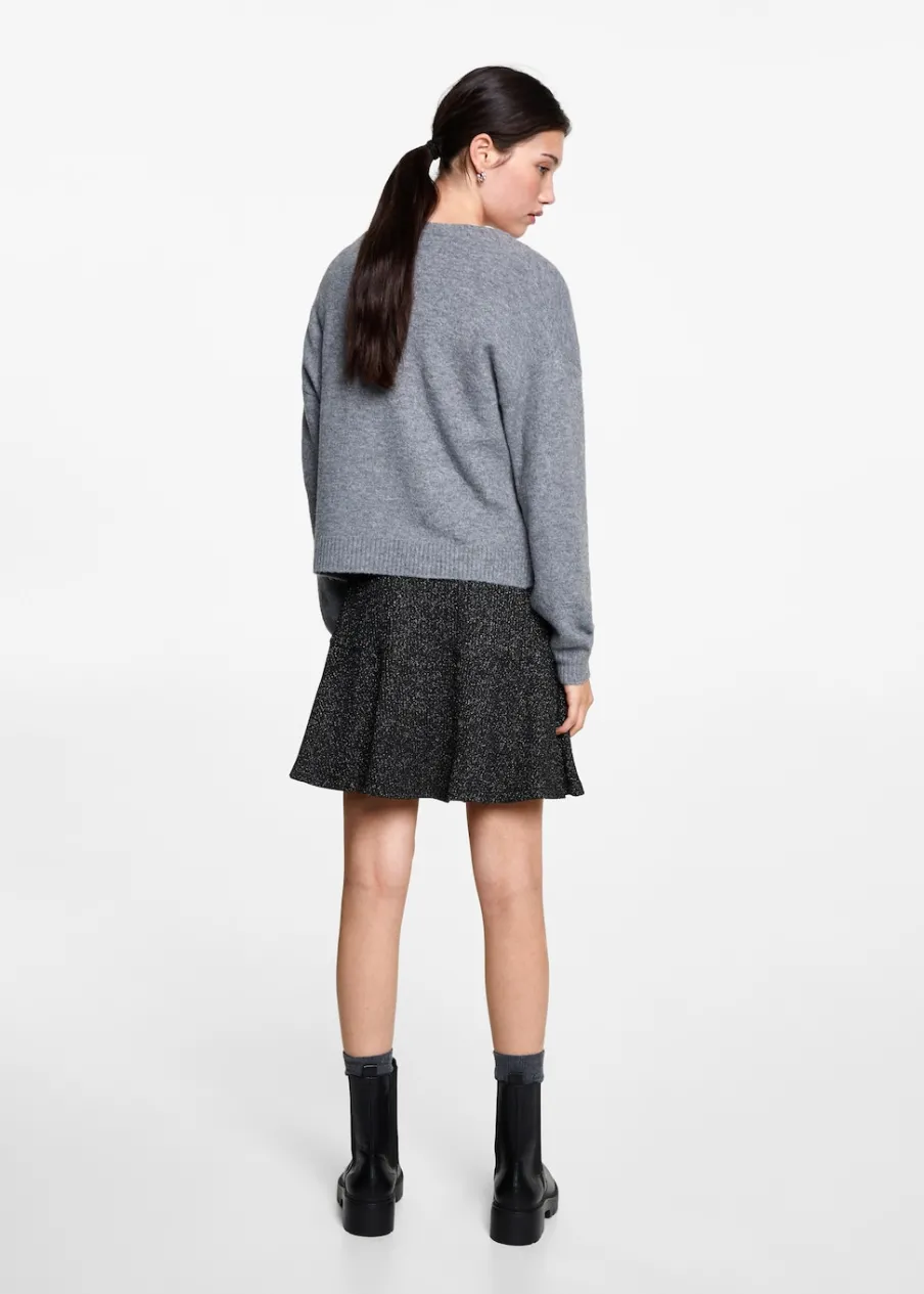 Kolekcja wieczorowa i imprezowa. Ściągaczowa dzianina. Średni stan. Krótki krój. Kryte zapięcie na zamek z boku. Zdjęcie modelki wygenerowano za pomocą sztucznej inteligencji. Tkanina z cienkiej dzianiny. Tkanina lureks. Metaliczny efekt. Model evasé.