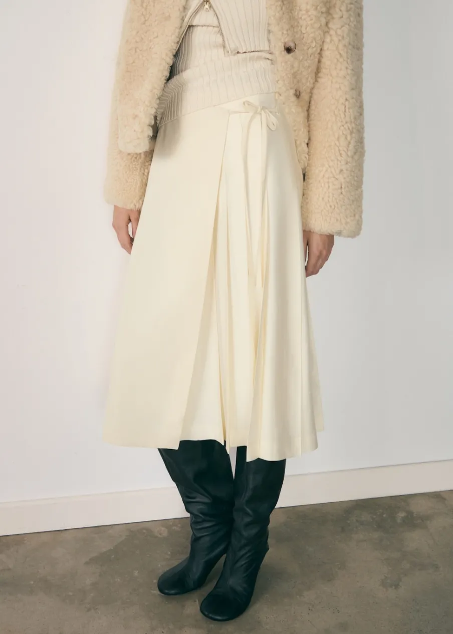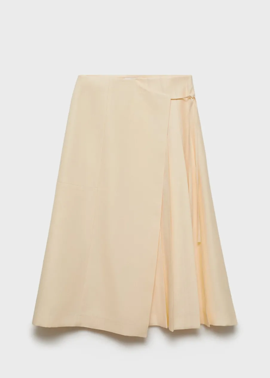 Tkanina mieszana z lyocellem. Model evasé. Krój do kolan. Fason z zakładkami. Model zakładany. Wiązanie z boku. Modelka ma 180 cm wzrostu i nosi rozmiar S/36.