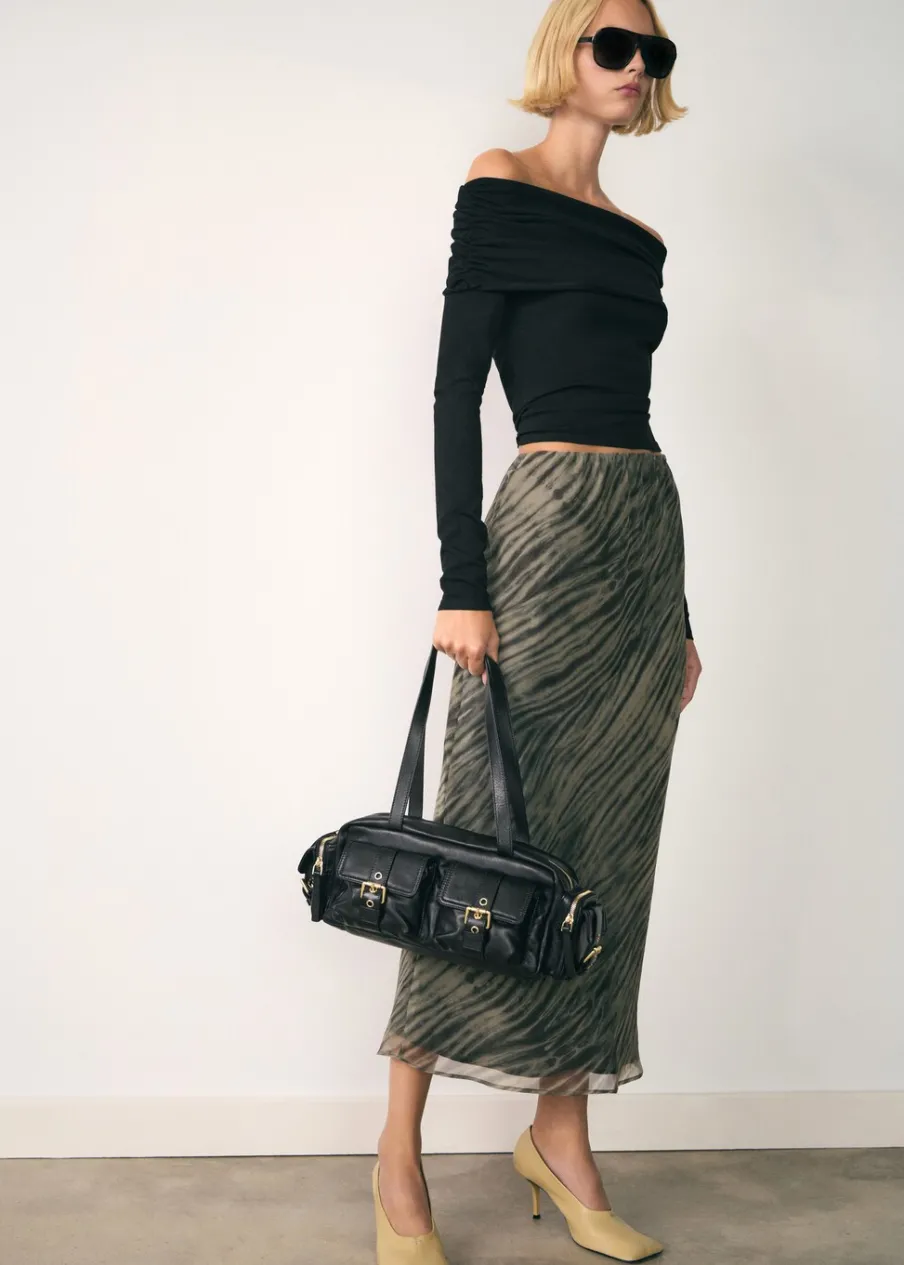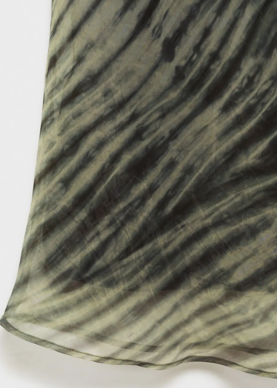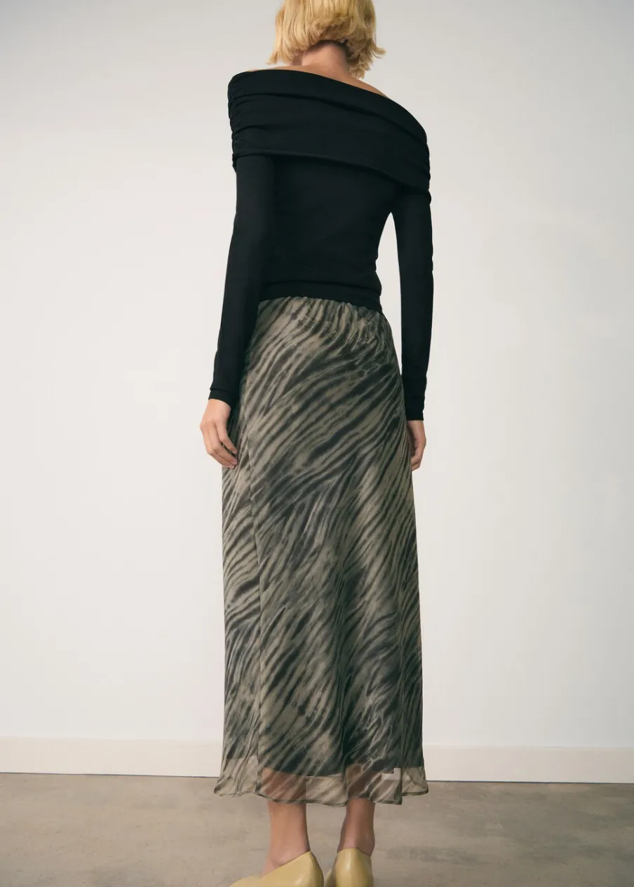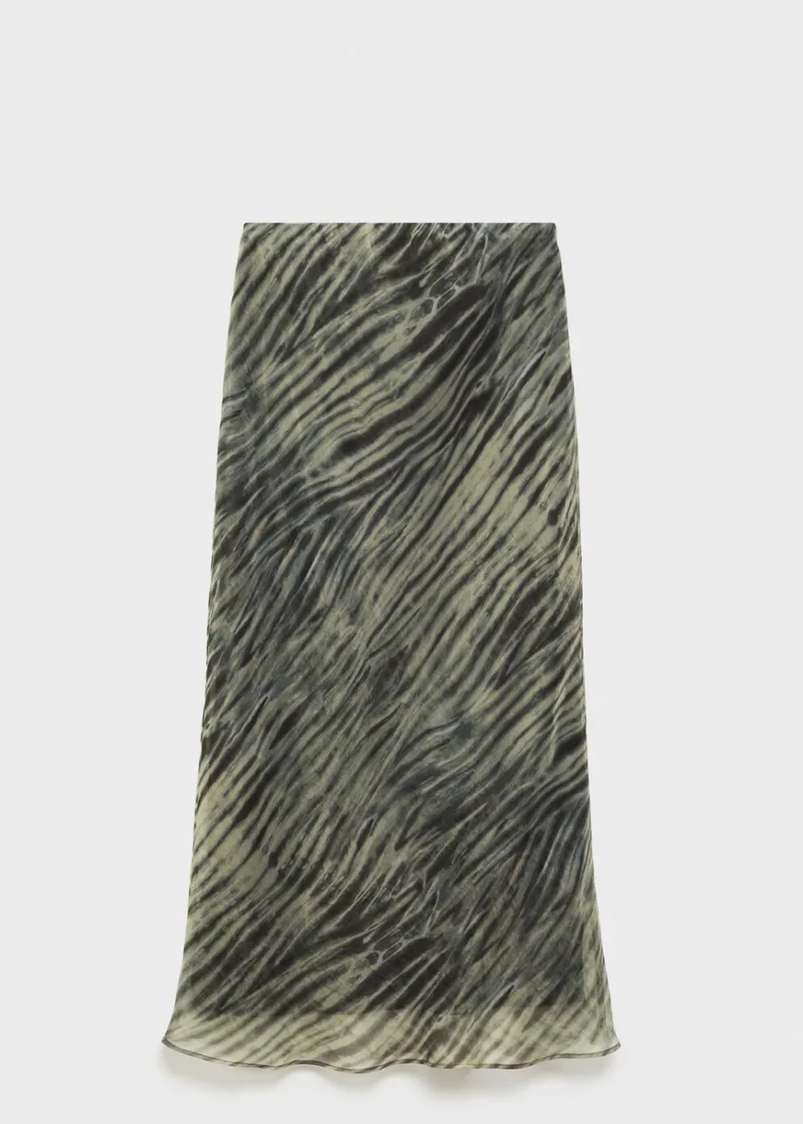 Tkanina organza. Model evasé. Model długi. Bez zapięcia. Wewnętrzna podszewka. Modelka ma 179 cm wzrostu i nosi rozmiar S/36. Kolekcja wizytowa. Nadruk. Elastyczny pas.