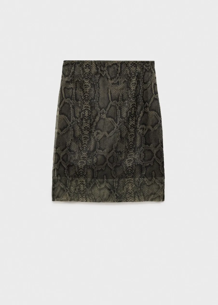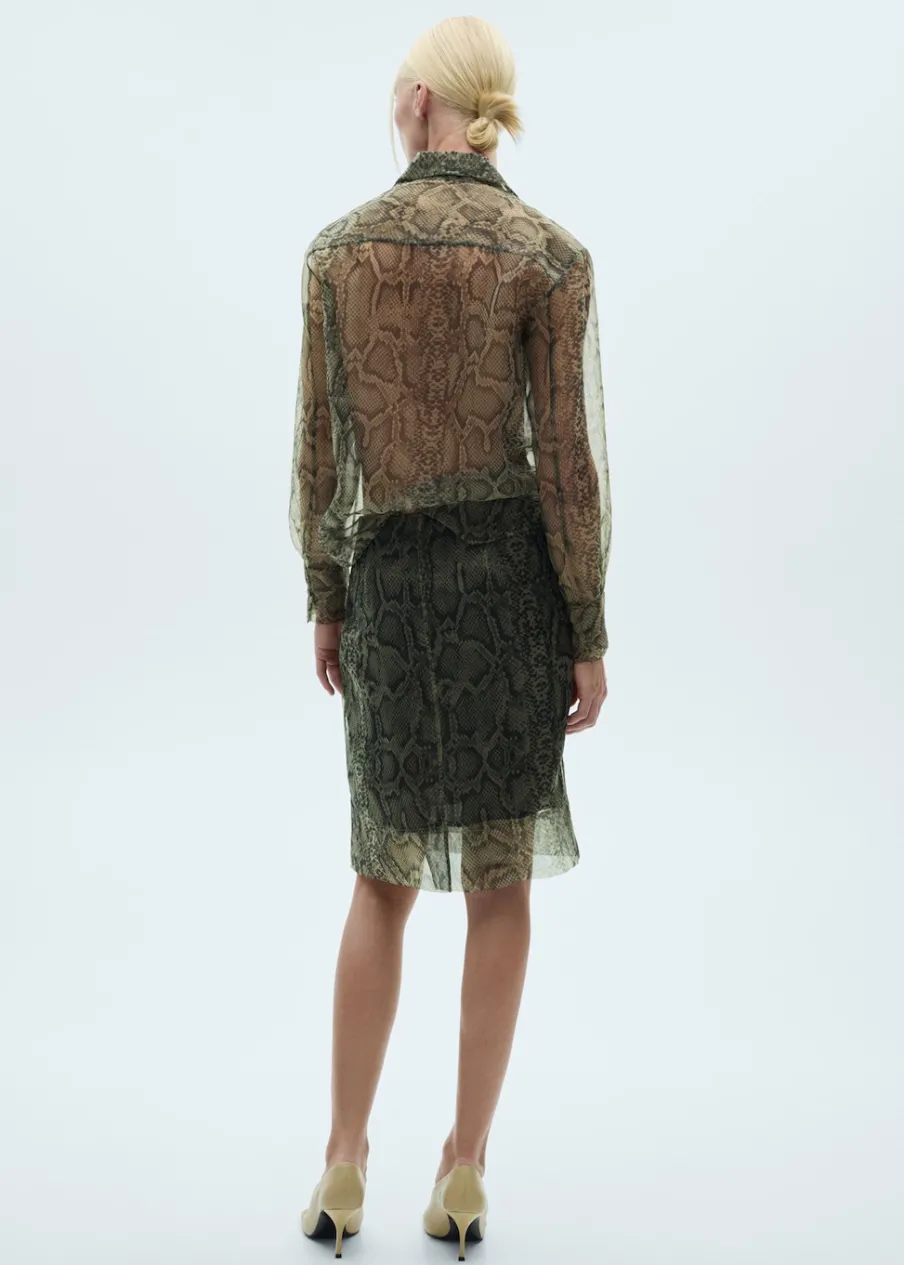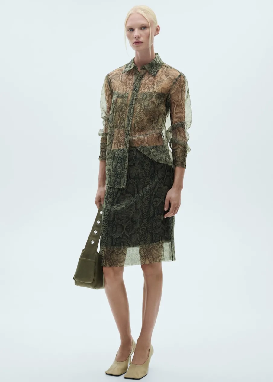 Tkanina organza. Półprzezroczysta tkanina. Krój do kolan. Model ołówkowy. Zwierzęcy wzór. Średni stan. Elastyczny pas. Bez zapięcia. Wewnętrzna podszewka. Modelka ma 178 cm wzrostu i nosi rozmiar S/36. Total look.