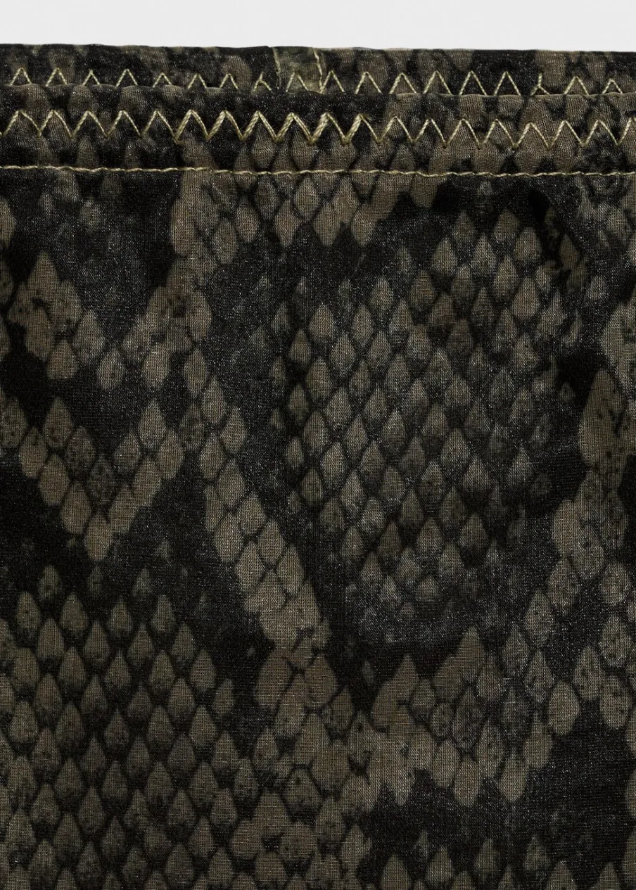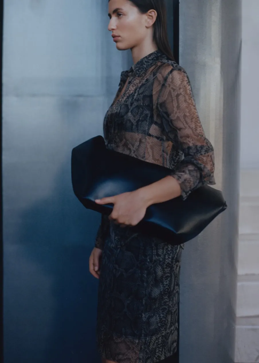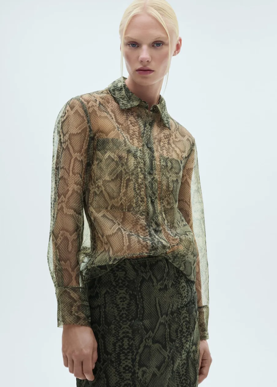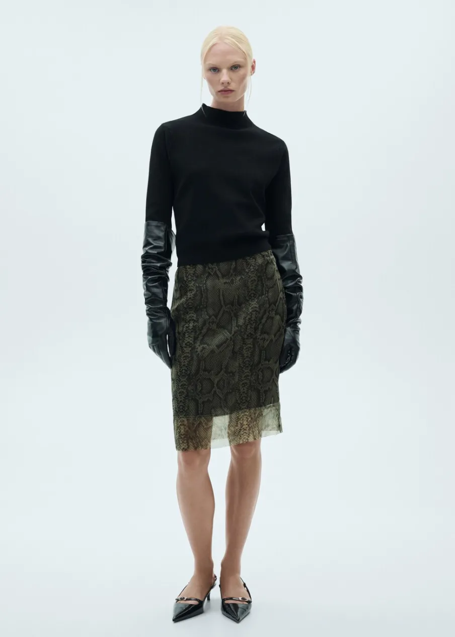 Tkanina organza. Półprzezroczysta tkanina. Krój do kolan. Model ołówkowy. Zwierzęcy wzór. Średni stan. Elastyczny pas. Bez zapięcia. Wewnętrzna podszewka. Modelka ma 178 cm wzrostu i nosi rozmiar S/36. Total look.