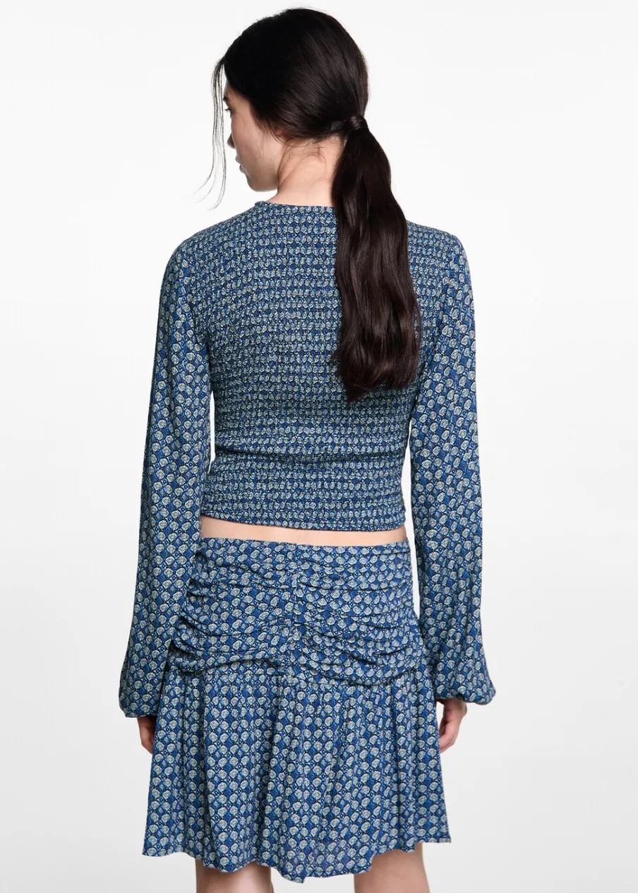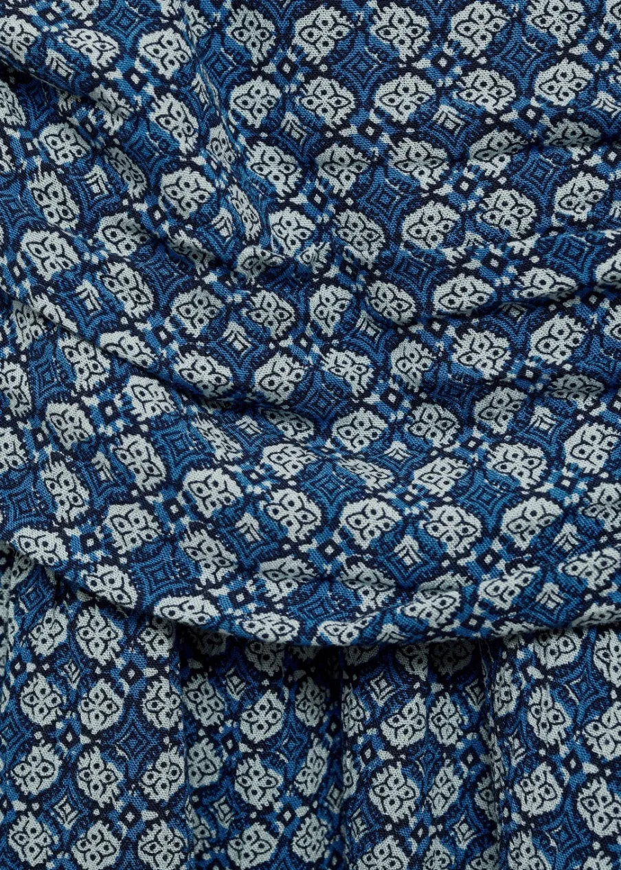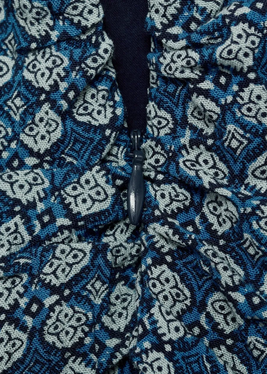 Total look. Lejąca tkanina. Krótki krój. Rozszerzany model. Marszczenie z boku z wiązaniem. Kryte zapięcie na zamek z boku. Nadruk.