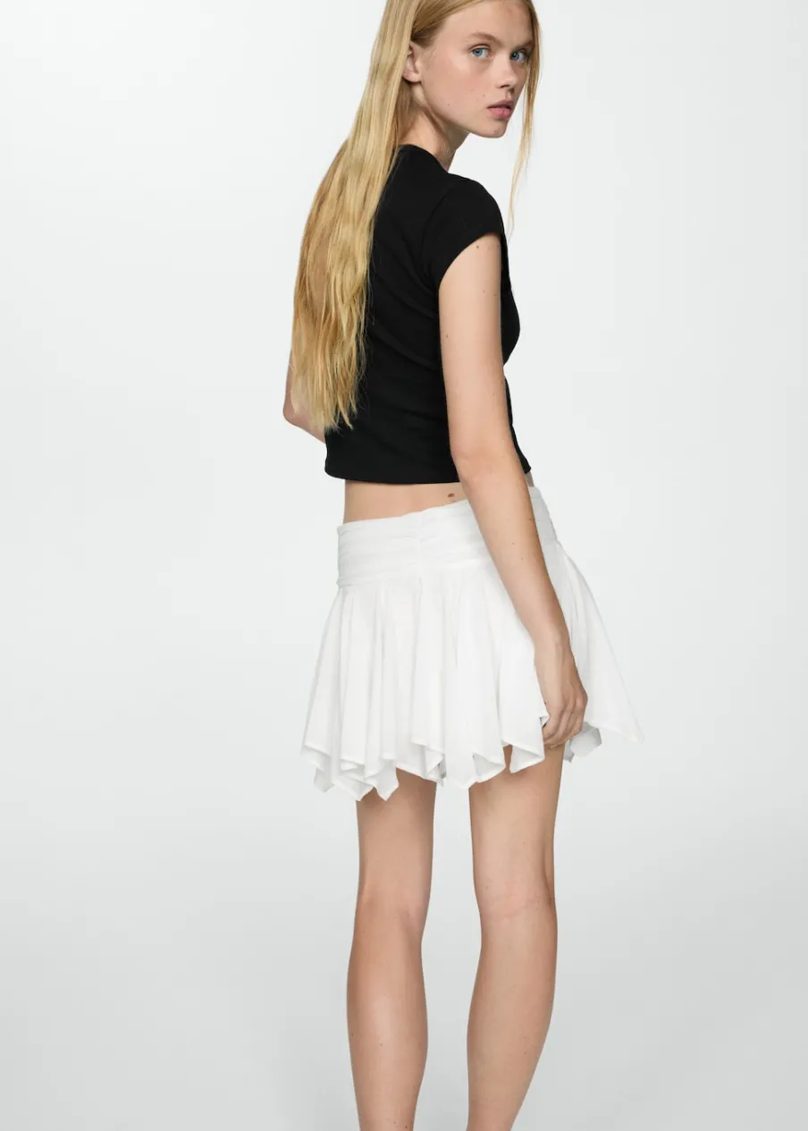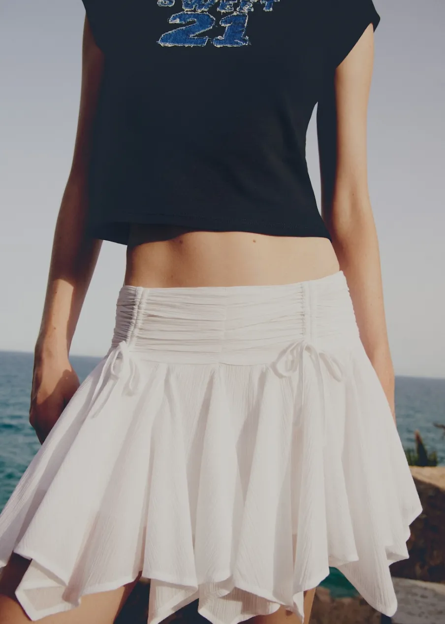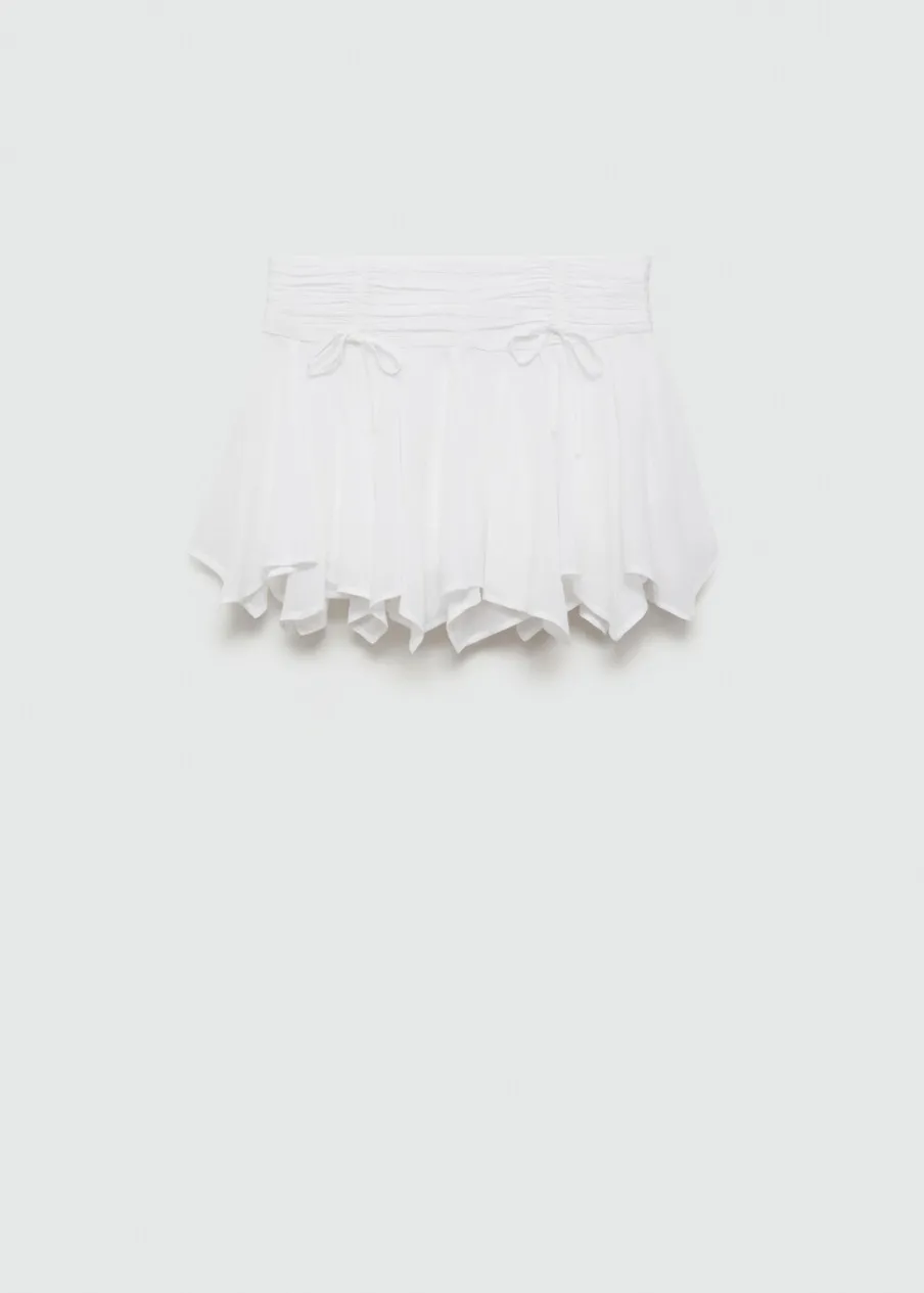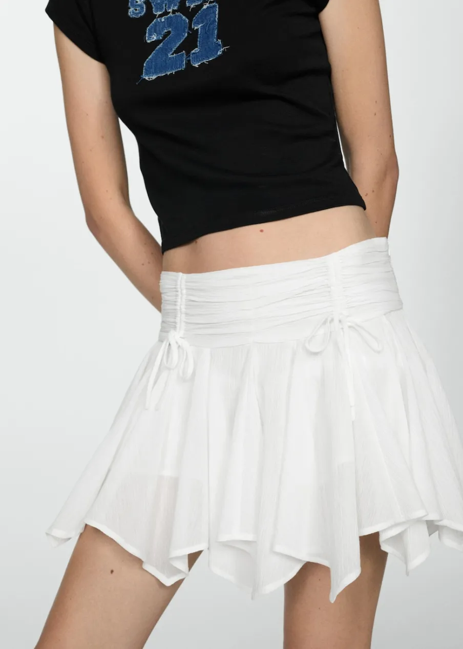 OpisKrótki krój. Model evasé. Średni stan. Kryte zapięcie na zamek z boku. Asymetryczny dół. Ozdobne kokardki. We…