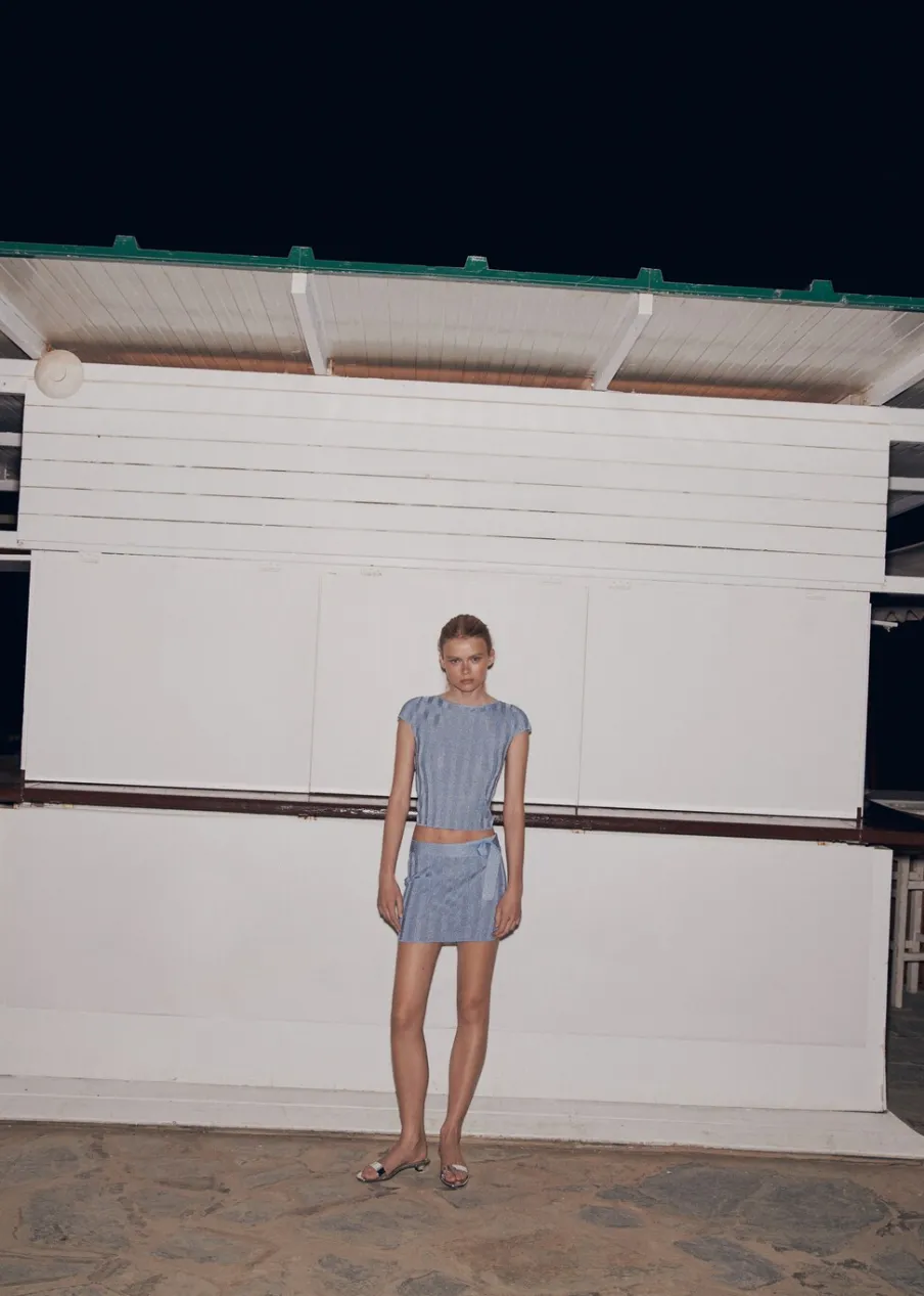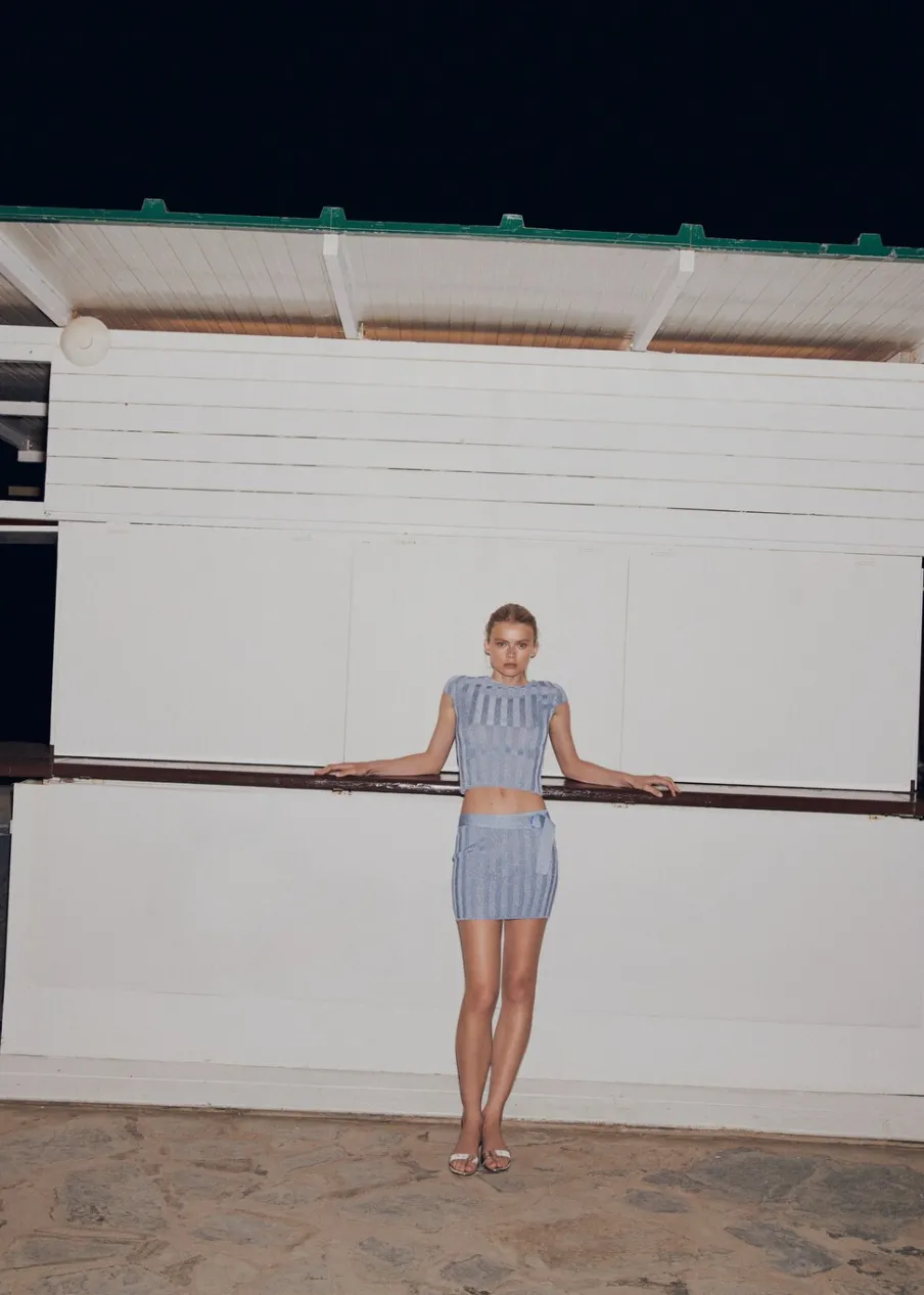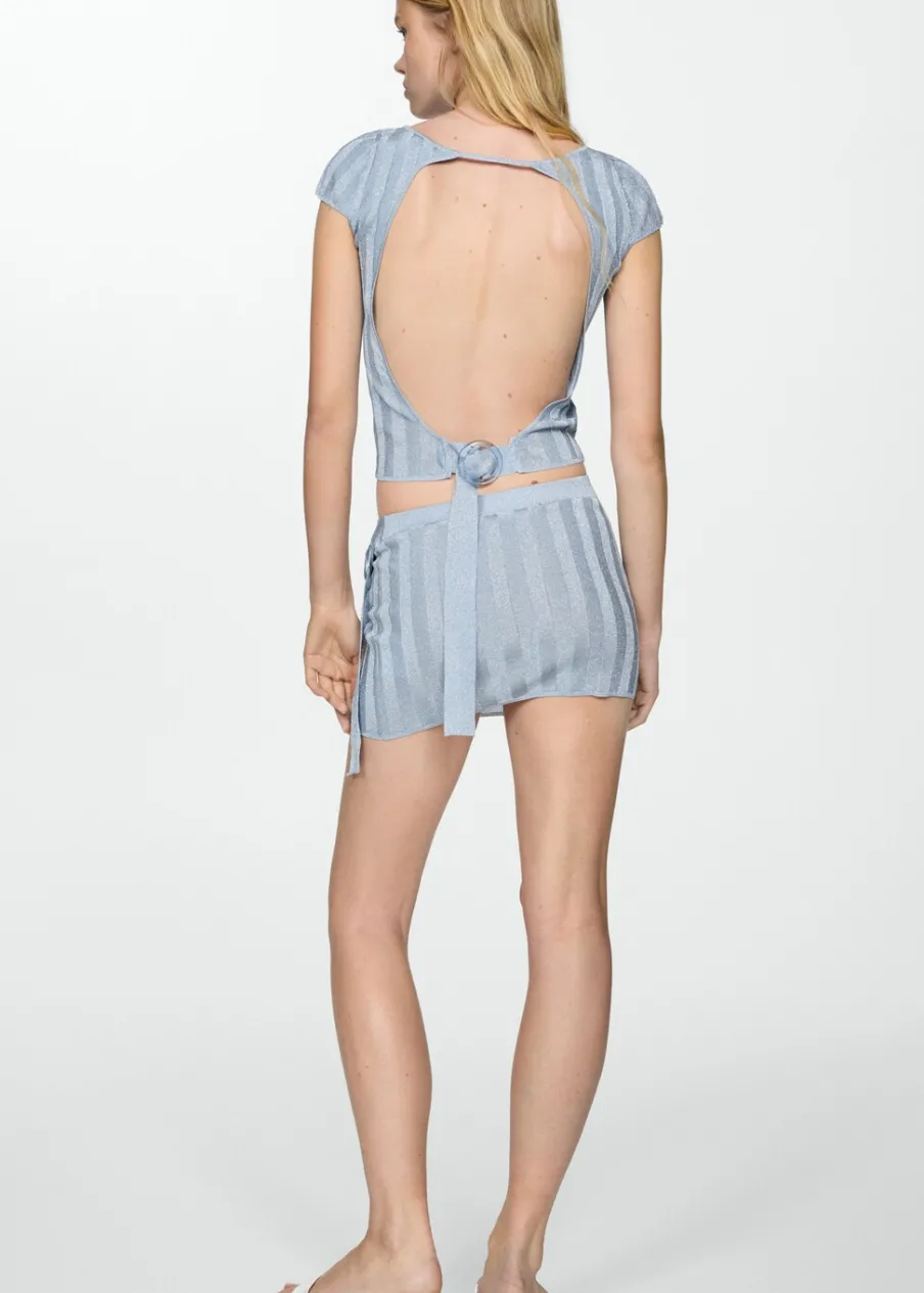 Tkanina z cienkiej dzianiny. Tkanina lureks. Średni stan. Rozmiar mini. Krótki krój. Elastyczny pas. Dekoracyjny pasek. Total look. Model wcięty.