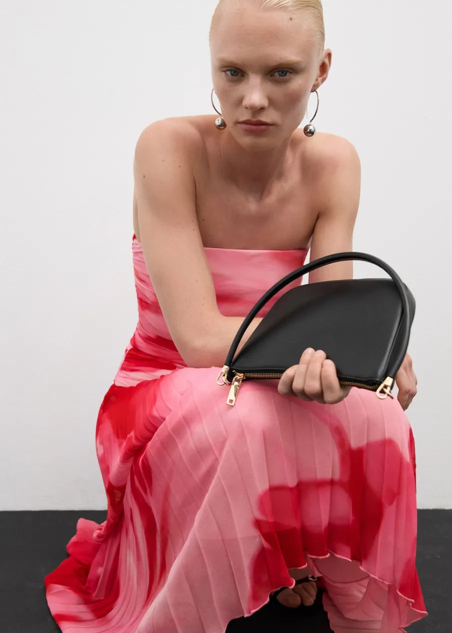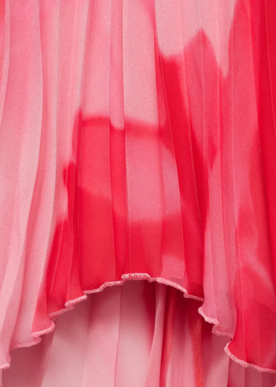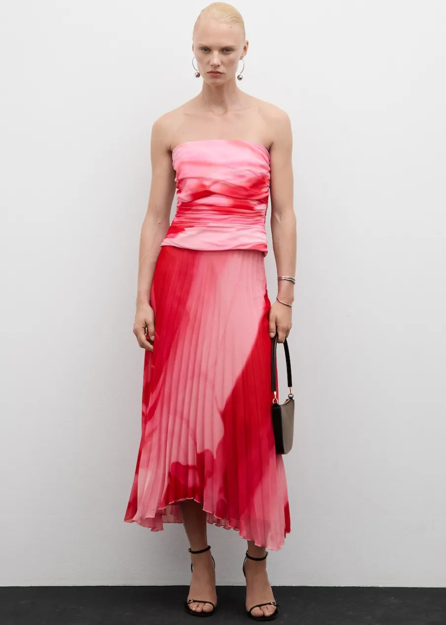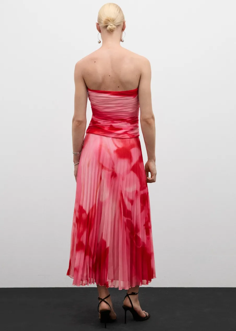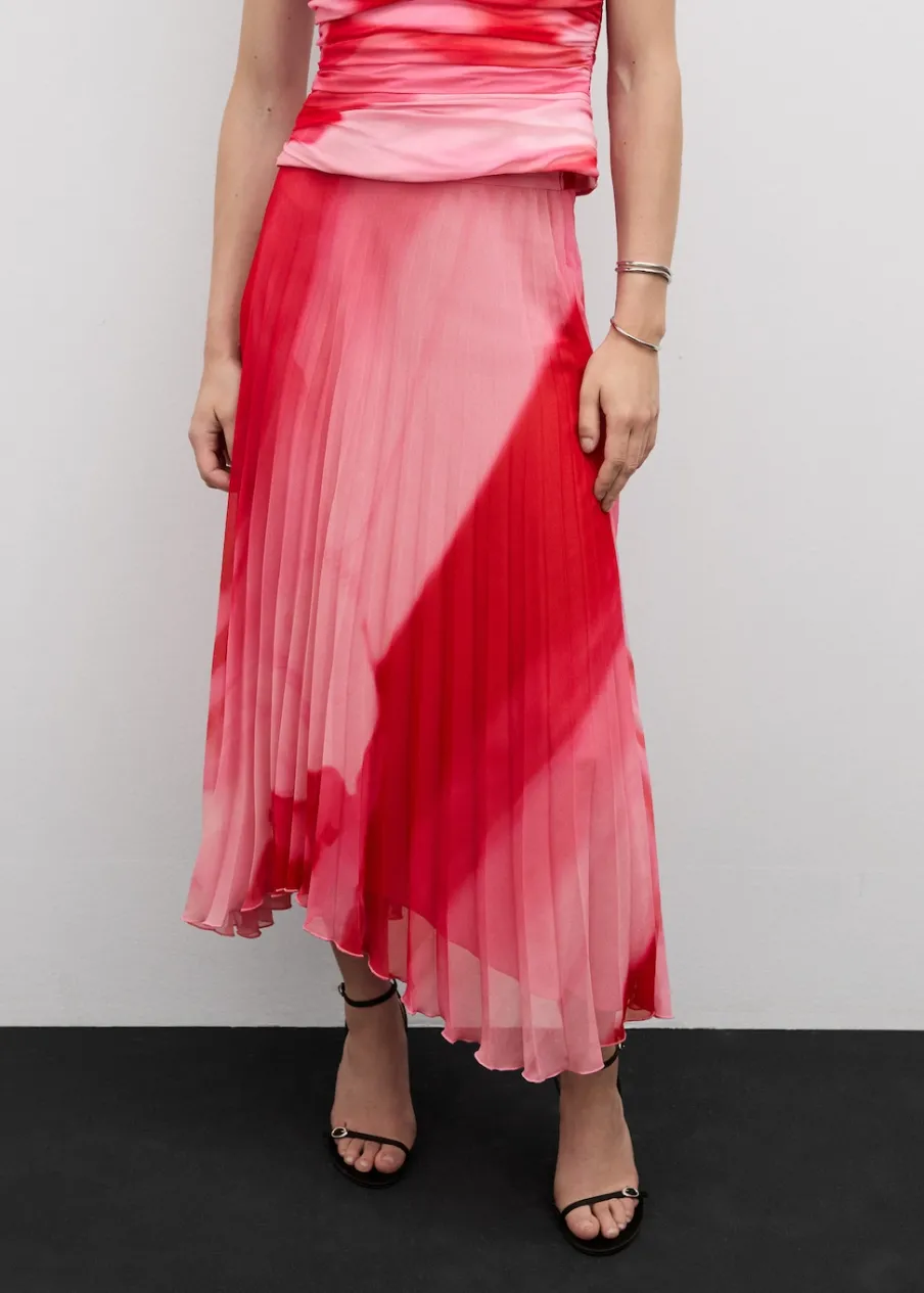 Lejąca tkanina. Krój do kolan. Plisowanie. Kryte zapięcie na zamek z boku. Asymetryczny dół. Wewnętrzna podszewka. Total look. Kolekcja wizytowa. Nadruk.