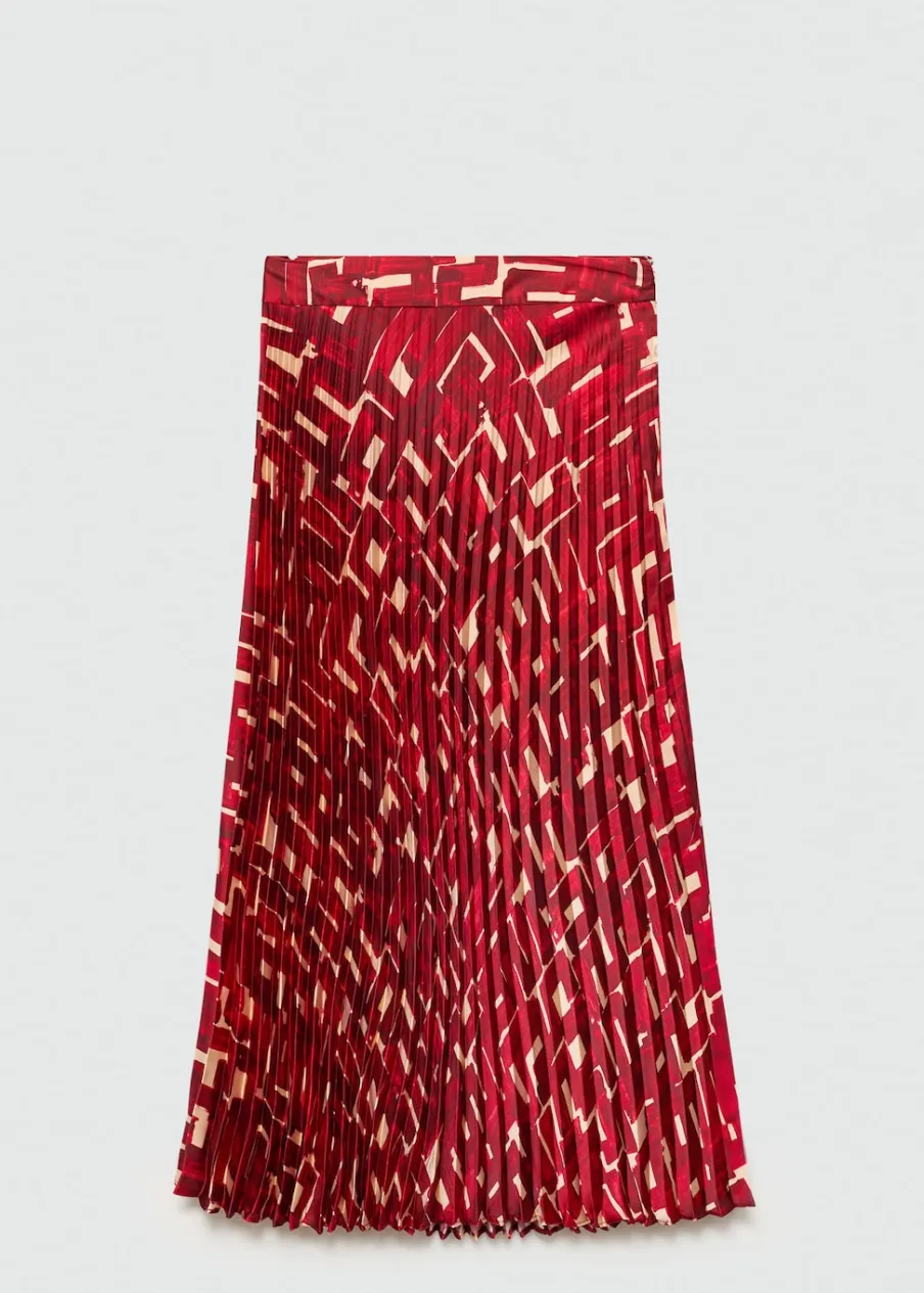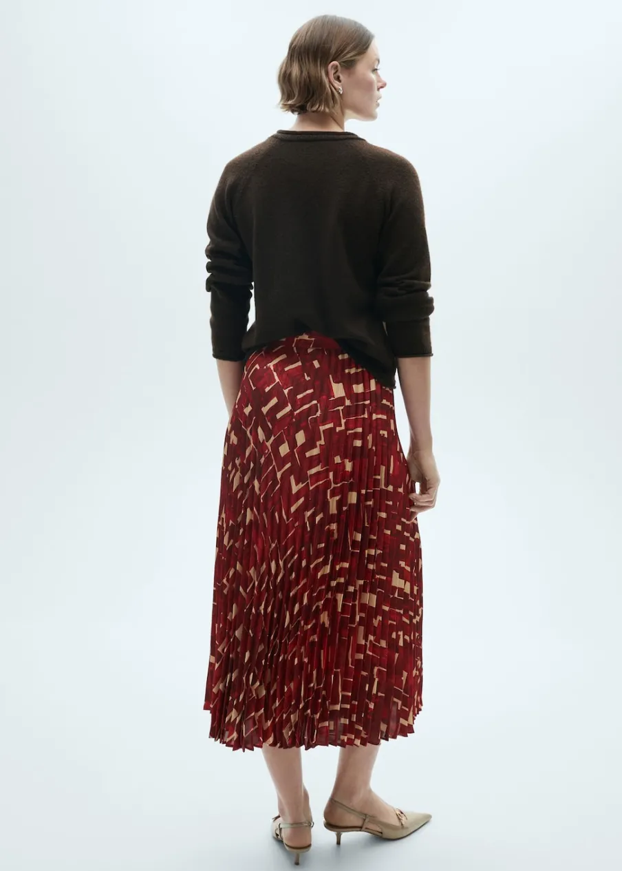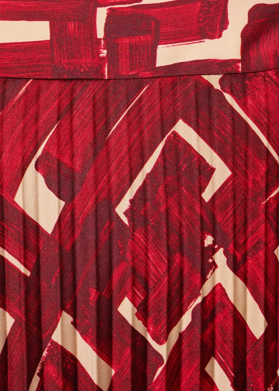 Lejąca tkanina. Satynowa tkanina. Średni stan. Model evasé. Model długi. Nadruk. Plisowanie. Model prosty. Kryte zapięcie na zamek z boku. Modelka ma 180 cm wzrostu i nosi rozmiar S/36.