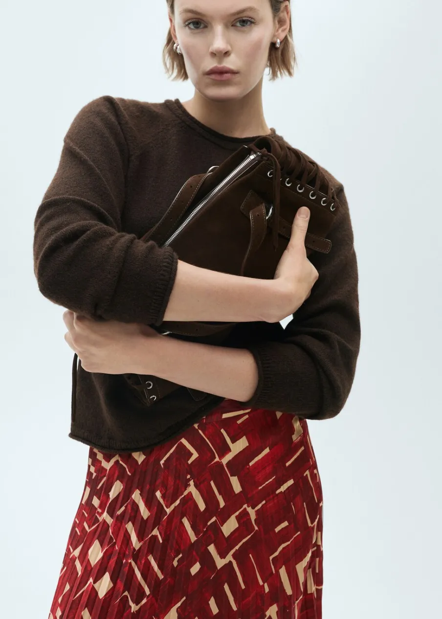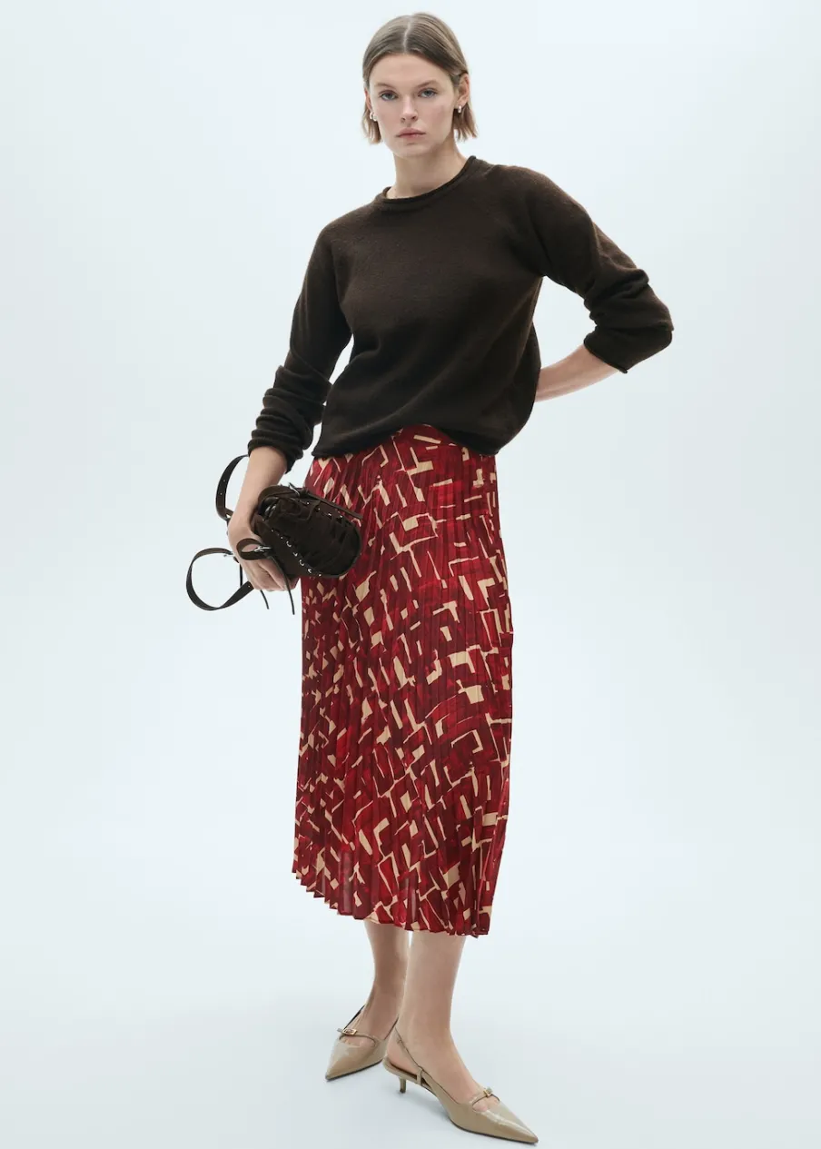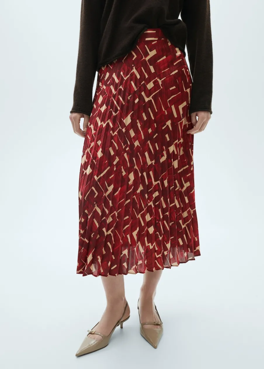 Lejąca tkanina. Satynowa tkanina. Średni stan. Model evasé. Model długi. Nadruk. Plisowanie. Model prosty. Kryte zapięcie na zamek z boku. Modelka ma 180 cm wzrostu i nosi rozmiar S/36.