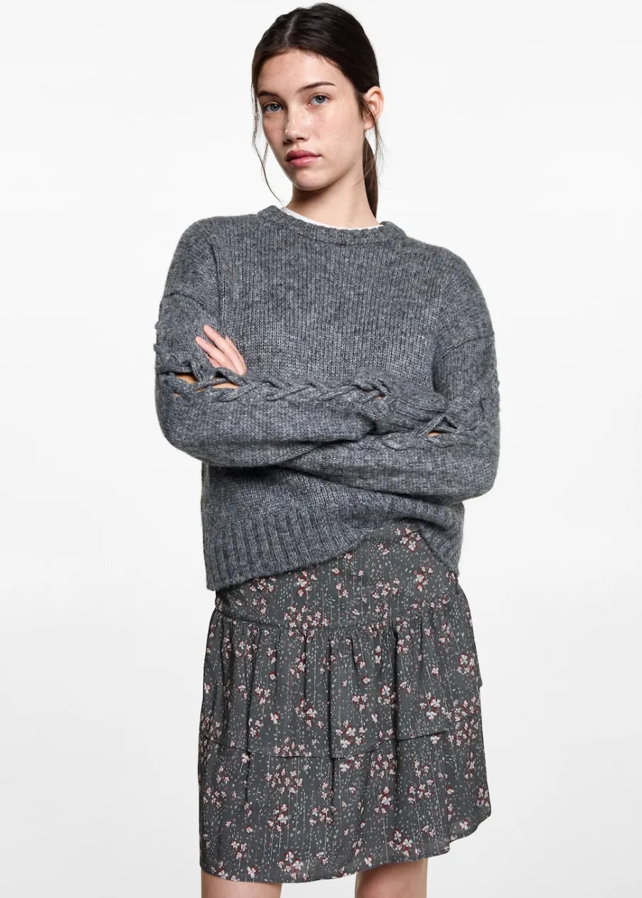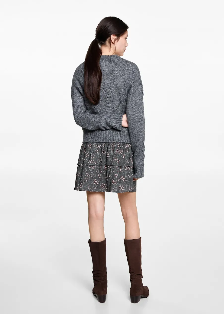 OpisLejąca tkanina. Ozdoba z metaliczną nicią. Kwiatowy wzór. Model evasé. Model z falbankami. Kryte zapięcie na z…