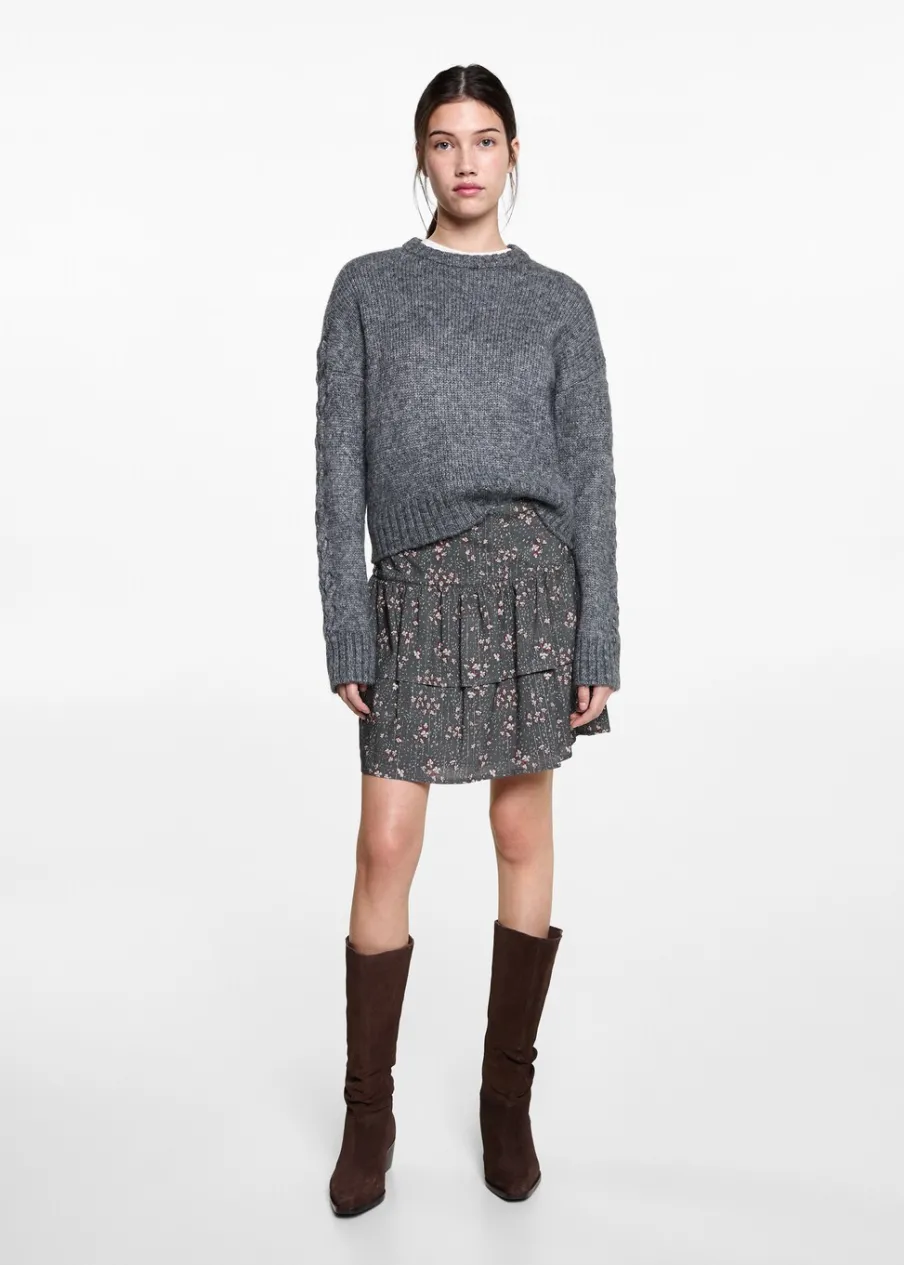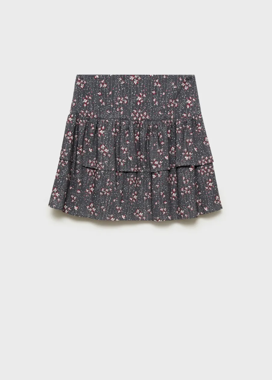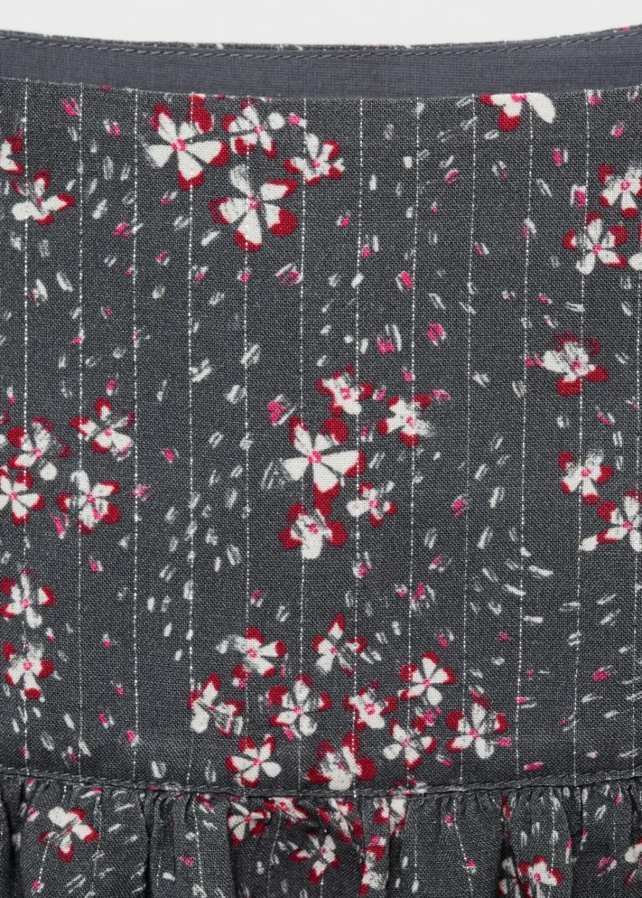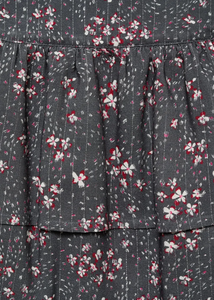 Lejąca tkanina. Ozdoba z metaliczną nicią. Kwiatowy wzór. Model evasé. Model z falbankami. Kryte zapięcie na zamek z boku.