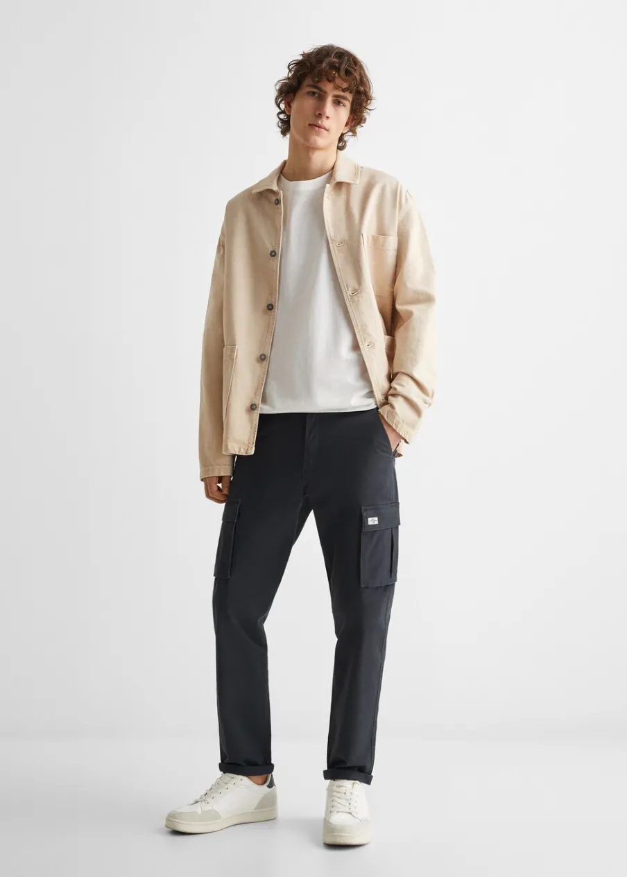 Tkanina bawełniana. Model prosty. Model długi. Dwie kieszenie. Dwie kieszenie cargo. Zapięcie na suwak i guzik.