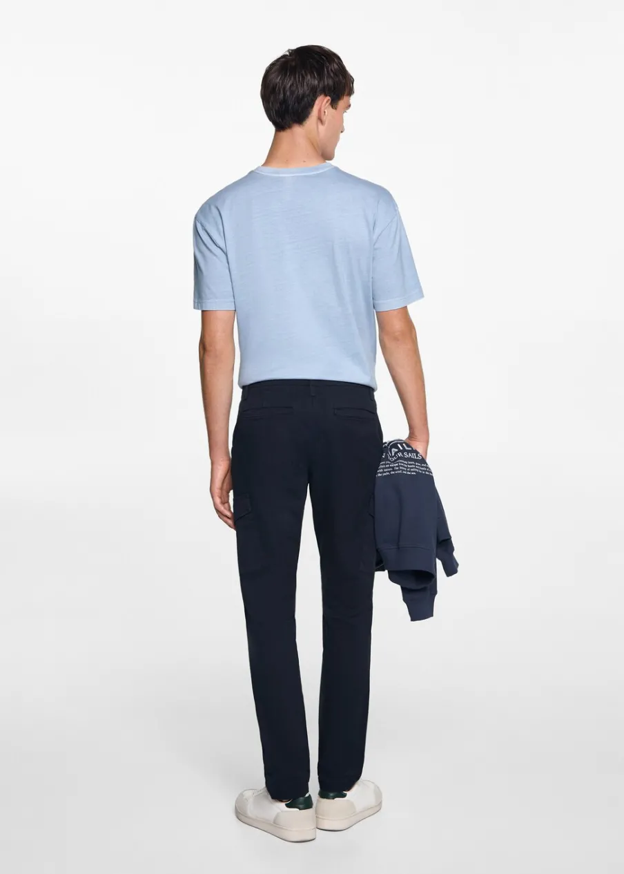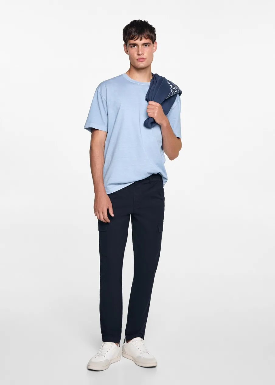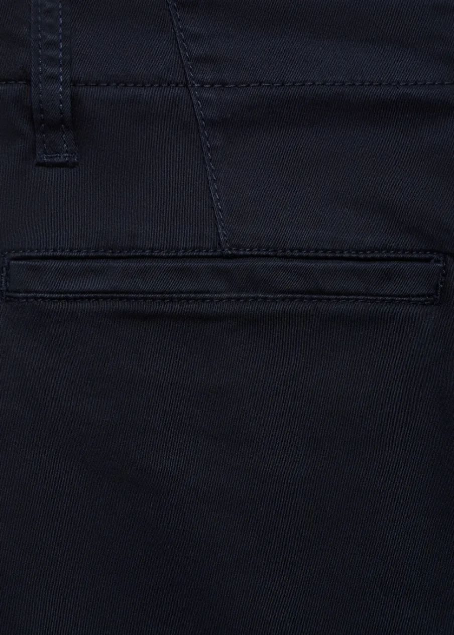 OpisTkanina z bawełną. Model prosty. Model długi. Dwie kieszenie cargo. Zapięcie na suwak i guzik.