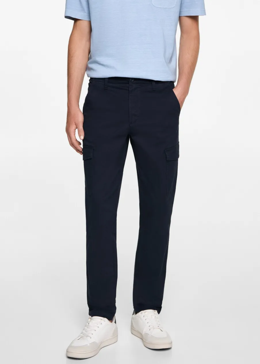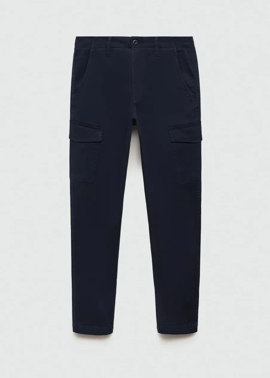 Tkanina z bawełną. Model prosty. Model długi. Dwie kieszenie cargo. Zapięcie na suwak i guzik.