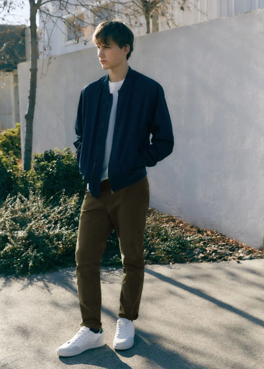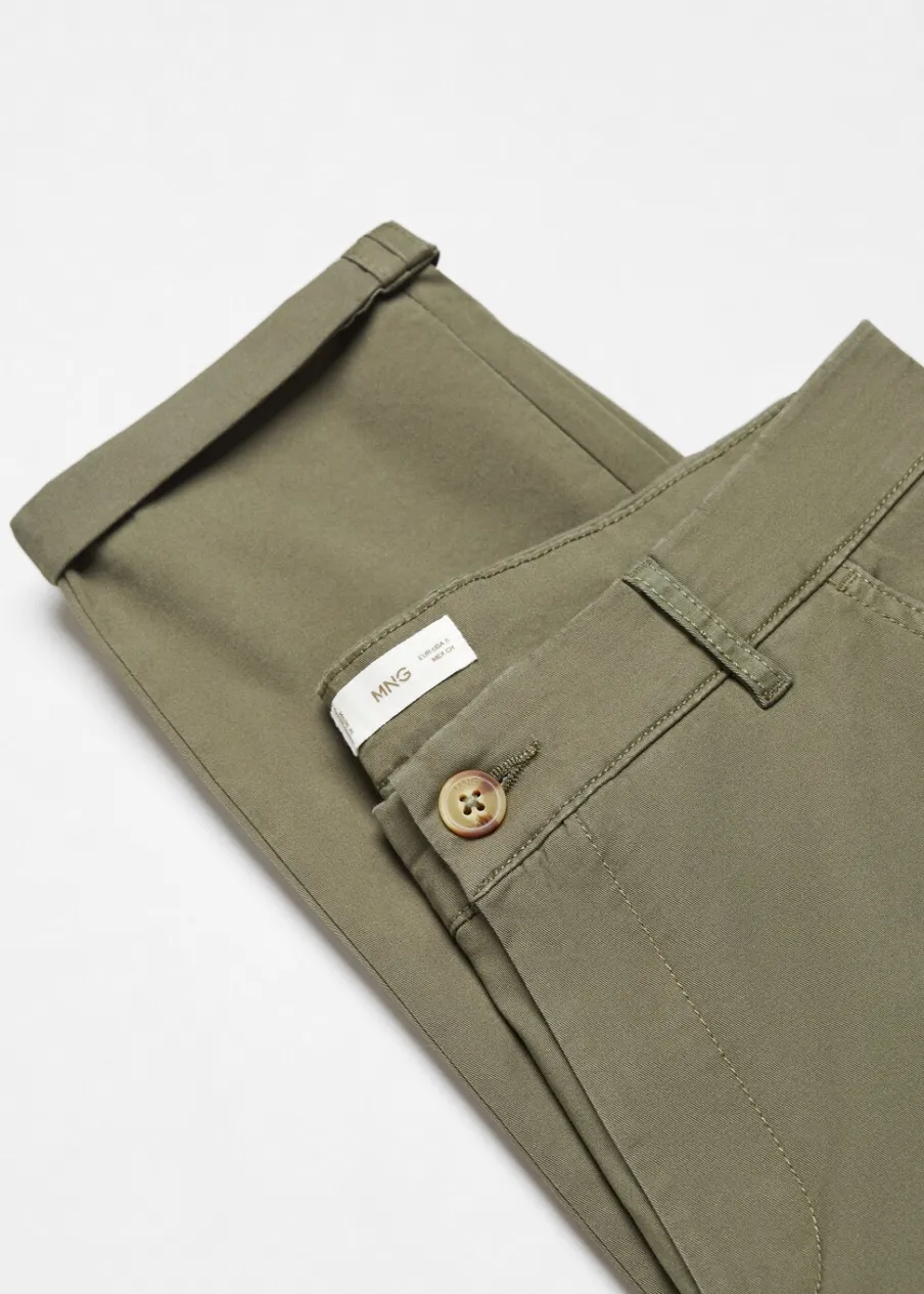 OpisTkanina bawełniana. Model prosty. Model długi. Slim-fit. Cztery kieszenie. Zapięcie na suwak i guzik.