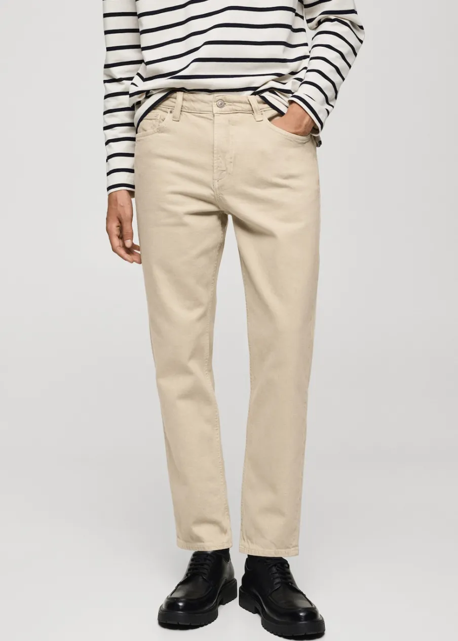 Tapered fit: nogawki szerokie w udach i zwężające się od kolan w dół. Tkanina bawełniana. Jeansowy styl. Średni stan. Deseń crop. Szlufki na pasek. Zapięcie na suwak i guzik. Dwie kieszenie boczne. Dwie kieszenie nakładane z tyłu. Model ma 185 cm wzrostu i nosi rozmiar 42.