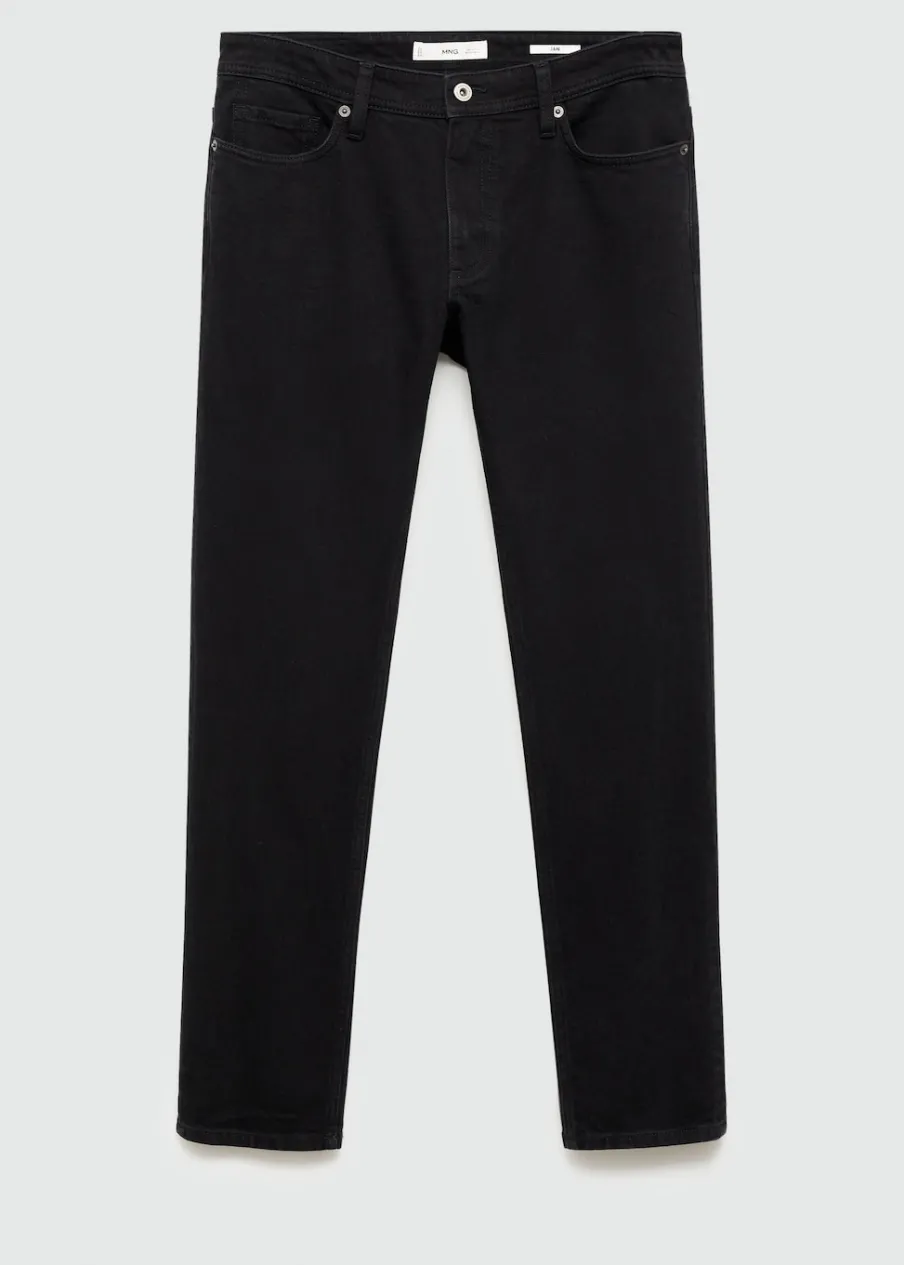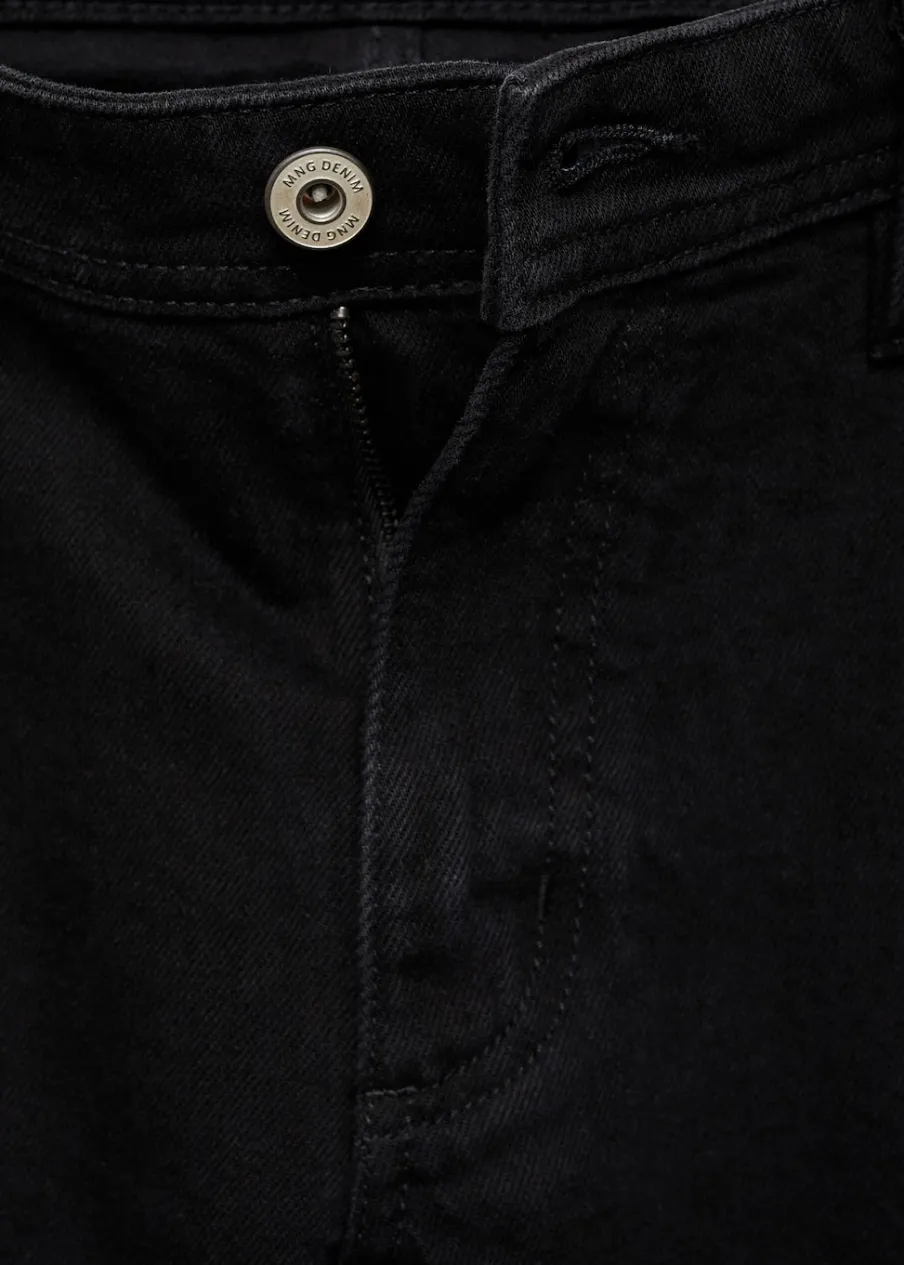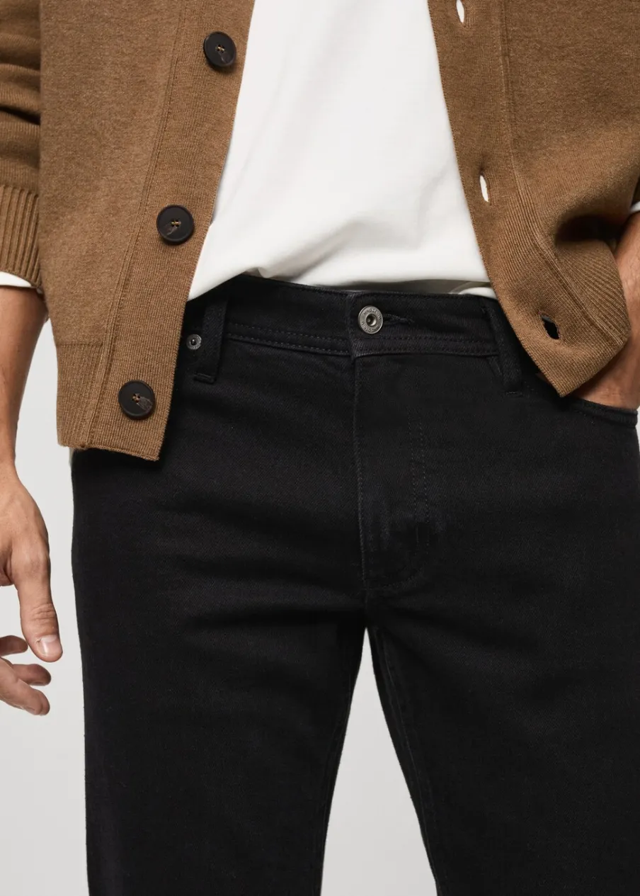 Slim-fit. Tkanina bawełniana. Czarny. Jeansowy styl. Szlufki na pasek. Zapięcie na suwak i guzik. Dwie kieszenie boczne. Kieszeń na bilon. Dwie kieszenie nakładane z tyłu. Model ma 185 cm wzrostu i nosi rozmiar 42.