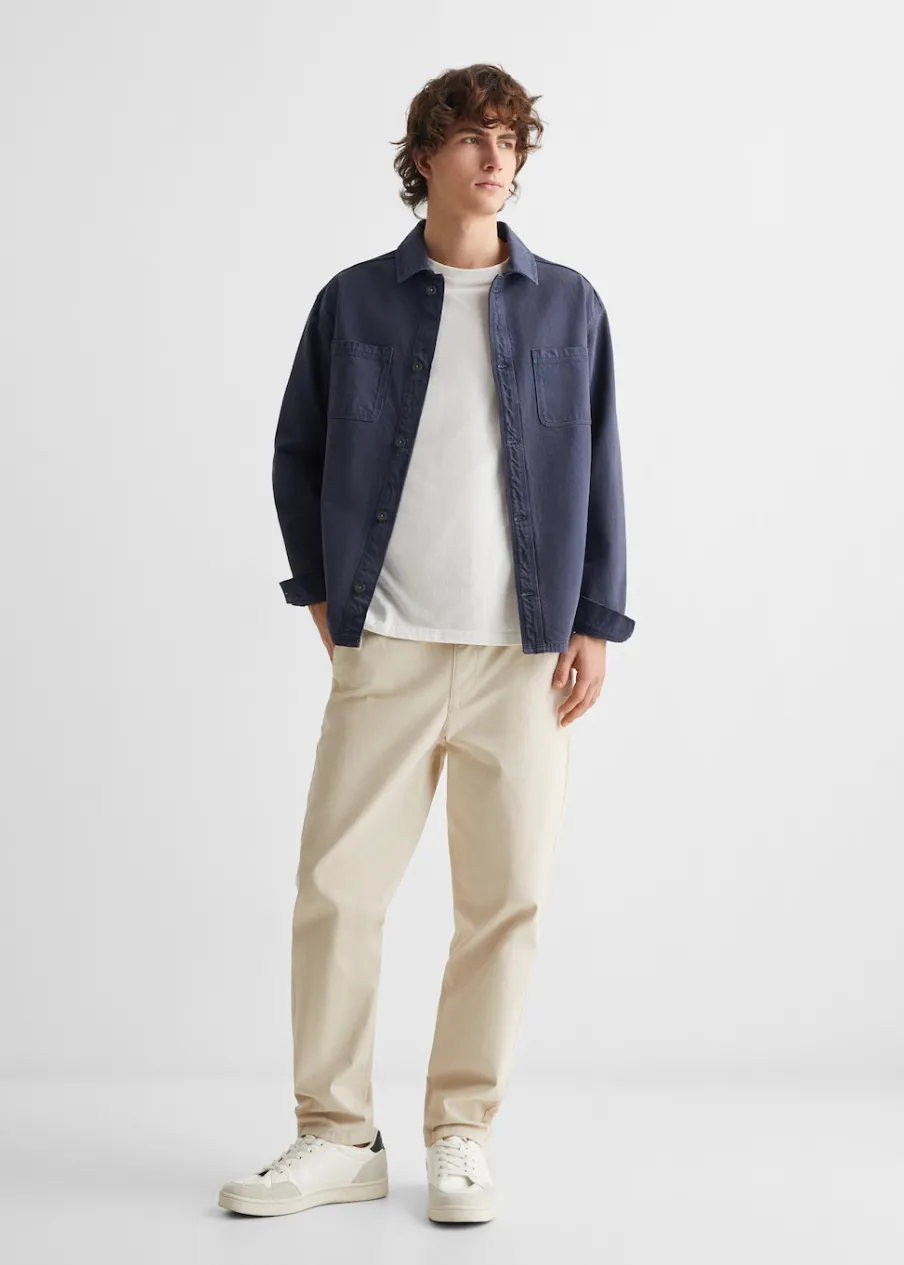 Tkanina z bawełną. Model prosty. Model długi. Elastyczny pas ze sznurkiem. Dwie kieszenie nakładane z tyłu.