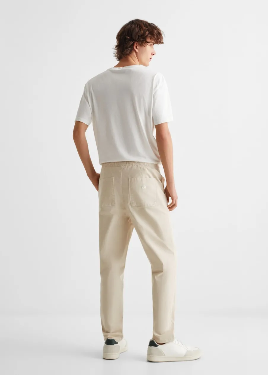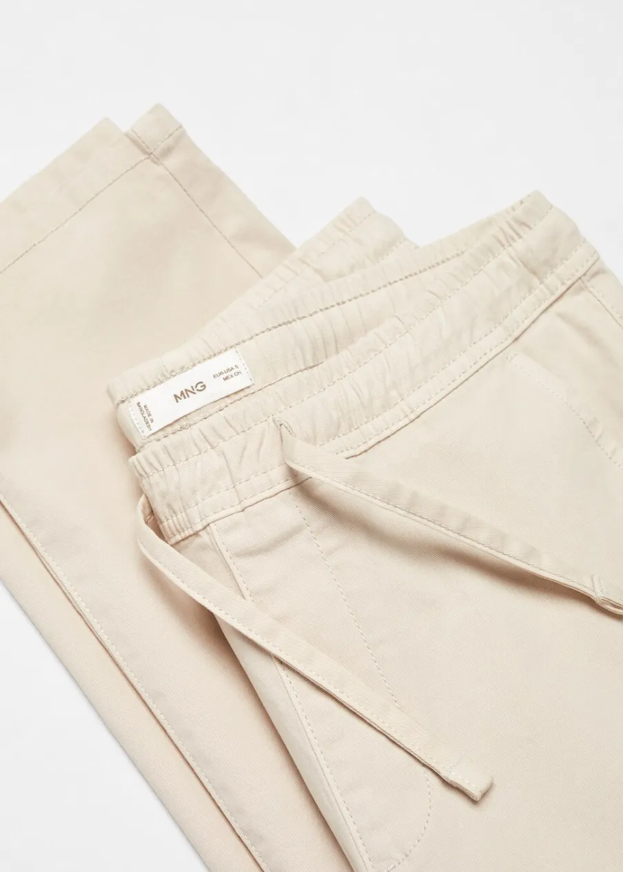 OpisTkanina z bawełną. Model prosty. Model długi. Elastyczny pas ze sznurkiem. Dwie kieszenie nakładane z tyłu.