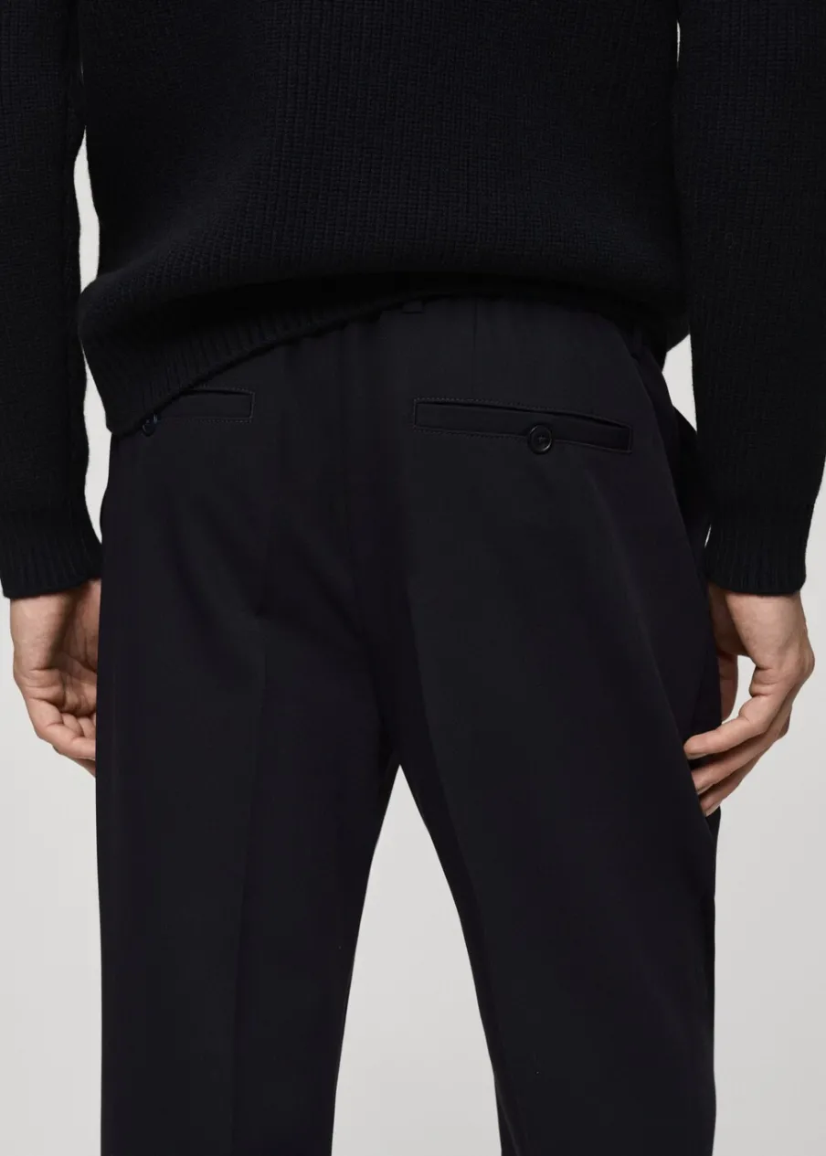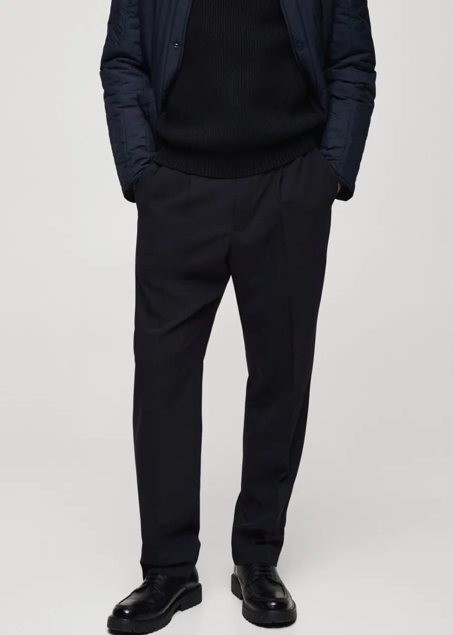 Kolor lodowy dostępny tylko online. Krój regular. Lejąca tkanina. Zakładki z przodu. Szlufki na pasek. Zapięcie na suwak i guzik. Dwie kieszenie z przodu. Tylna kieszeń wpuszczana zapinana na guzik. Model ma 185 cm wzrostu i nosi rozmiar 42.