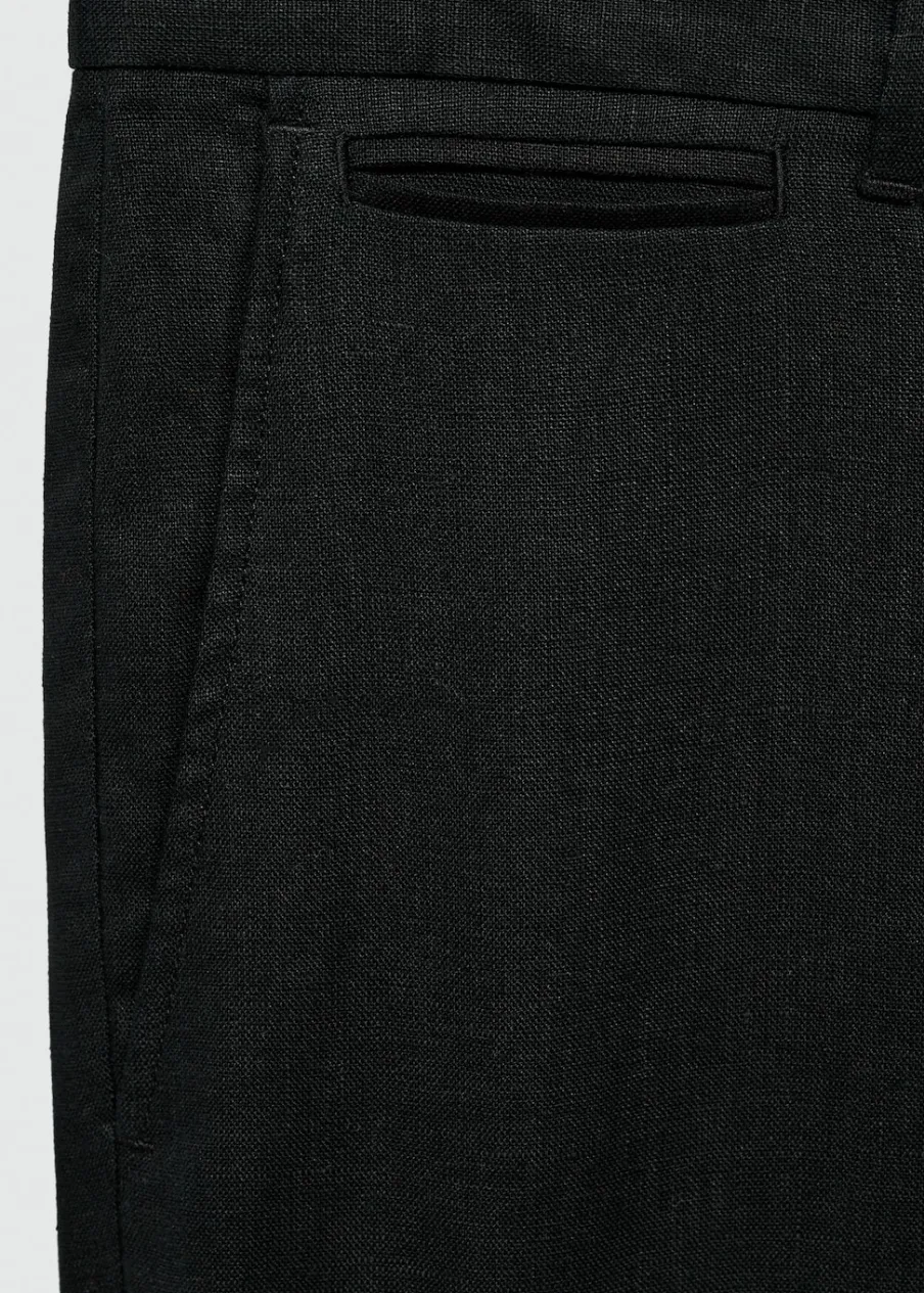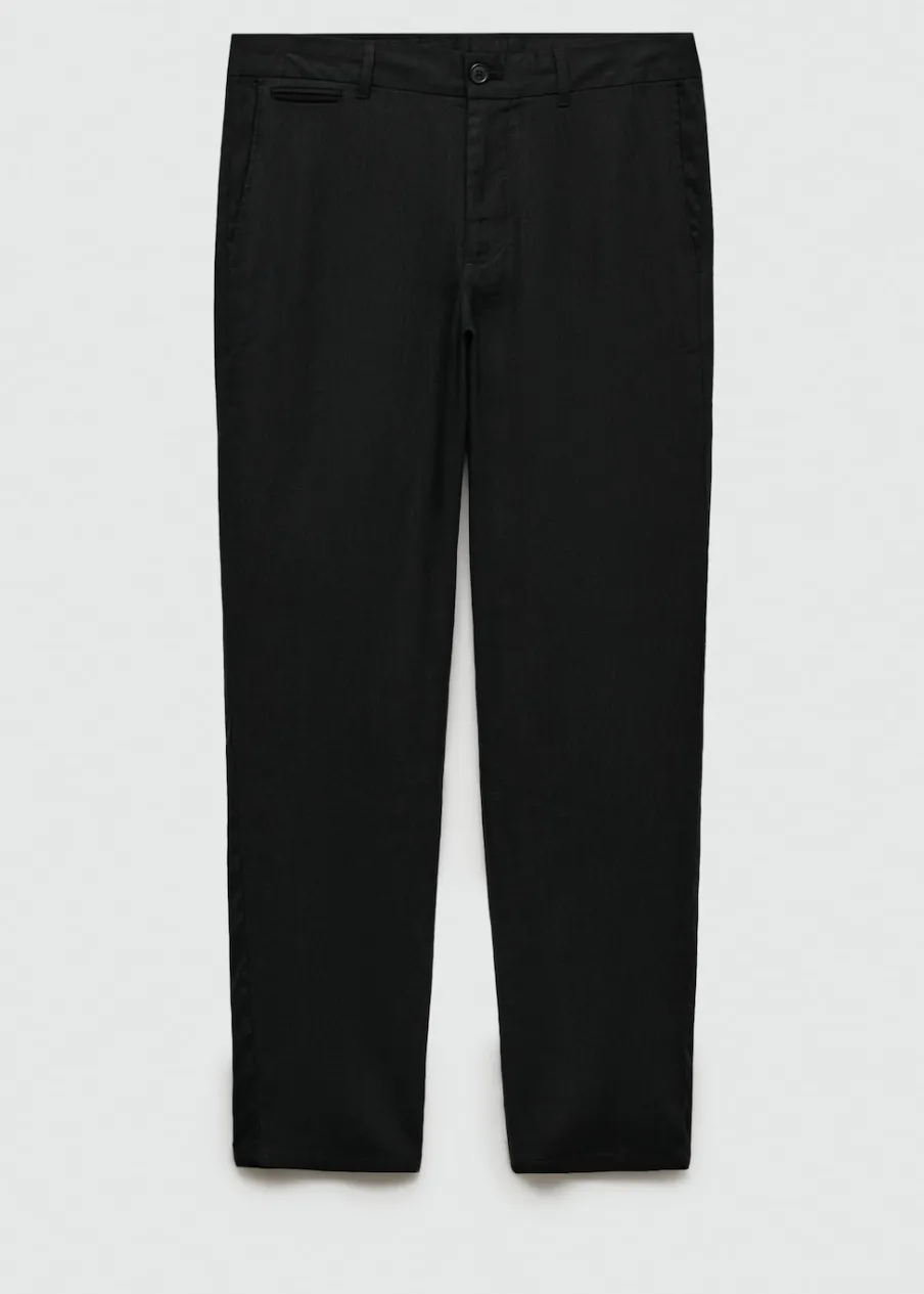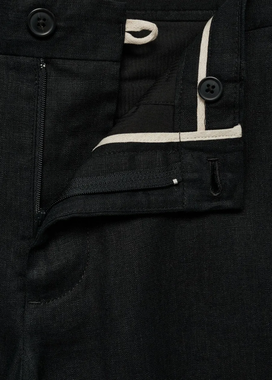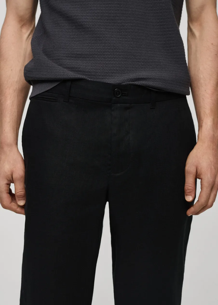 Slim-fit. Tkanina z 100% lnu. Średni stan. Szlufki na pasek. Dwurzędowe zapięcie z przodu na guziki i zamek. Dwie kieszenie z przodu. Kieszonka na monety na wysokości biodra. Dwie wpuszczane kieszenie z guzikiem z tyłu. Model ma 187 cm wzrostu i nosi rozmiar 42. Model standardowy.