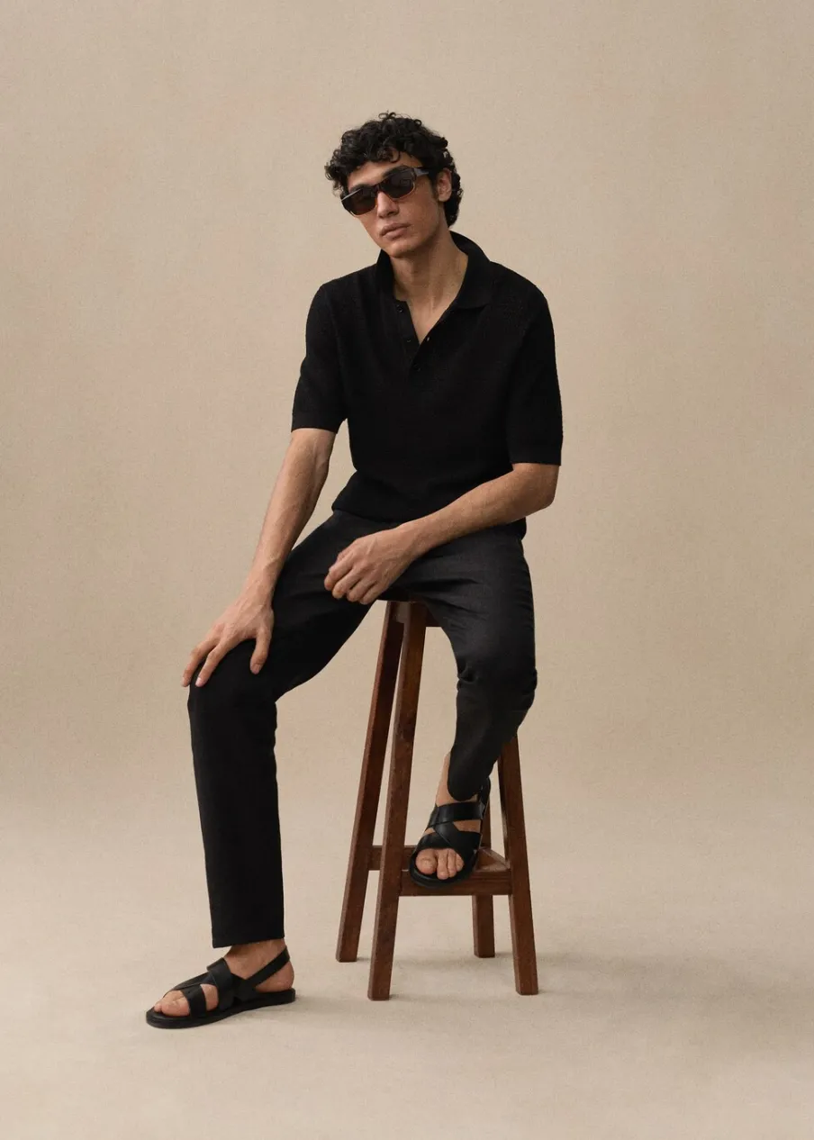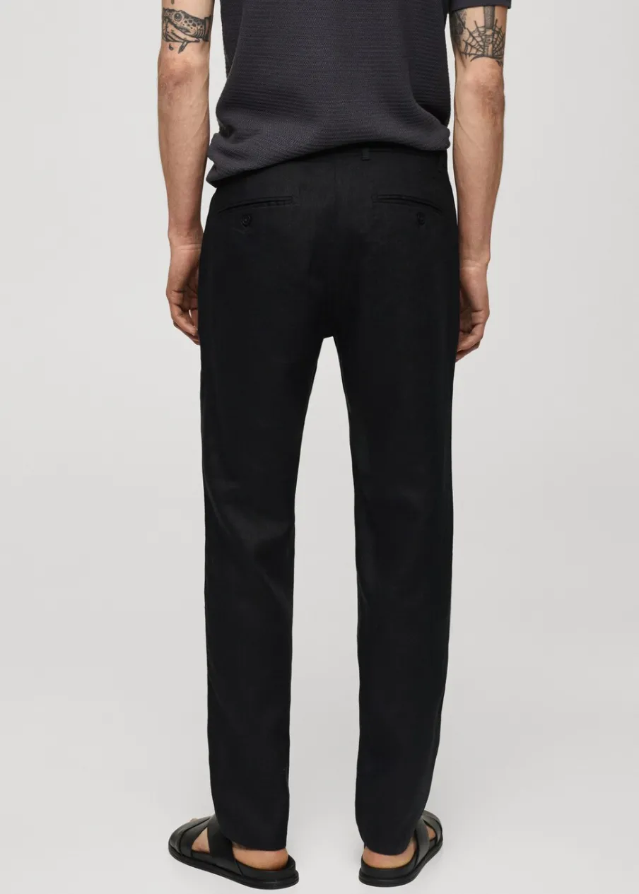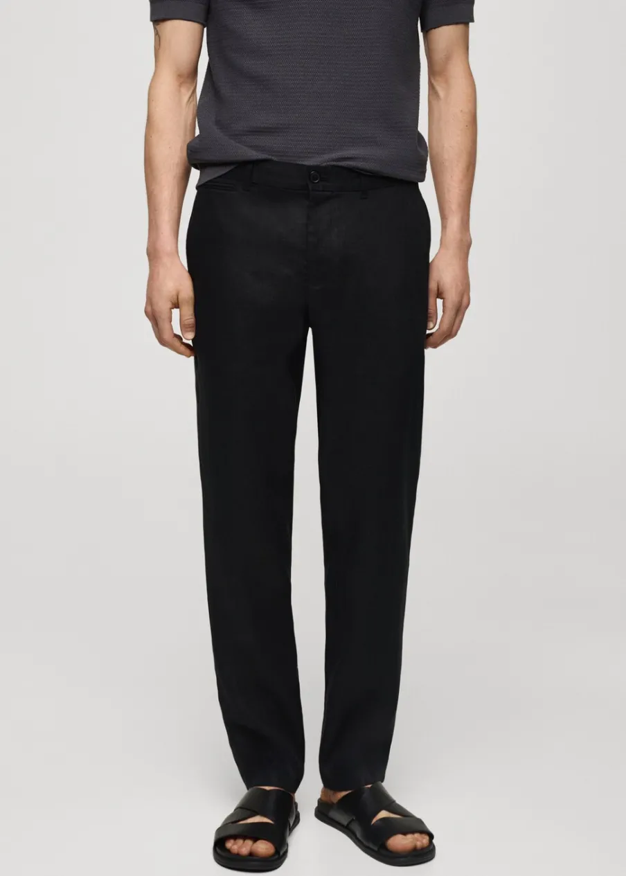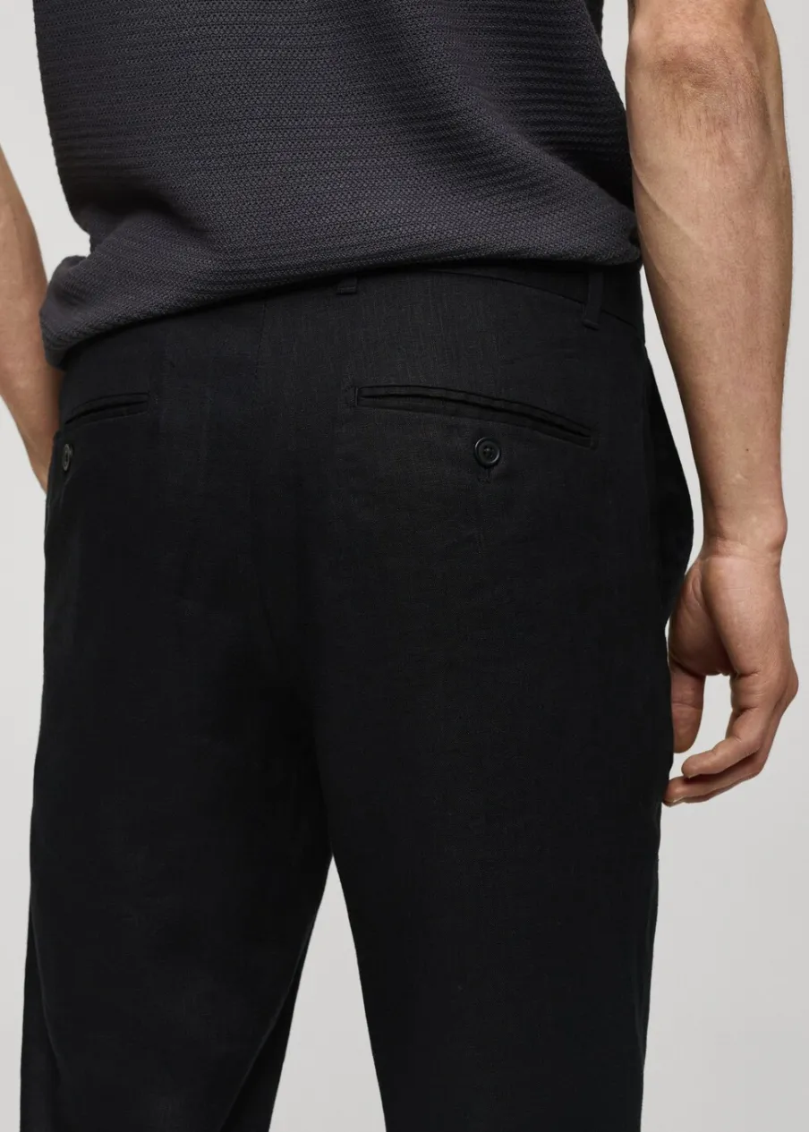 Slim-fit. Tkanina z 100% lnu. Średni stan. Szlufki na pasek. Dwurzędowe zapięcie z przodu na guziki i zamek. Dwie kieszenie z przodu. Kieszonka na monety na wysokości biodra. Dwie wpuszczane kieszenie z guzikiem z tyłu. Model ma 187 cm wzrostu i nosi rozmiar 42. Model standardowy.