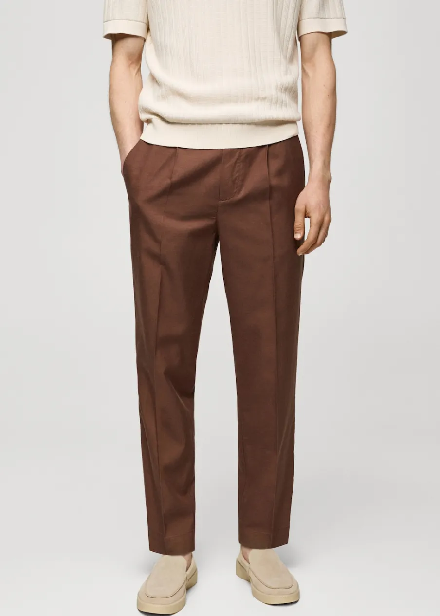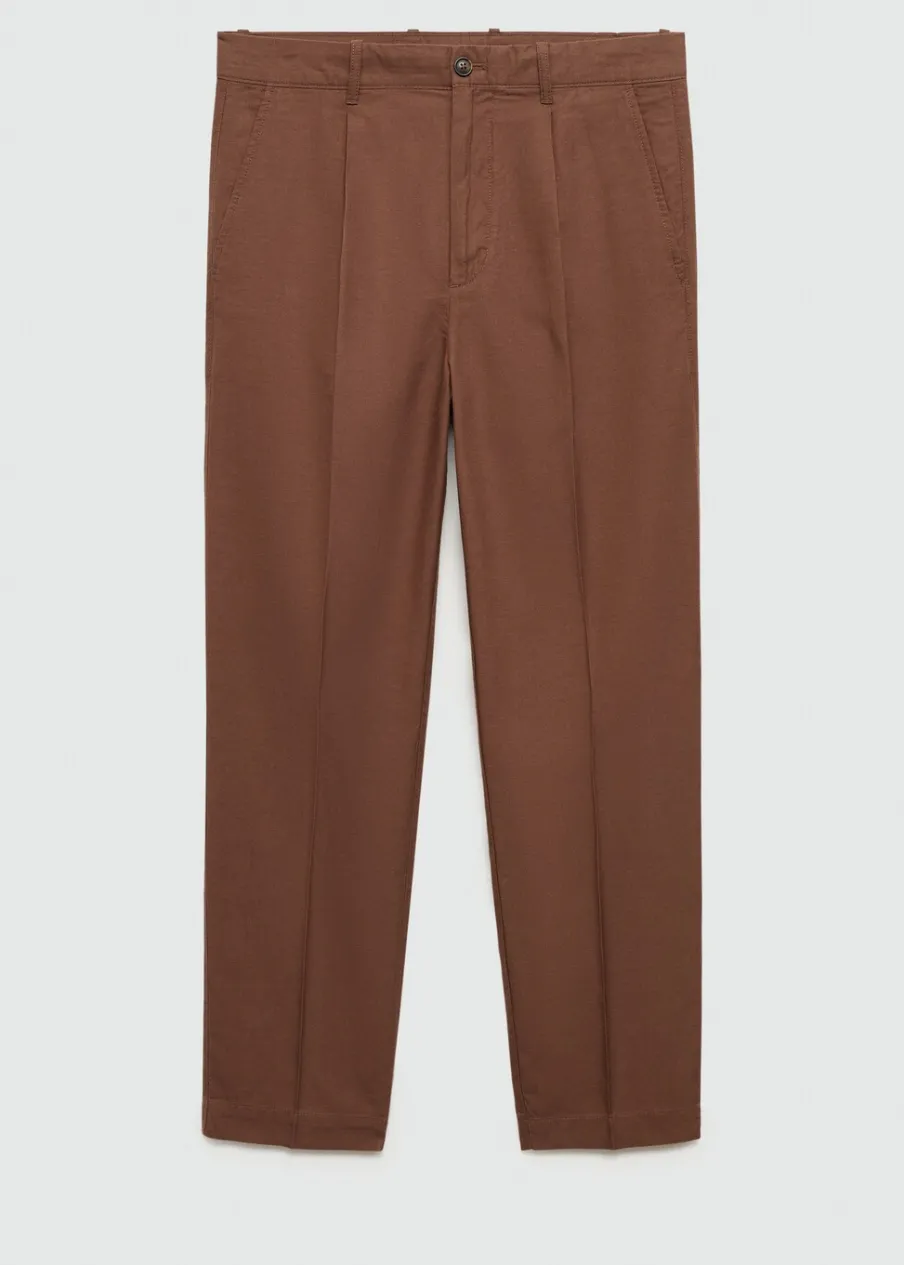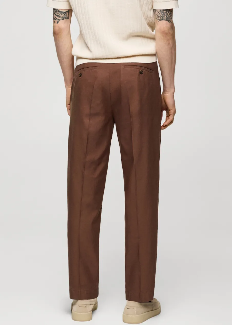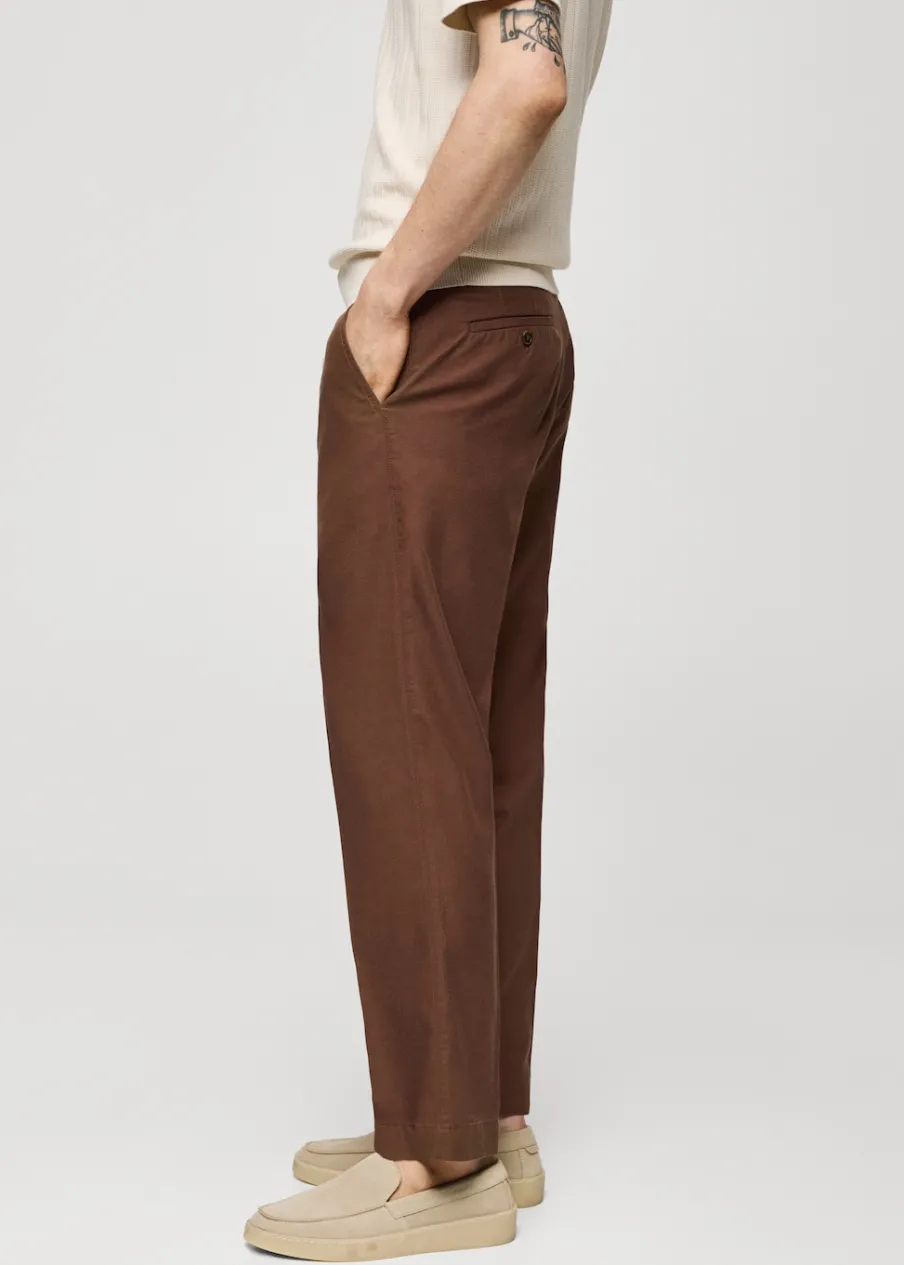 Zaszewki z przodu. Szlufki na pasek. Dwurzędowe zapięcie z przodu na guziki i zamek. Dwie kieszenie z przodu. Dwie wpuszczane kieszenie z guzikiem z tyłu. Model ma 187 cm wzrostu i nosi rozmiar 42. Tkanina mieszana z lyocellu, bawełny i lnu. Zaprasowany kant z przodu i z tyłu.