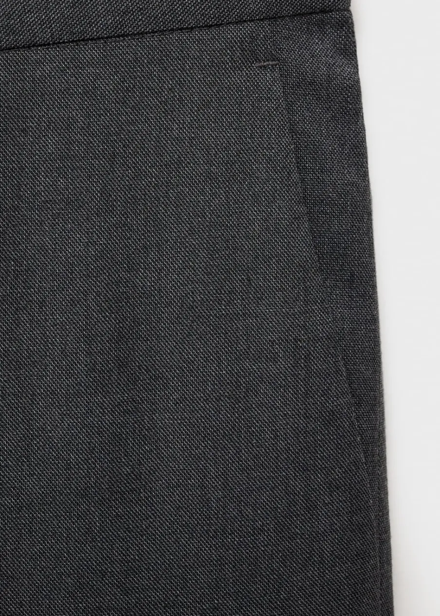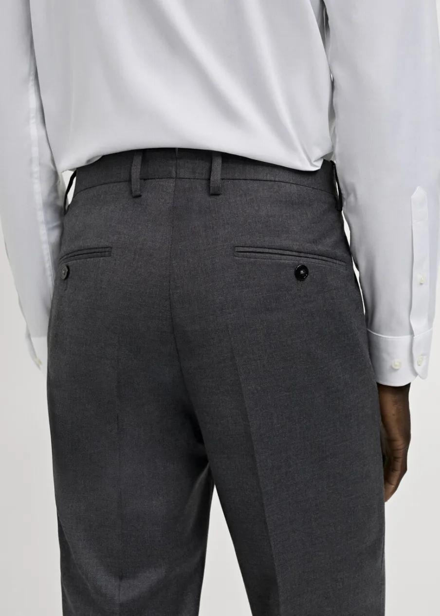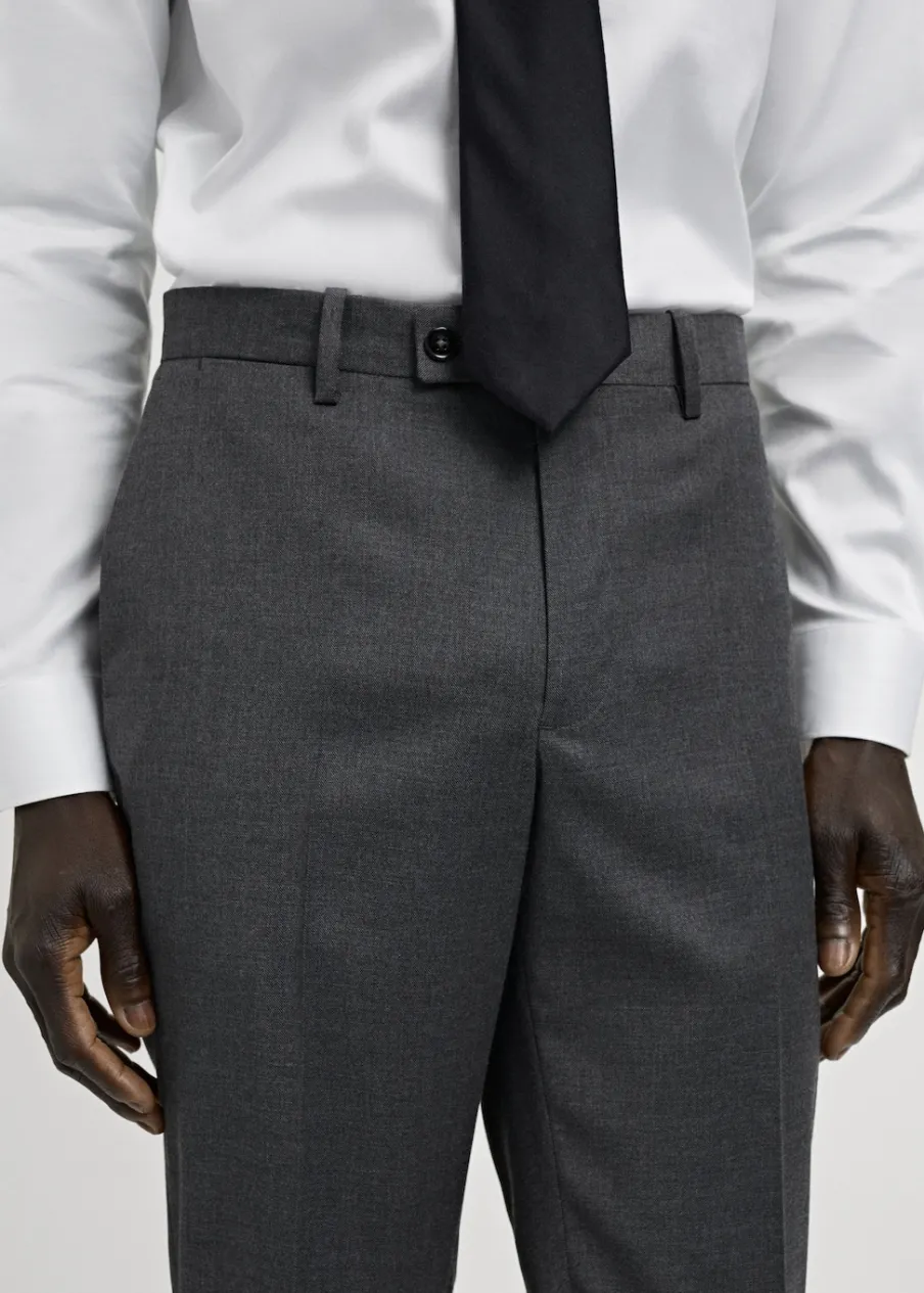 Slim-fit. Zaprasowany kant z przodu i z tyłu. Szlufki na pasek. Zapięcie na guziki, zamek i haftkę. Dwie kieszenie boczne. Dwie wpuszczane kieszenie z tyłu. Model ma 185 cm wzrostu i nosi rozmiar 42.