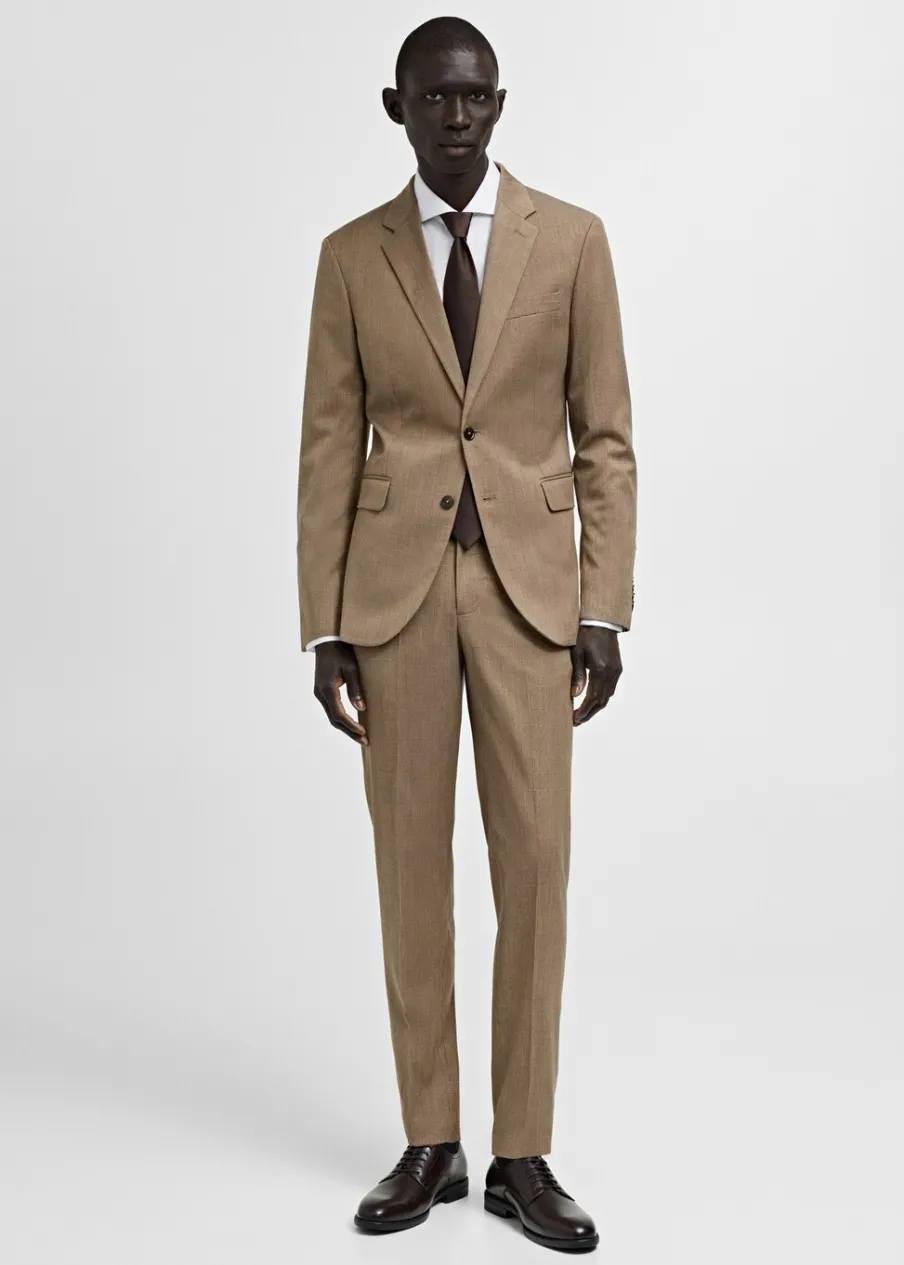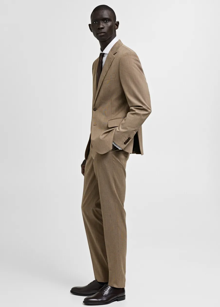 Slim Fit. Wzór w kratę księcia Walii. Zaprasowany kant z przodu i z tyłu. Szlufki na pasek. Dwie kieszenie boczne. Dwie wpuszczane kieszenie z tyłu. Zapięcie na zamek, haftkę i dwa guziki z przodu. Model ma 185 cm wzrostu i nosi rozmiar 42.
