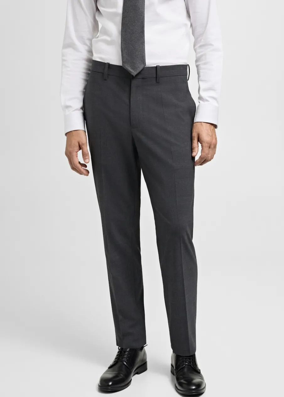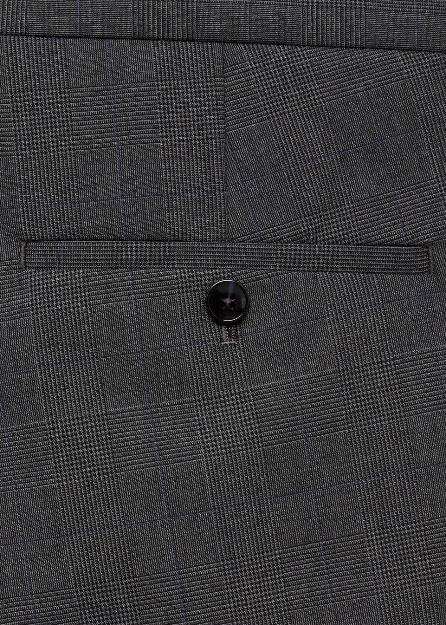 Super slim-fit. Comfort stretch: elastyczna tkanina dla większego komfortu. Wykonano z poliestru z recyklingu: wytrzymałego, oddychającego i łatwego w pielęgnacji materiału, dzięki czemu ubranie jest wygodne w użytkowaniu. Wzór w kratę Księcia Walii. Średni stan. Kryte zapięcie na guzik, haftkę i suwak. Szlufki na pasek. Dwie kieszenie boczne. Ukryta kieszonka na monety na wysokości biodra. Dwie wpuszczane kieszenie z guzikiem z tyłu. Model ma 185 cm wzrostu i nosi rozmiar 42. Zaprasowany kant z przodu i z tyłu. Komfort: to ubranie zapewnia pełną swobodę ruchu i odzyskuje swój pierwotny kształt.