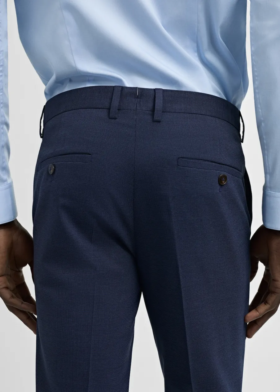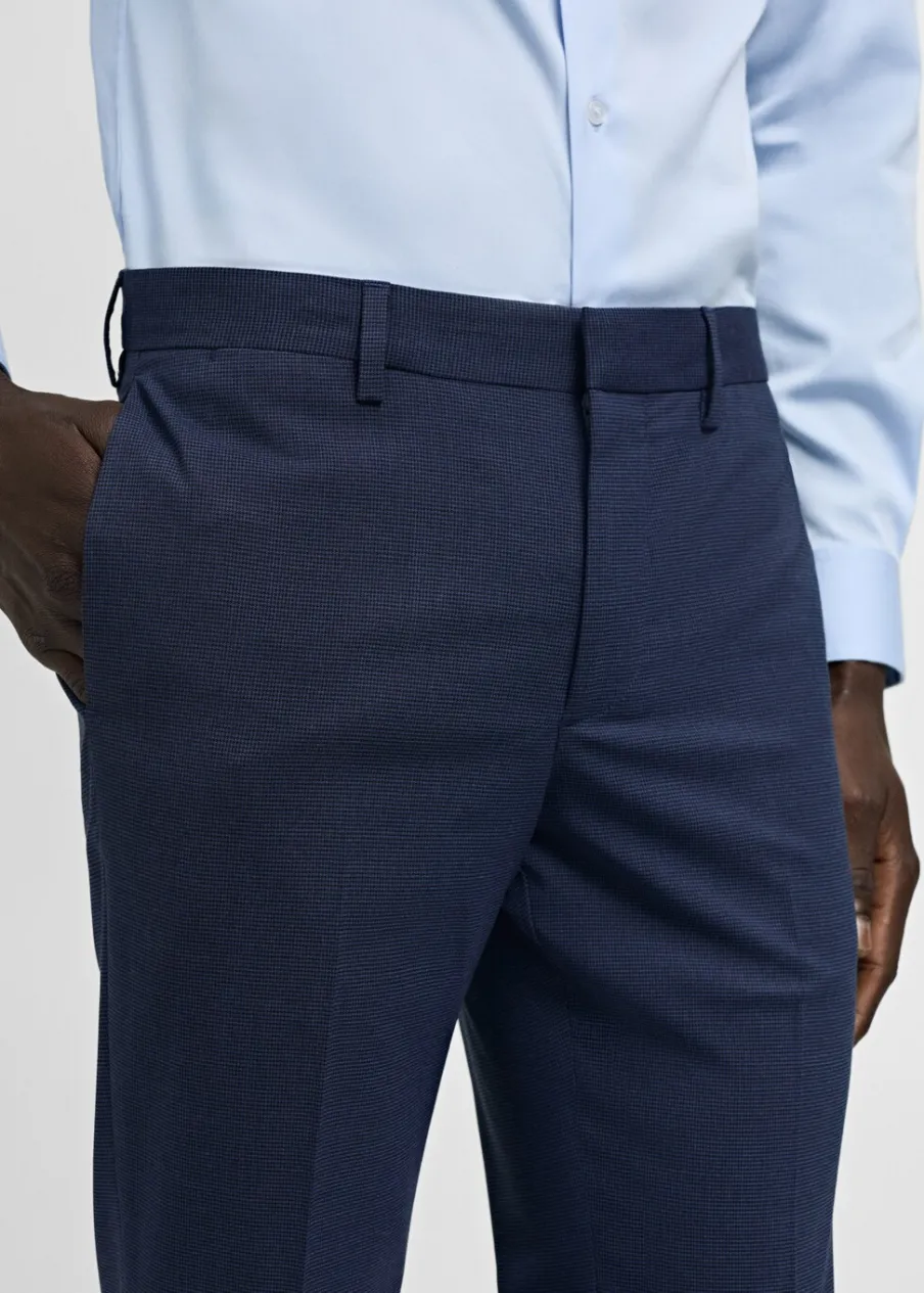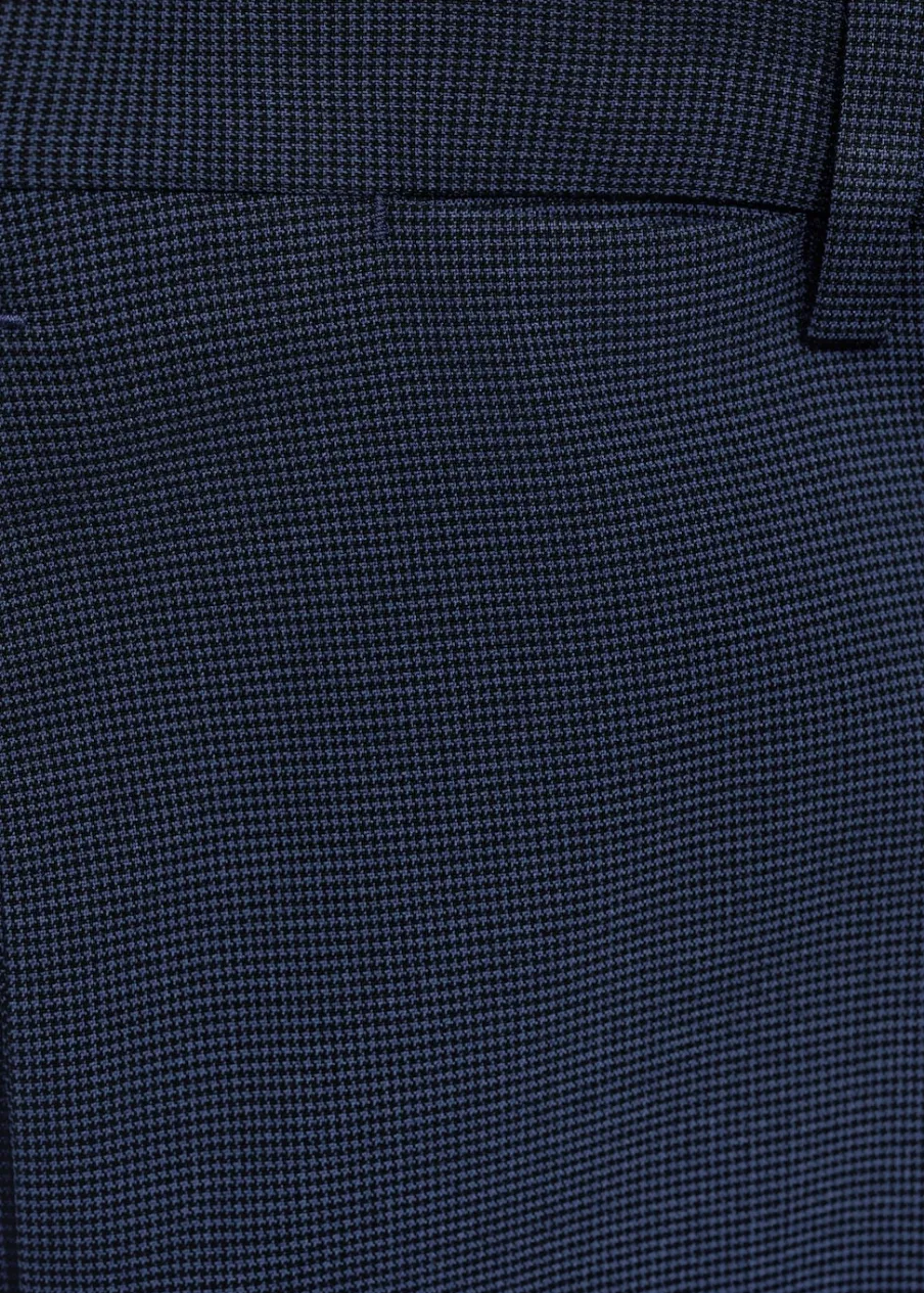 Super slim-fit. Comfort stretch: elastyczna tkanina dla większego komfortu. Wykonano z poliestru z recyklingu: wytrzymałego, oddychającego i łatwego w pielęgnacji materiału, dzięki czemu ubranie jest wygodne w użytkowaniu. Wzór w drobną kurzą stopkę. Średni stan. Kryte zapięcie na guzik, haftkę i suwak. Szlufki na pasek. Dwie kieszenie boczne. Ukryta kieszonka na monety na wysokości biodra. Dwie wpuszczane kieszenie z guzikiem z tyłu. Model ma 185 cm wzrostu i nosi rozmiar 42. Zaprasowany kant z przodu i z tyłu. Komfort: to ubranie zapewnia pełną swobodę ruchu i odzyskuje swój pierwotny kształt.