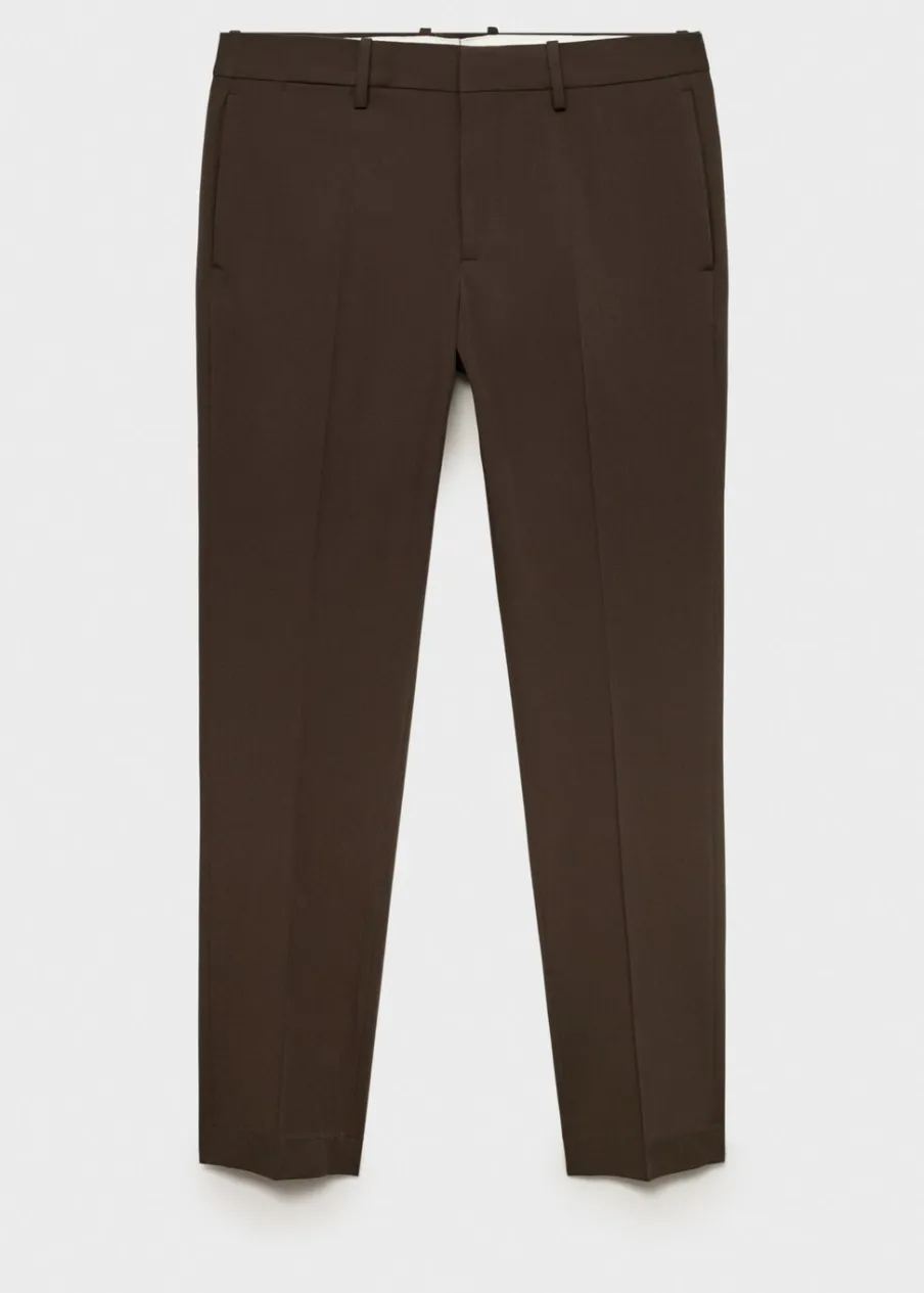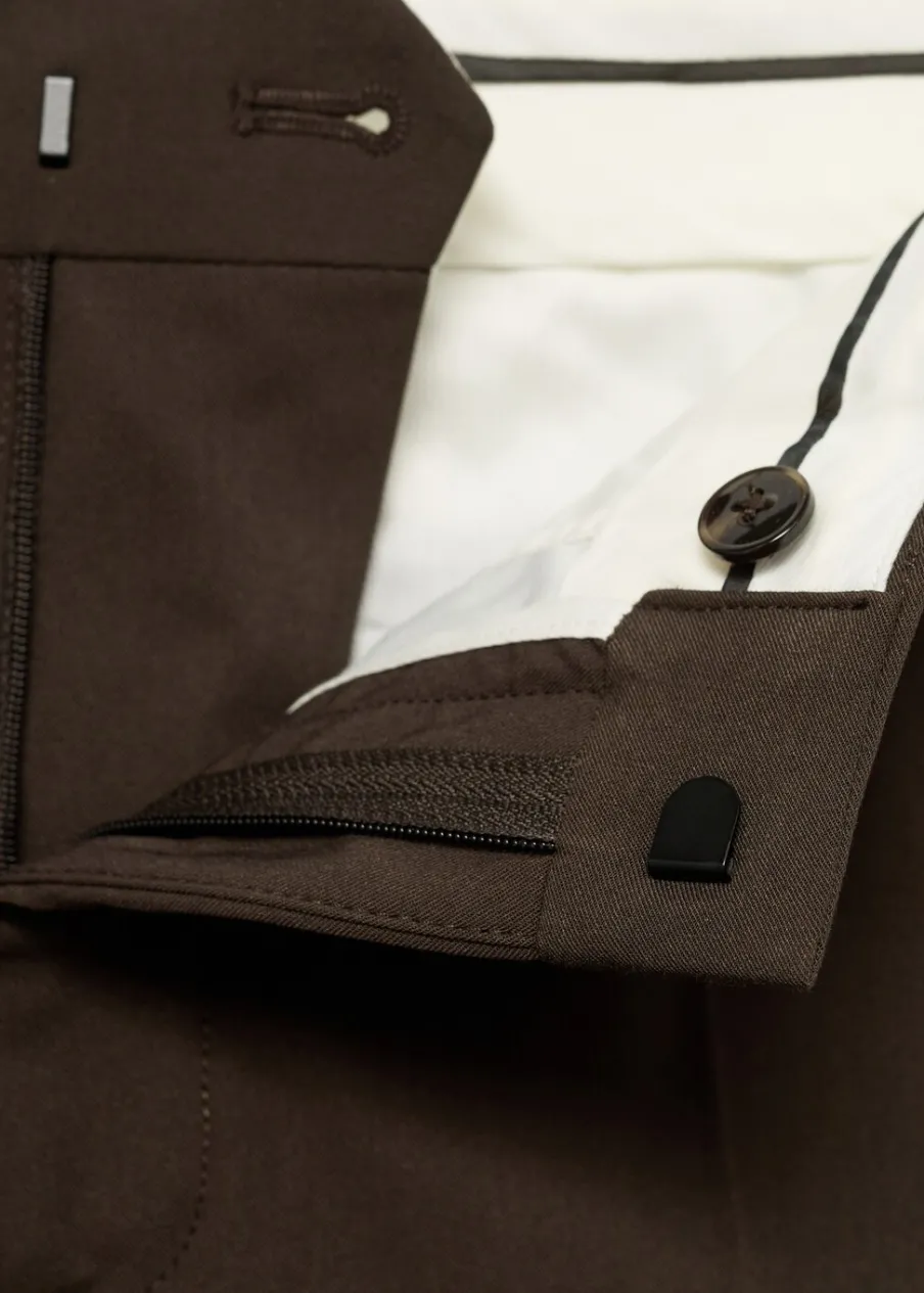 Slim-fit. Zaprasowany kant. Kryte zapięcie na guzik, haftkę i suwak. Kieszonka biletowa. Szlufki na pasek. Dwie kieszenie boczne. Dwie wpuszczane kieszenie z tyłu. Model ma 185 cm wzrostu i nosi rozmiar 42.