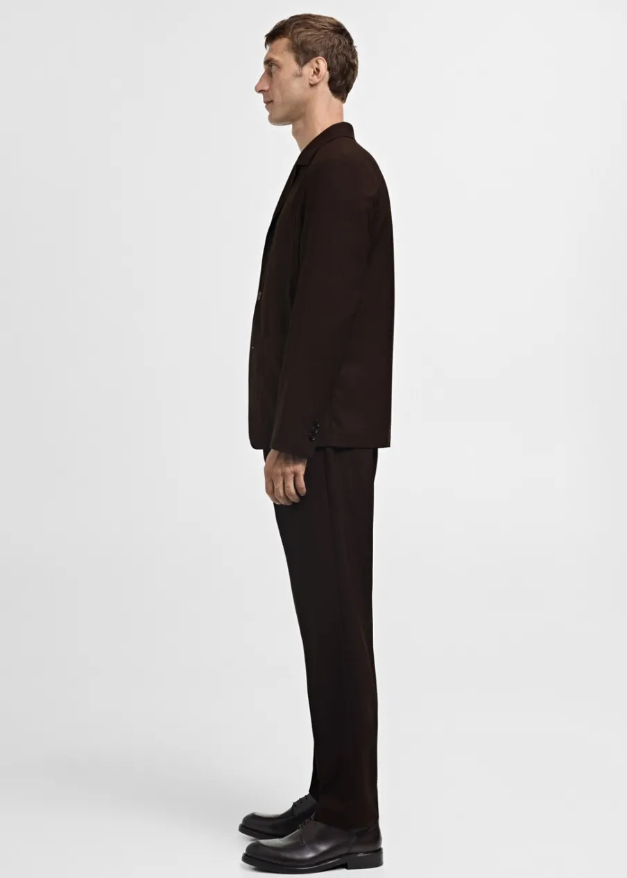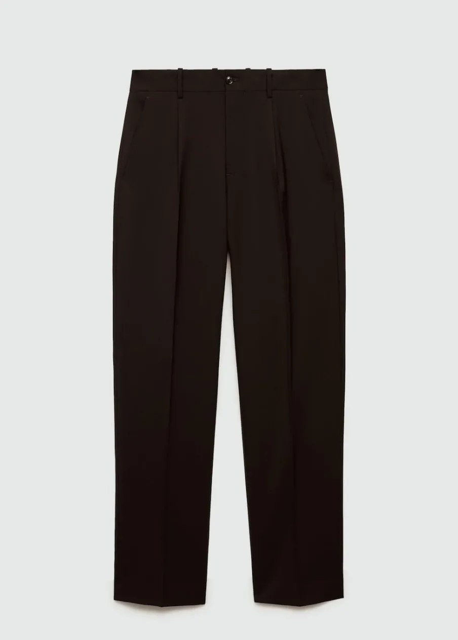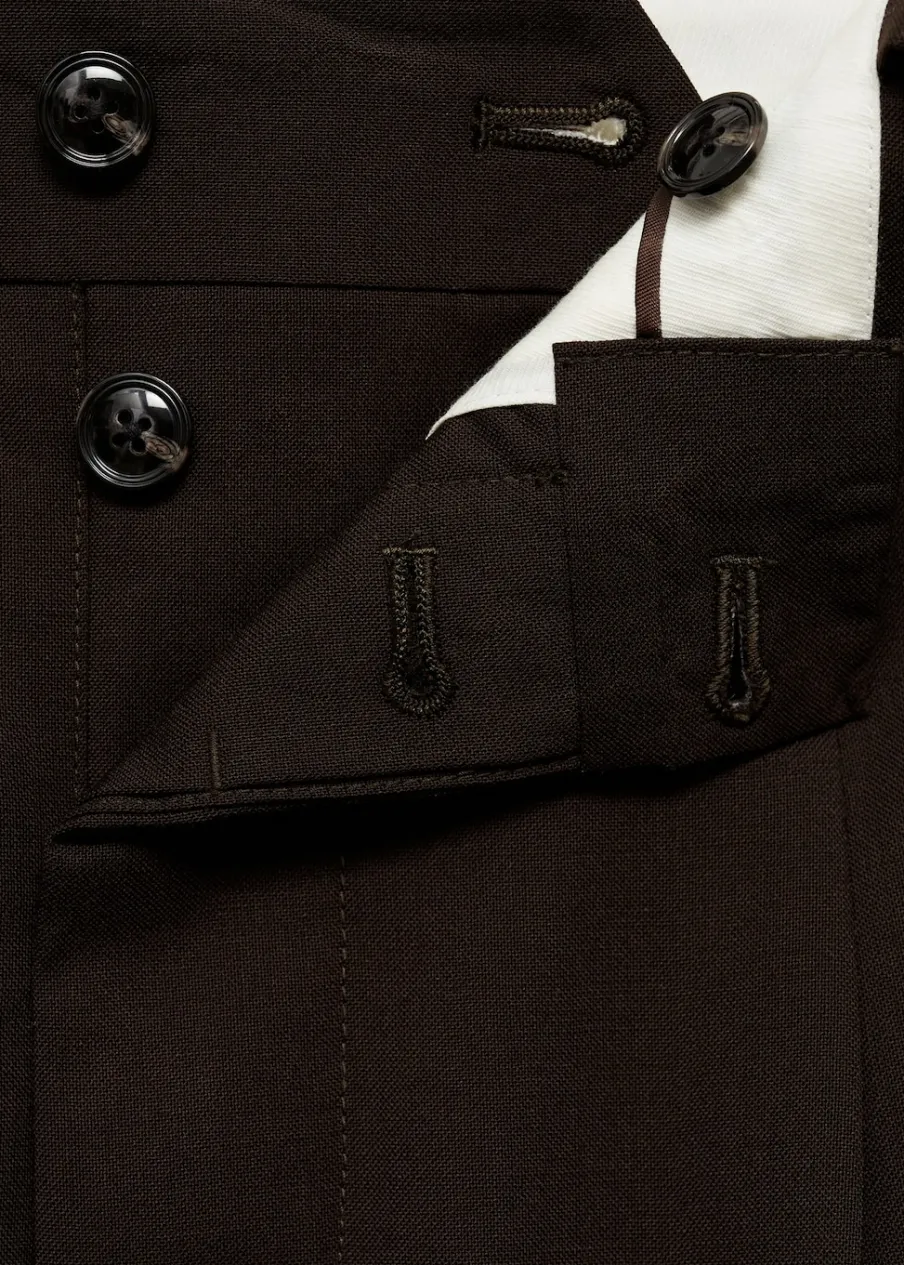Zaszewki z przodu. Dwurzędowe zapięcie z przodu na guziki i zamek. Dwie kieszenie boczne. Zaprasowany kant z przodu i z tyłu. Szlufki na pasek. Model ma 185 cm wzrostu i nosi rozmiar 42. Tkanina z 100% wełny. Krój regular.