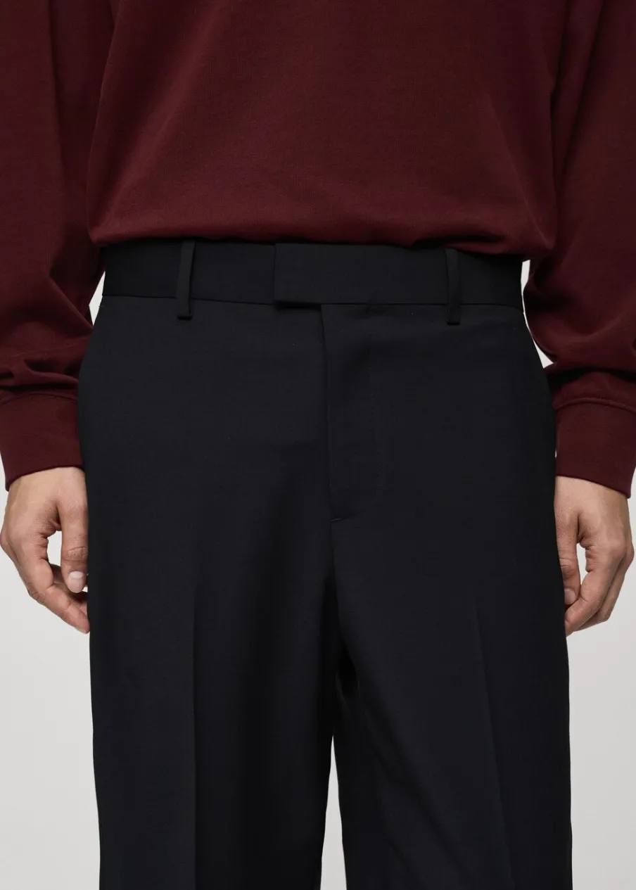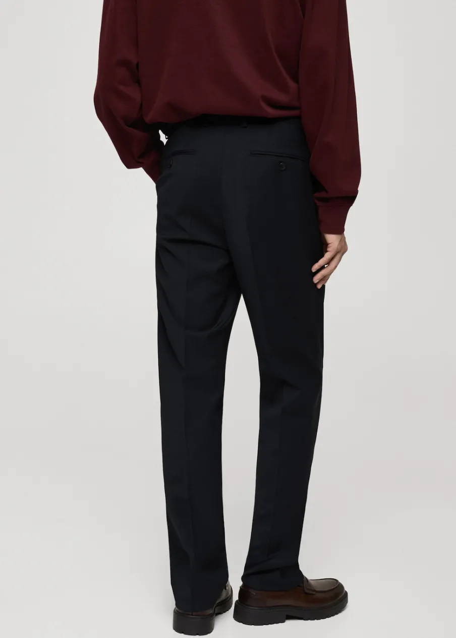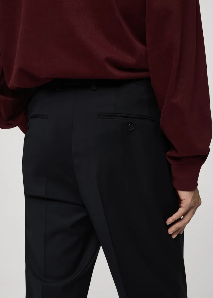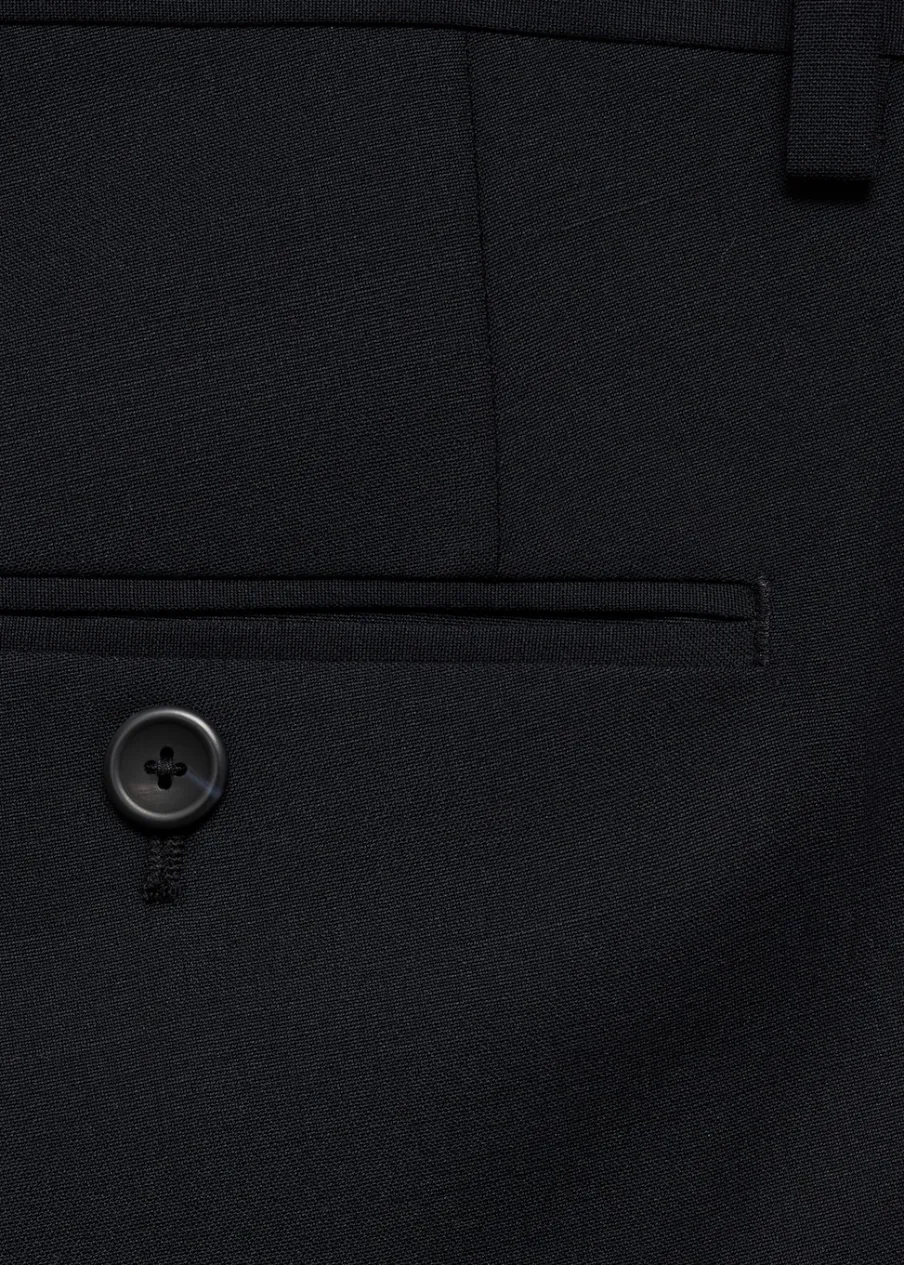 Krój regular. Tkanina mieszanka wełny. Szlufki na pasek. Dwie kieszenie boczne. Zapięcie z przodu na guzik, haftkę i zamek. Dwie wpuszczane kieszenie z guzikiem z tyłu. Prosty dół. Model ma 185 cm wzrostu i nosi rozmiar 42. Zaprasowany kant z przodu i z tyłu.