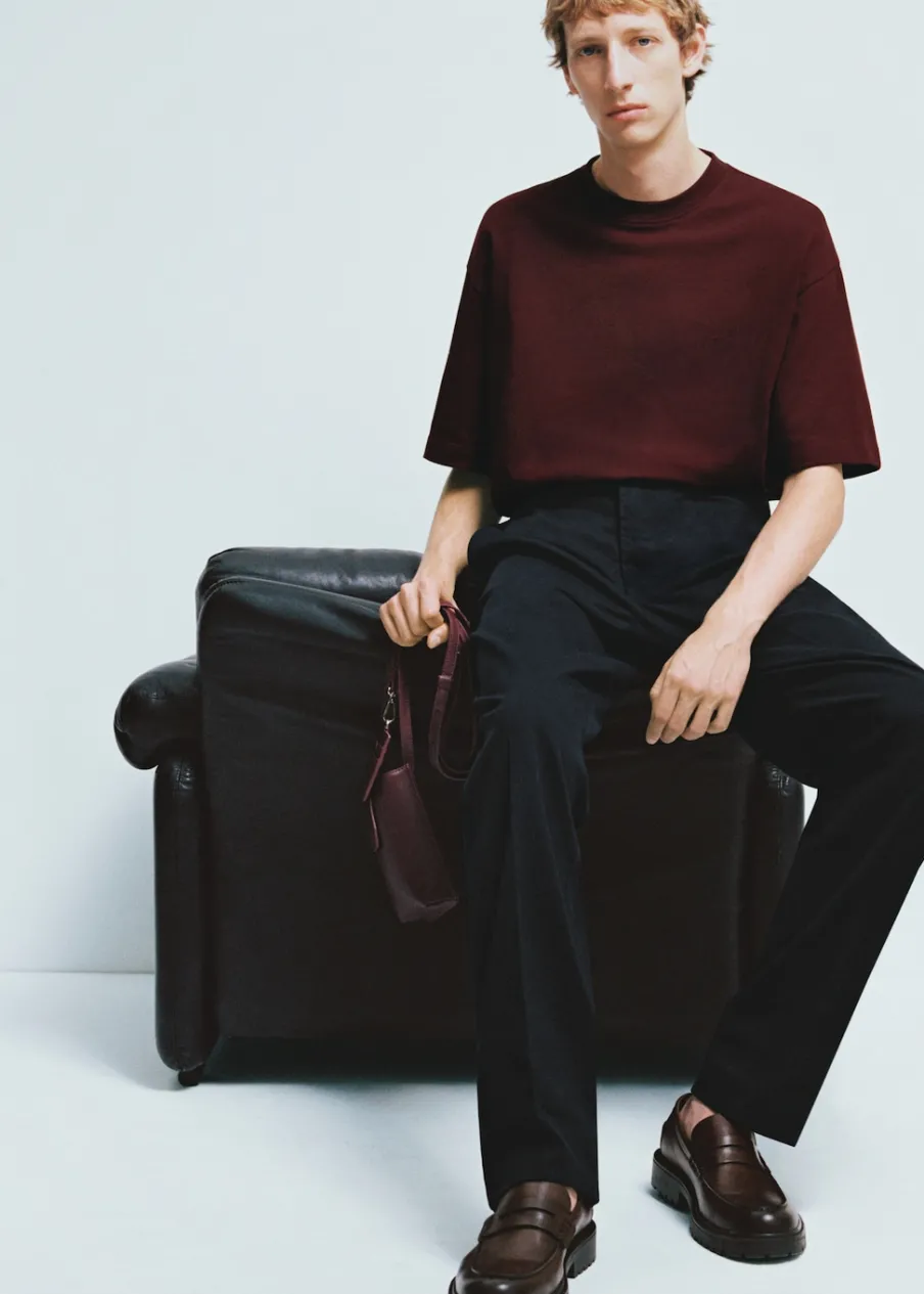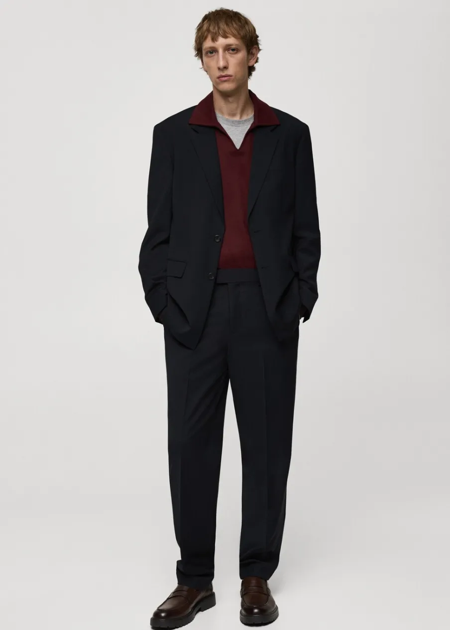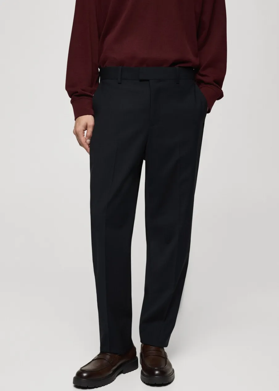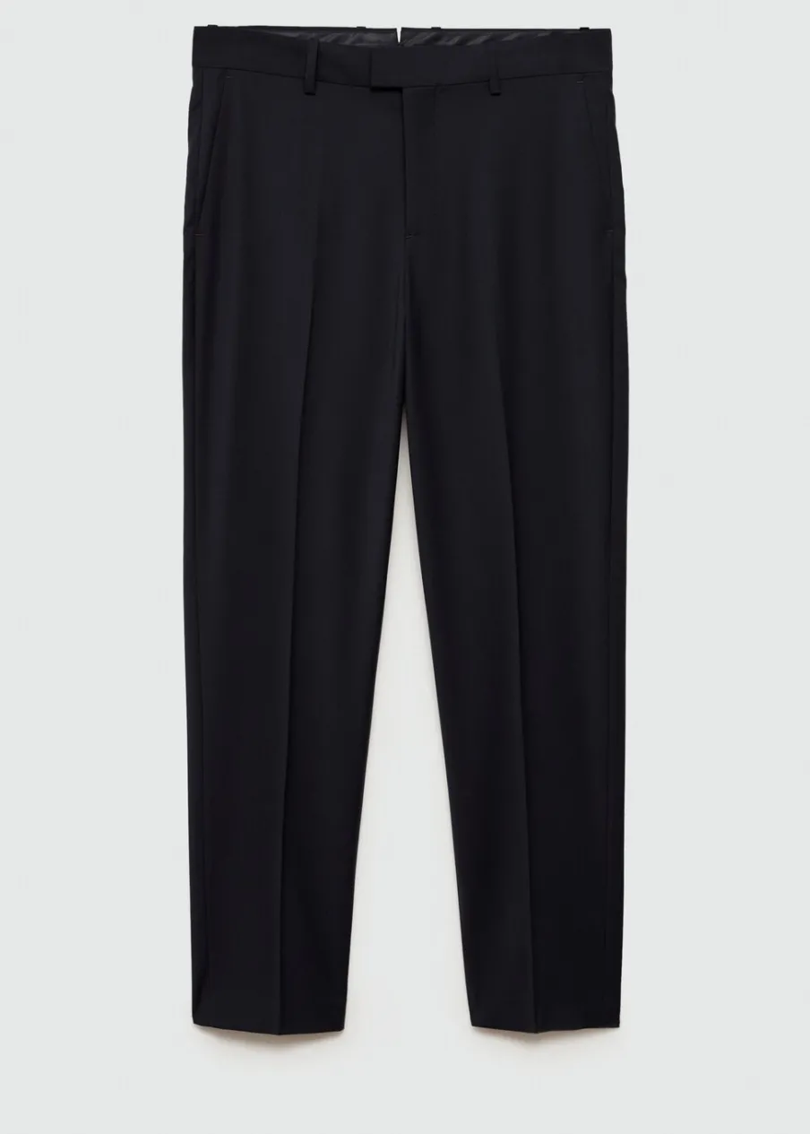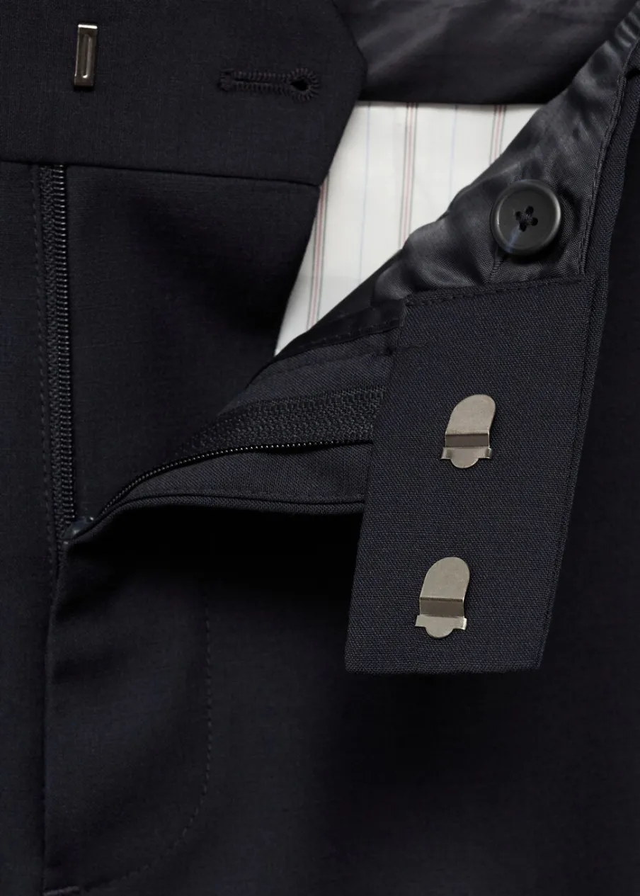 Krój regular. Tkanina mieszanka wełny. Szlufki na pasek. Dwie kieszenie boczne. Zapięcie z przodu na guzik, haftkę i zamek. Dwie wpuszczane kieszenie z guzikiem z tyłu. Prosty dół. Model ma 185 cm wzrostu i nosi rozmiar 42. Zaprasowany kant z przodu i z tyłu.