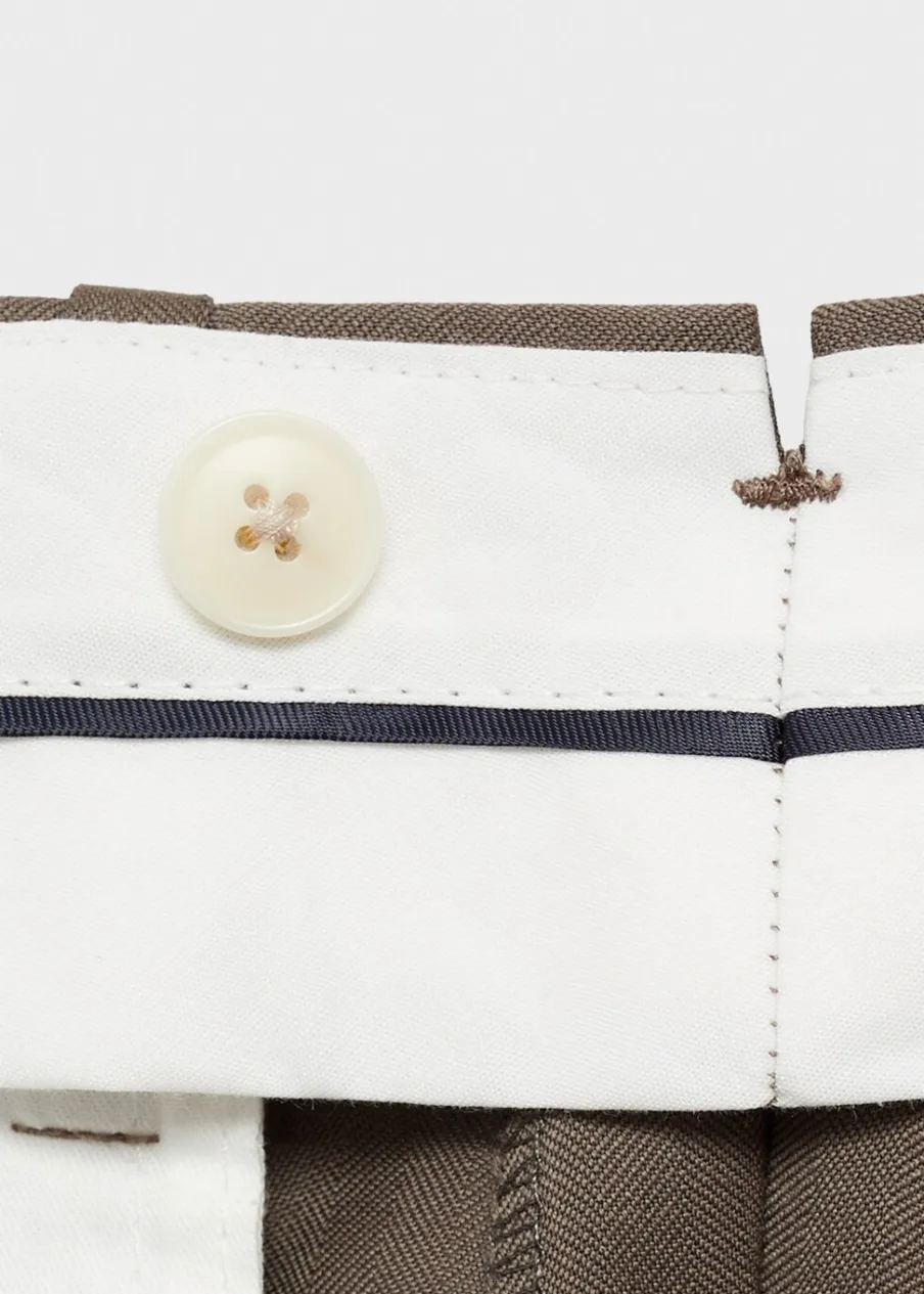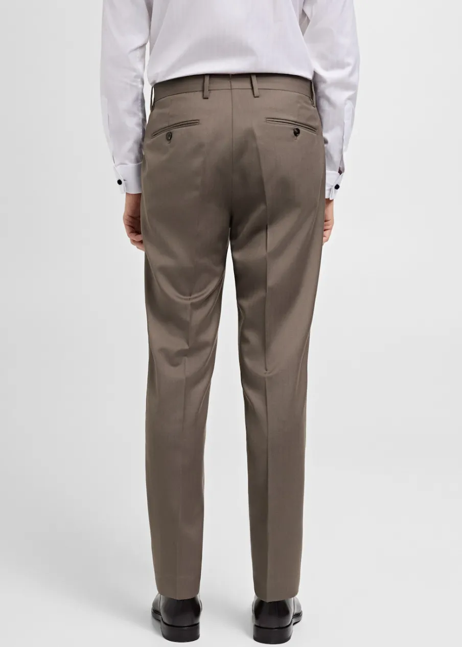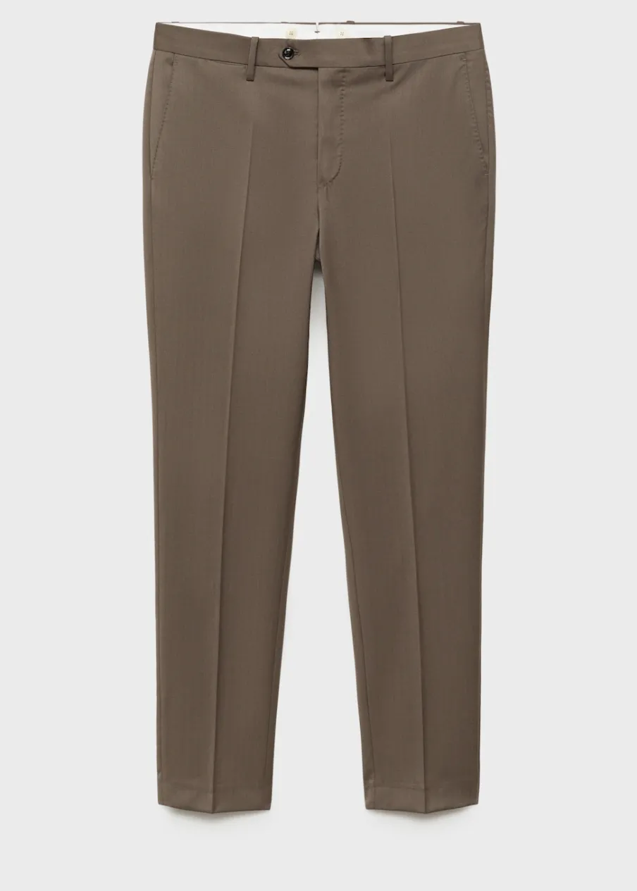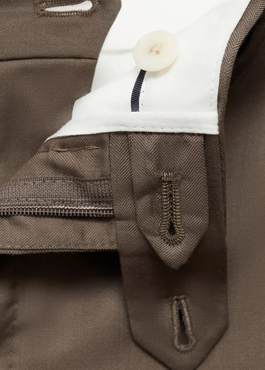 Slim-fit. Tkanina z 100% wełny dziewiczej. Struktura w jodełkę. Dwurzędowe zapięcie z przodu na guziki i zamek. Szlufki na pasek. Zaprasowany kant z przodu i z tyłu. Kieszonka biletowa. Guziki na szelki po wewnętrznej stronie pasa. Dwie kieszenie boczne. Dwie wpuszczane kieszenie z guzikiem z tyłu. Model ma 190 cm wzrostu i nosi rozmiar 42.