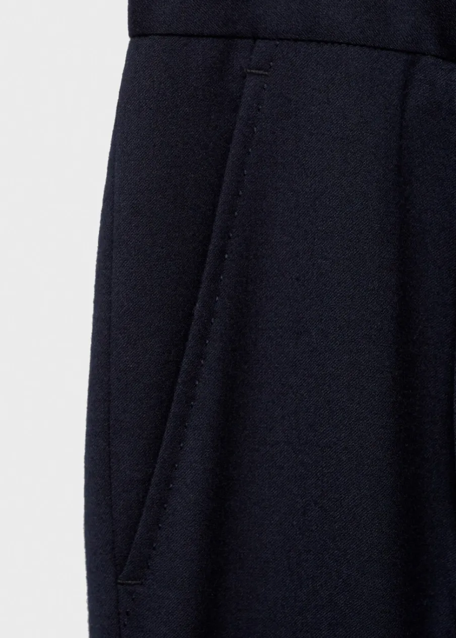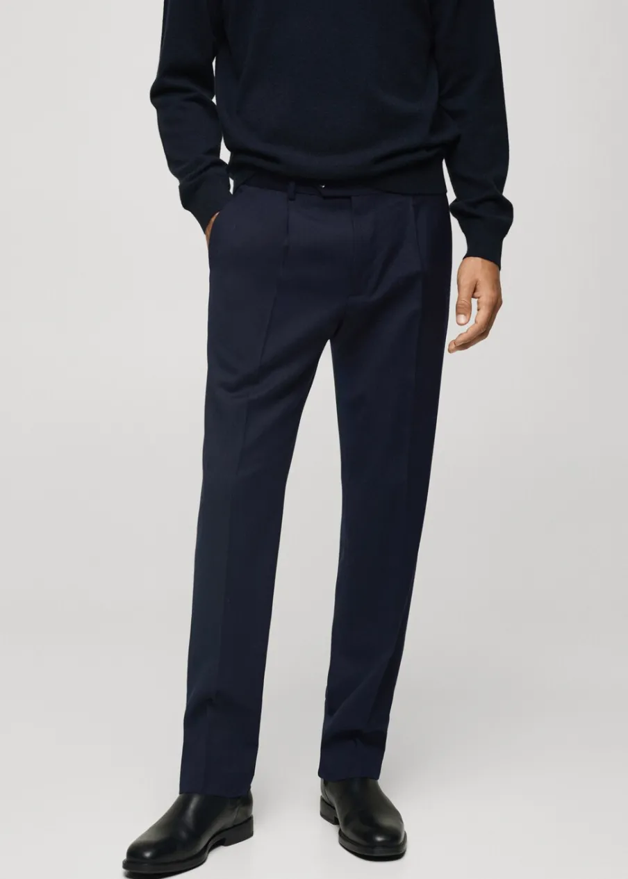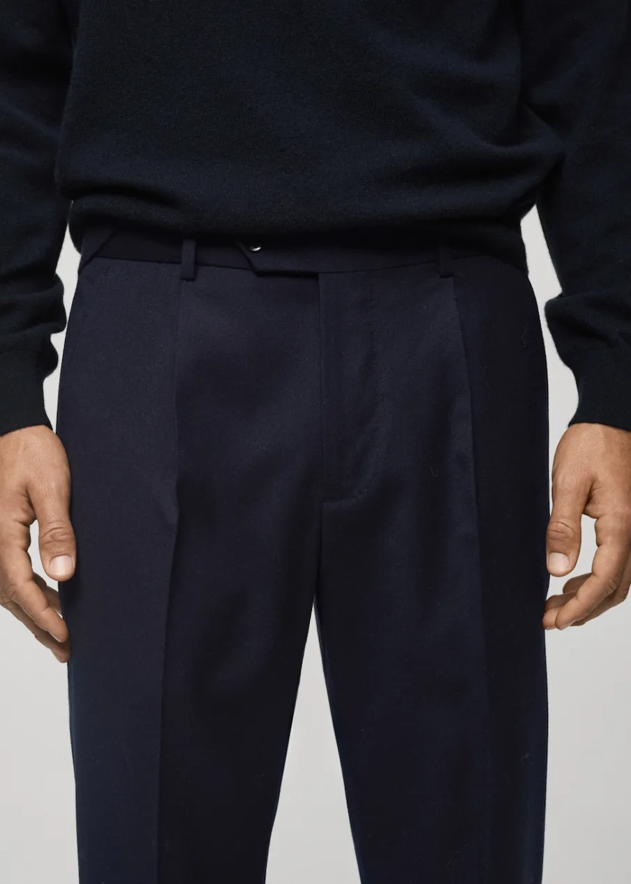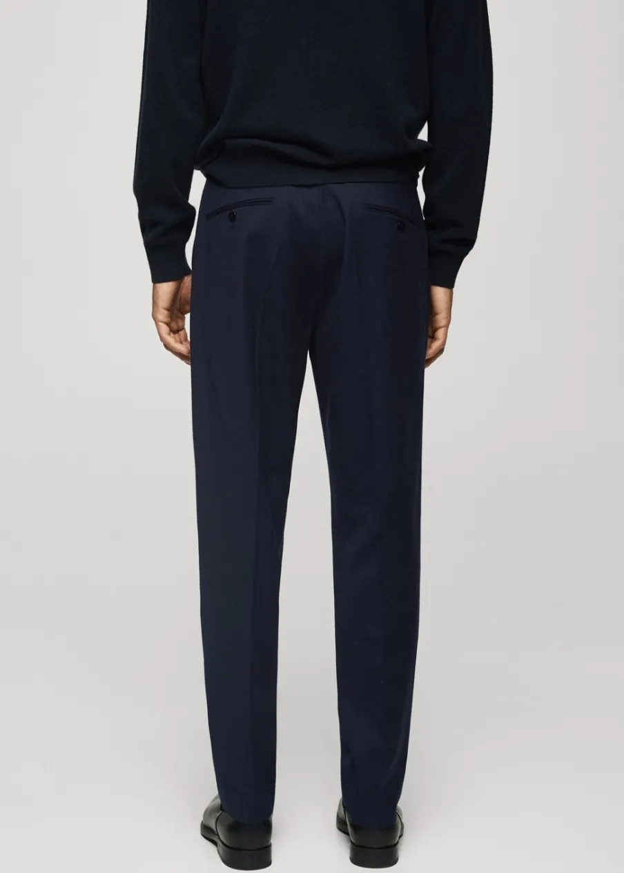 Kolekcja Selection. Tkanina w 100% z wełny dziewiczej. Slim-fit. Zakładki z przodu. Zaprasowany kant z przodu i z tyłu. Szlufki na pasek. Dwie wpuszczane kieszenie boczne. Dwie wpuszczane kieszenie z guzikiem z tyłu. Model ma 185 cm wzrostu i nosi rozmiar 42. Zapięcie z przodu na guzik, haftkę i zamek. Kieszeń na bilon.