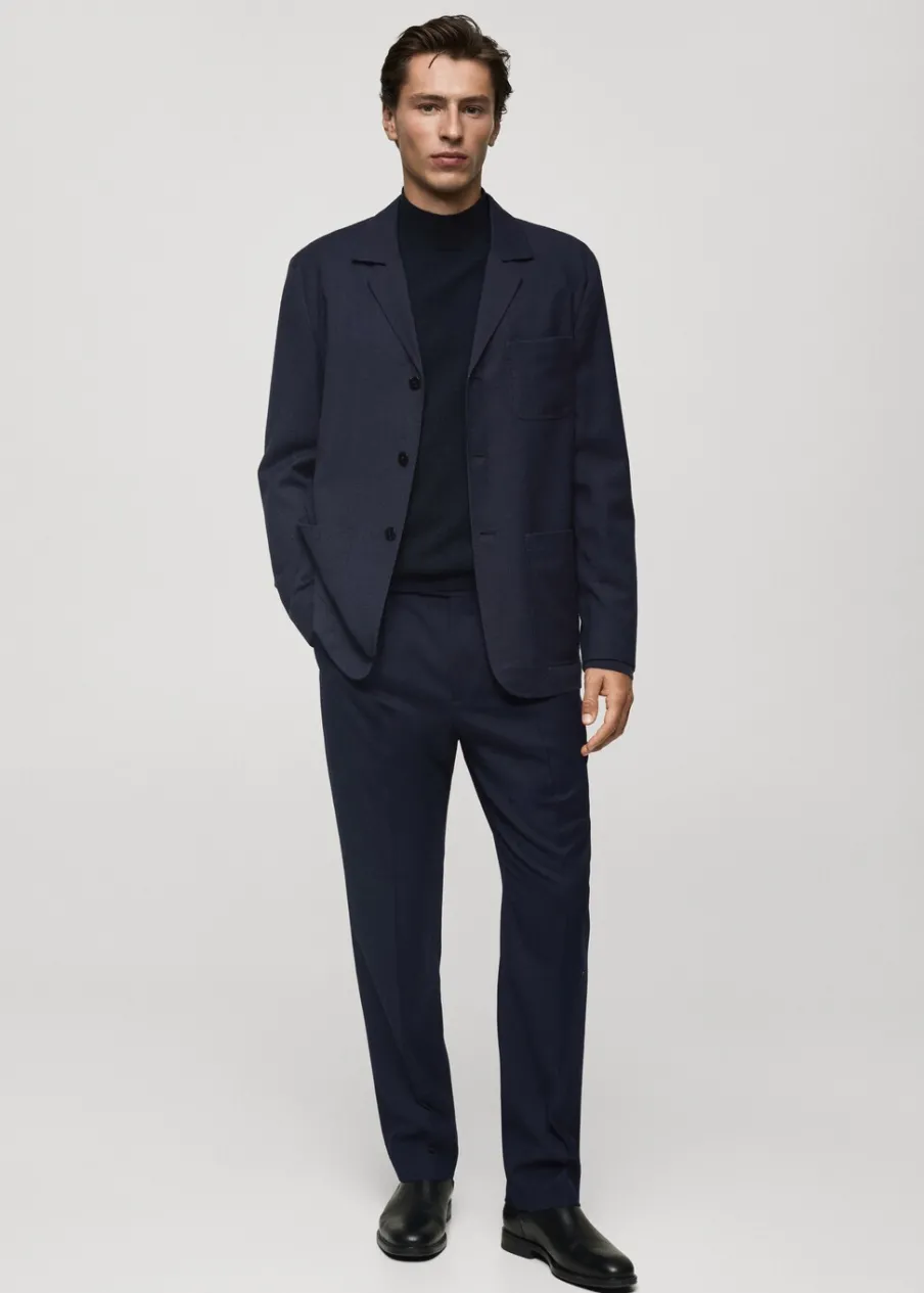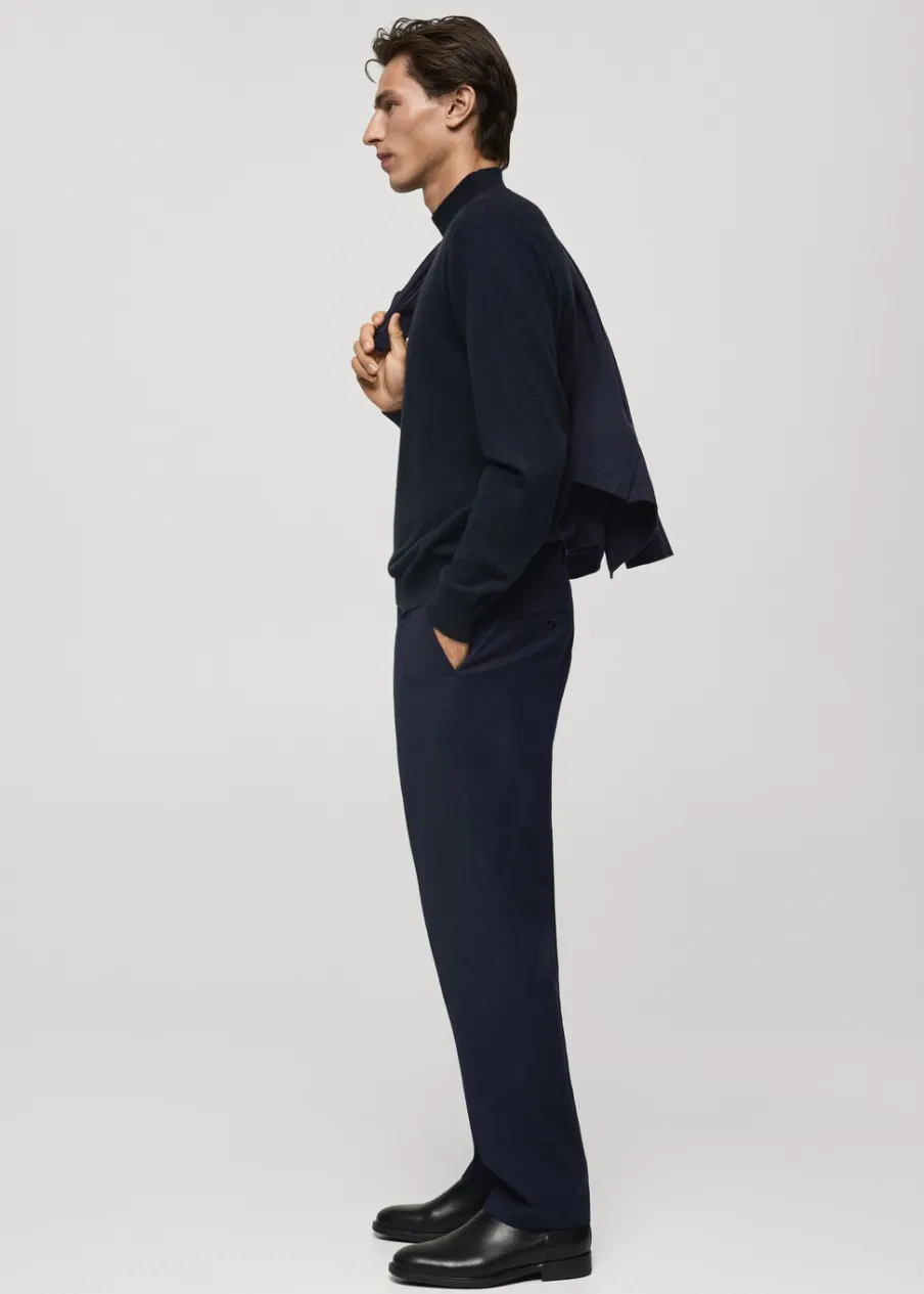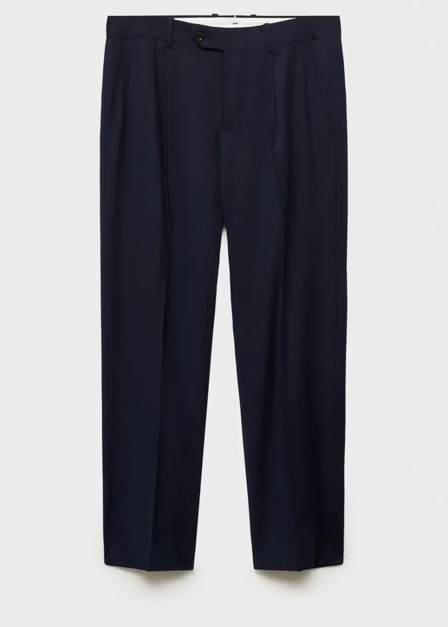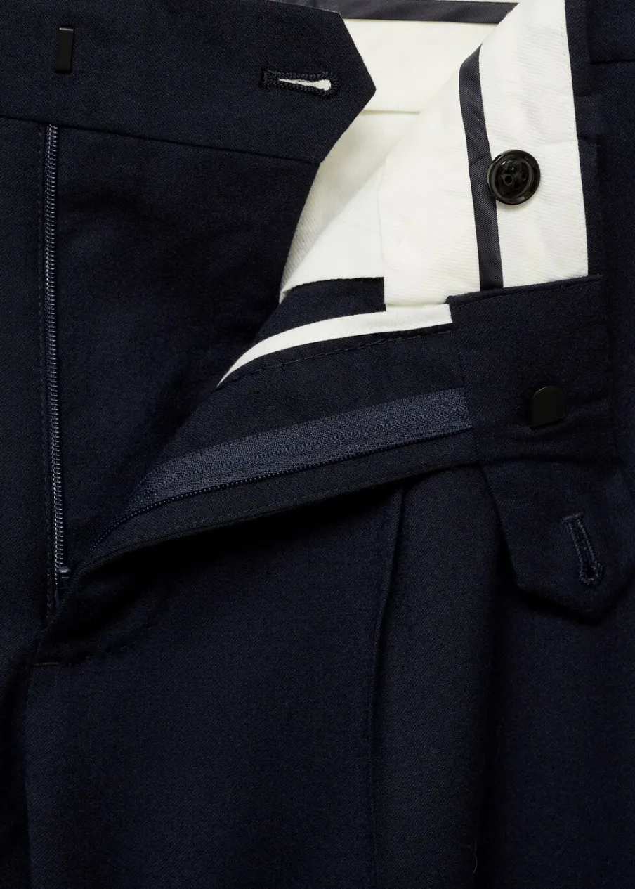 Kolekcja Selection. Tkanina w 100% z wełny dziewiczej. Slim-fit. Zakładki z przodu. Zaprasowany kant z przodu i z tyłu. Szlufki na pasek. Dwie wpuszczane kieszenie boczne. Dwie wpuszczane kieszenie z guzikiem z tyłu. Model ma 185 cm wzrostu i nosi rozmiar 42. Zapięcie z przodu na guzik, haftkę i zamek. Kieszeń na bilon.
